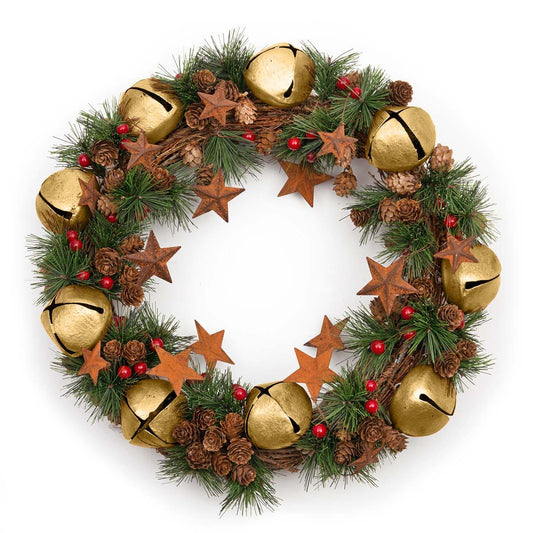 Jingle Bell Wreath - 40cm, Gold Bells, Stars, Pinecones, and Red Berries