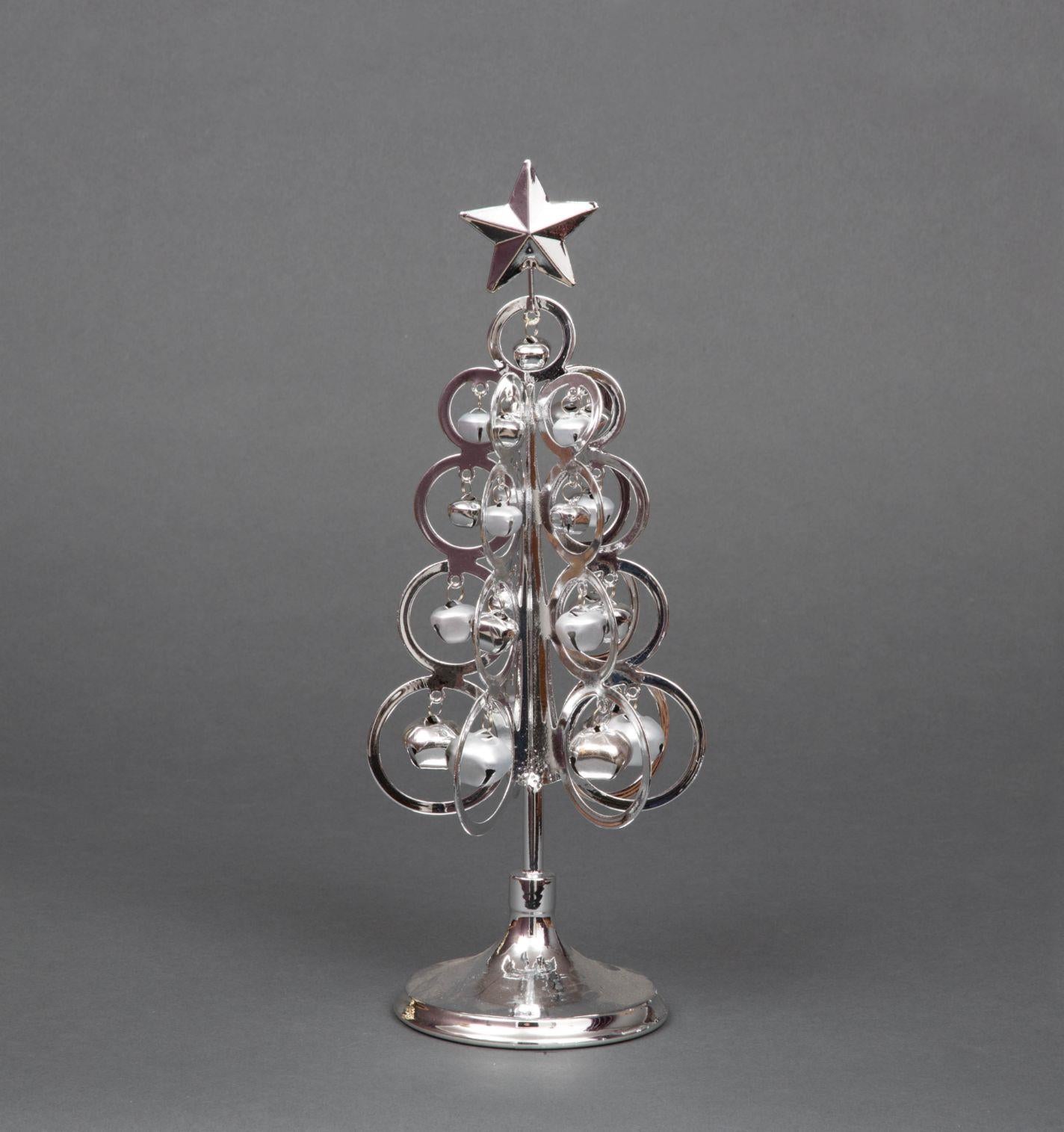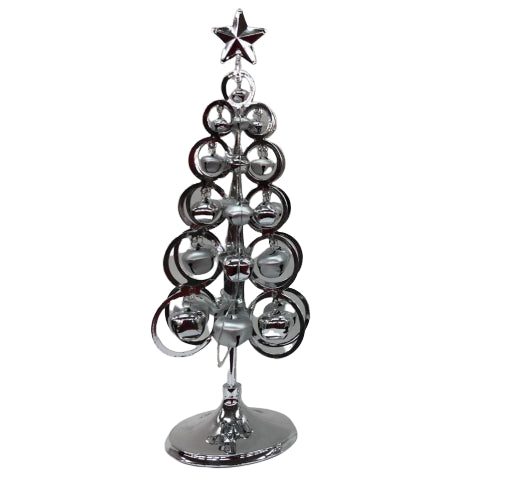 - Size: Approx. 25 cm Material: Best Quality Metal Decorated With Stars, Rings, and Bells Table Top Silver Christmas Tree for home office decoration