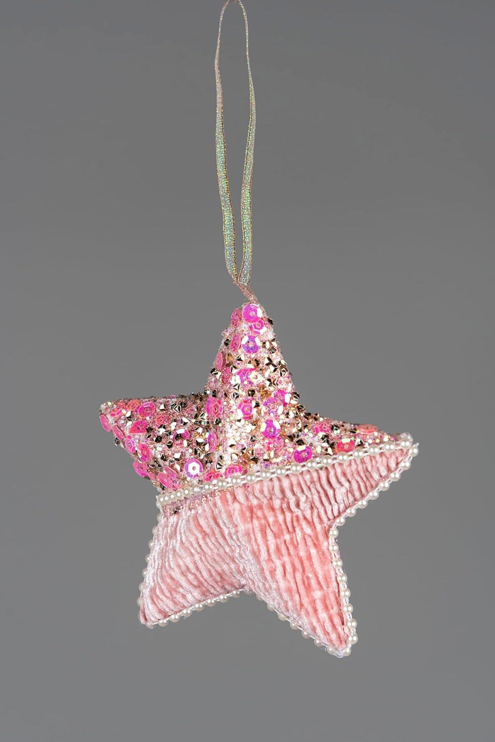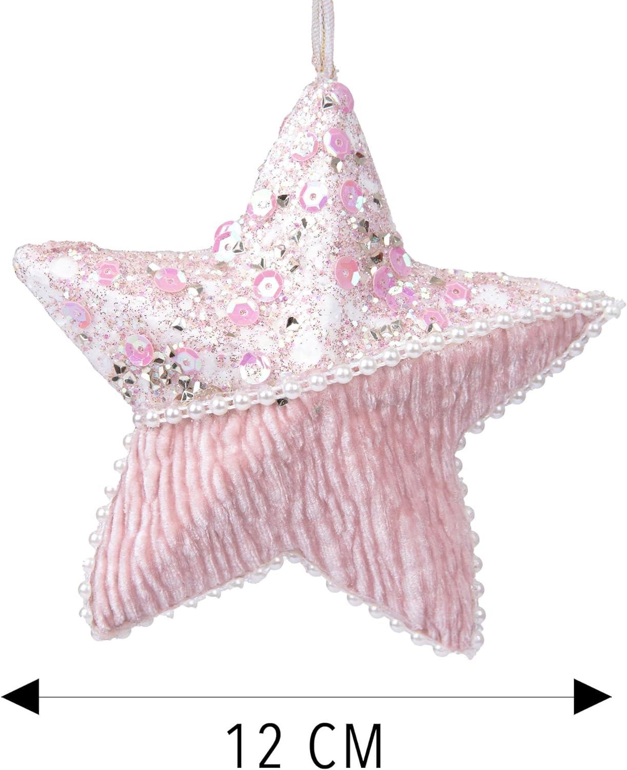 - Crafted with meticulous attention to detail, this hanging decoration is a star measuring 12cm. The surface is covered with a delightful shade of pink and sequin catches and reflects the light, creating a shimmering and magical effect.