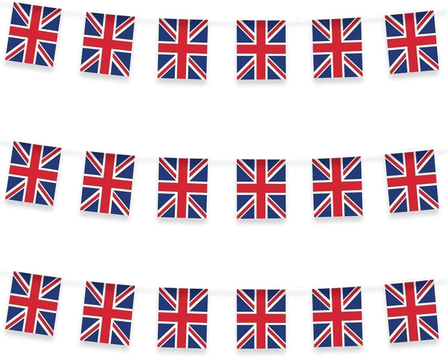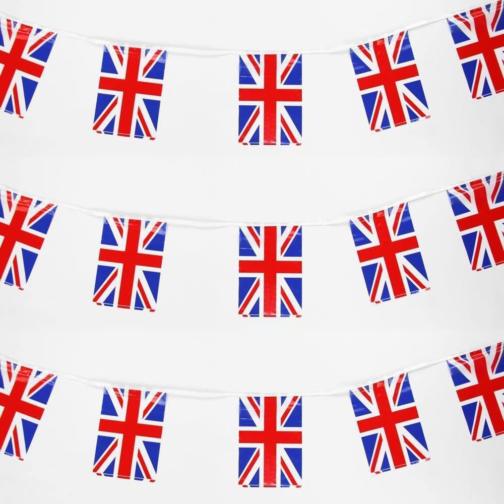 - Actual length 12 Feet/3.6 Meters with 11 pieces union jack flags Flags Size 30cm x 20cm Perfect decorations for Bar Party Events Sports Clubs Restaurant Supermarket and more Decoration for any Patriotic Themed events or royal parties national celebration events 70th Anniversary Street Party and Queen's Platinum Jubilee 2022 Strong Plastic/Stitched construction.