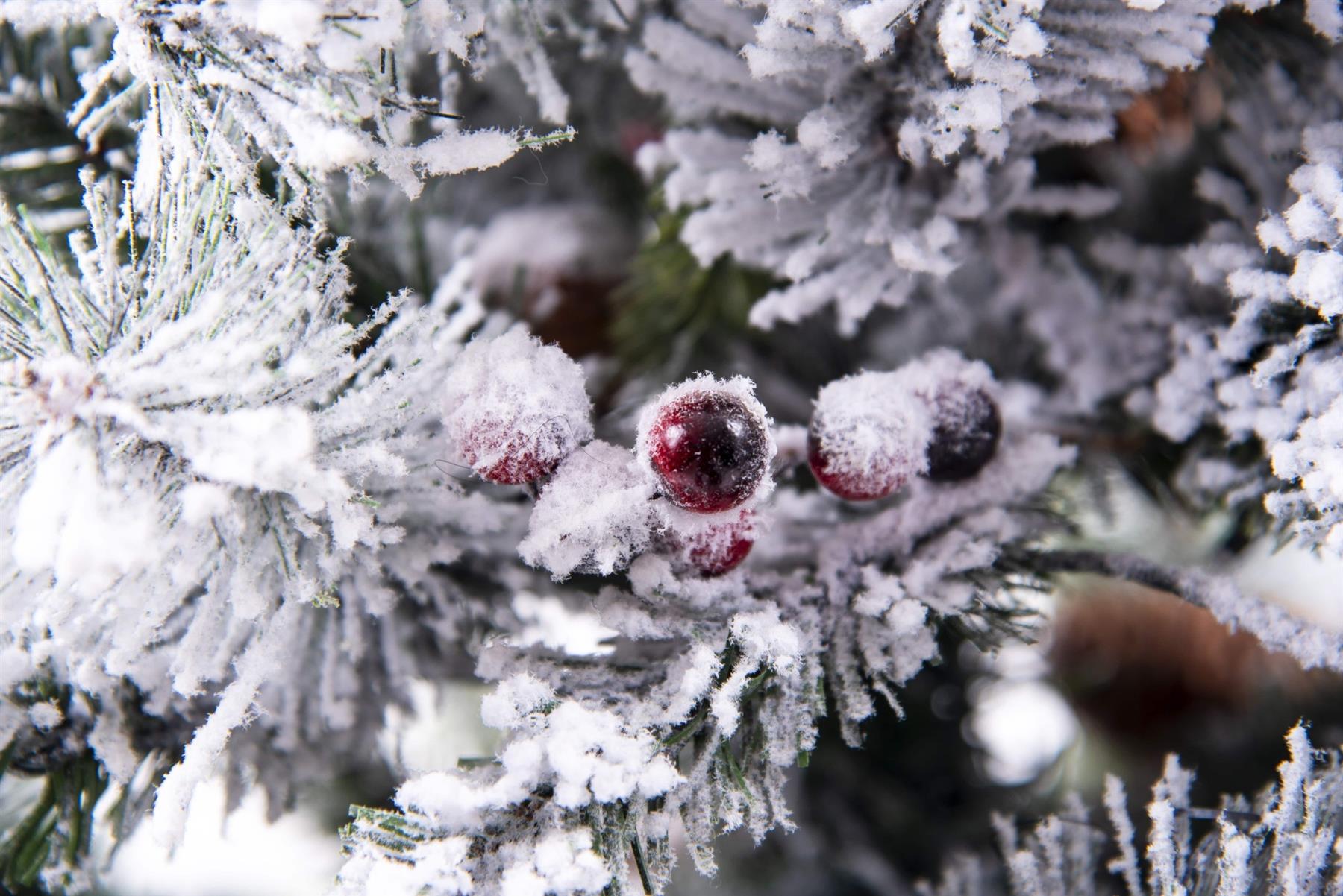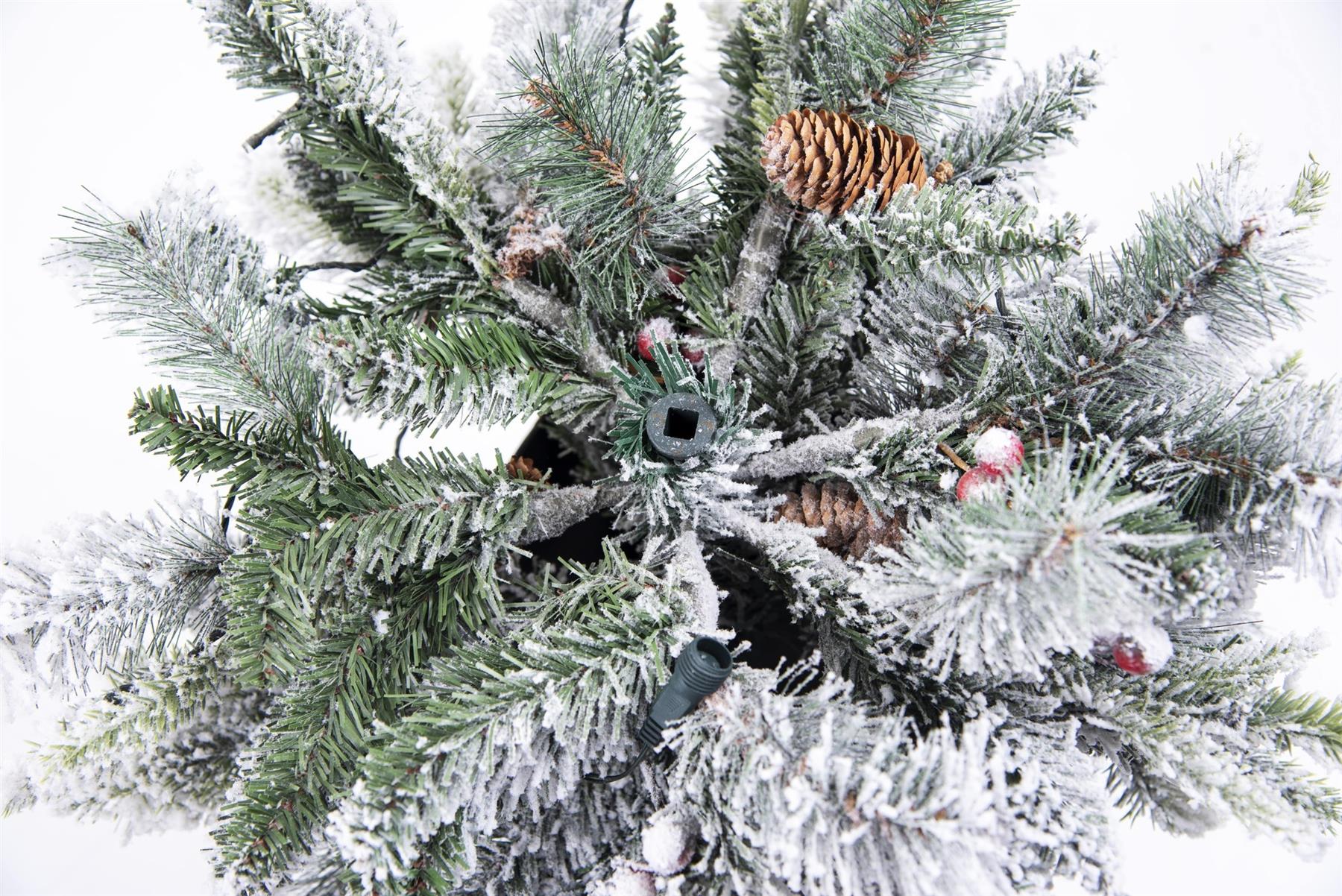 - The leafy branch tips are covered with thick snow powder, simulating the sense of wintry Christmas, and several pine cones and red berries make the tree full of attractiveness.