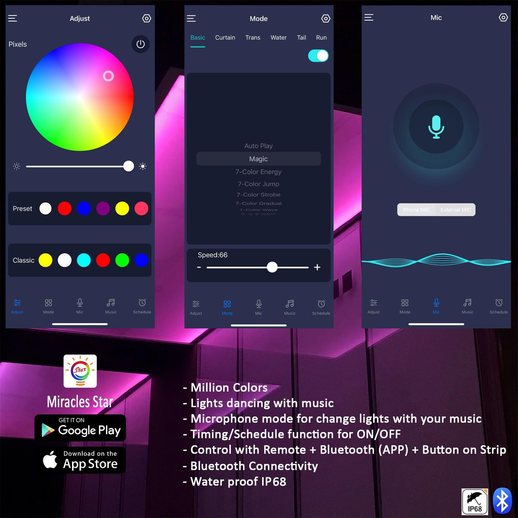 - IP44 Waterproof and 210+ color running modes and 250+ music sync modes, all in one with Remote control LED Lights make them perfect for outdoor, and home decoration.