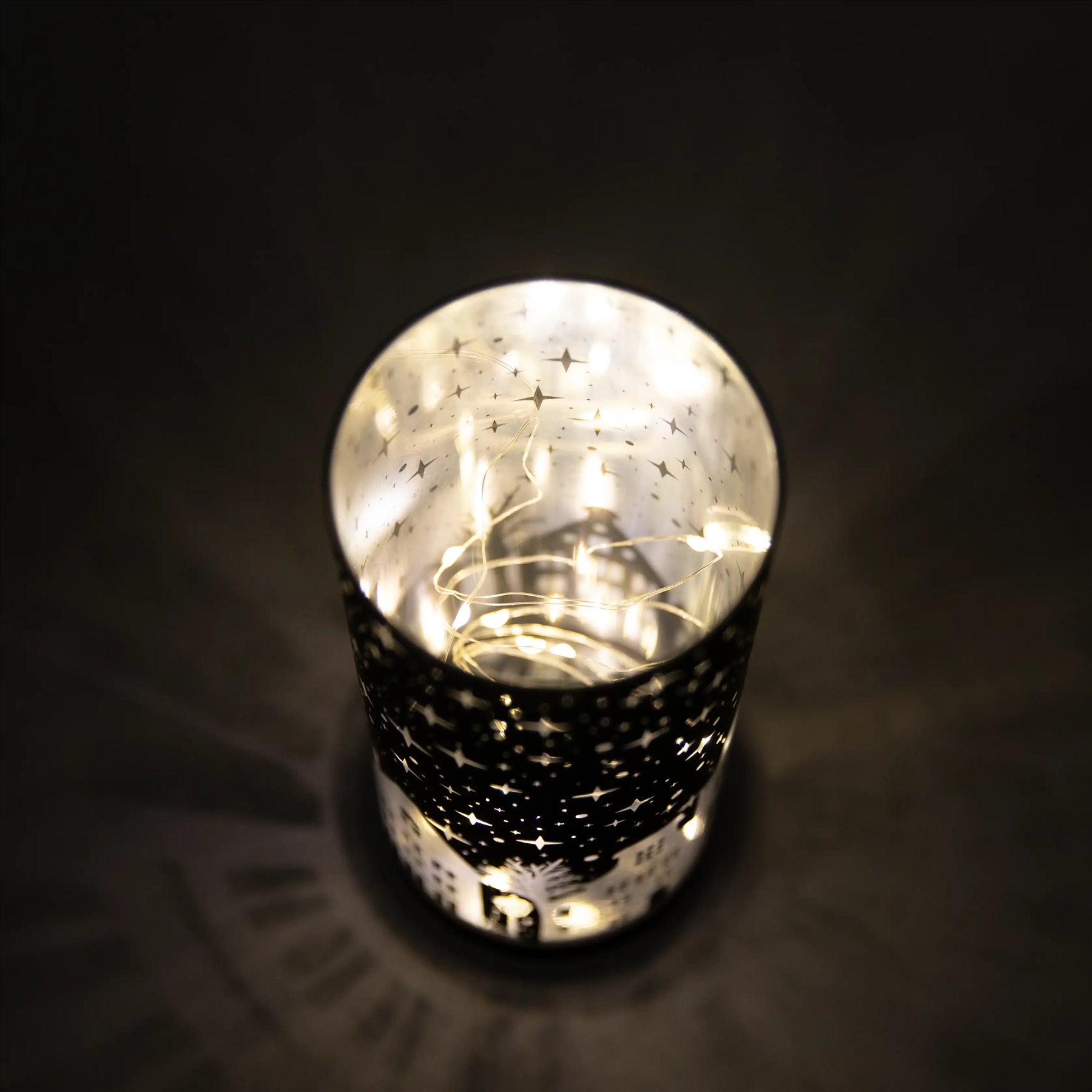 - When switched on, the warm glow shines through the etched glass, highlighting the pattern.