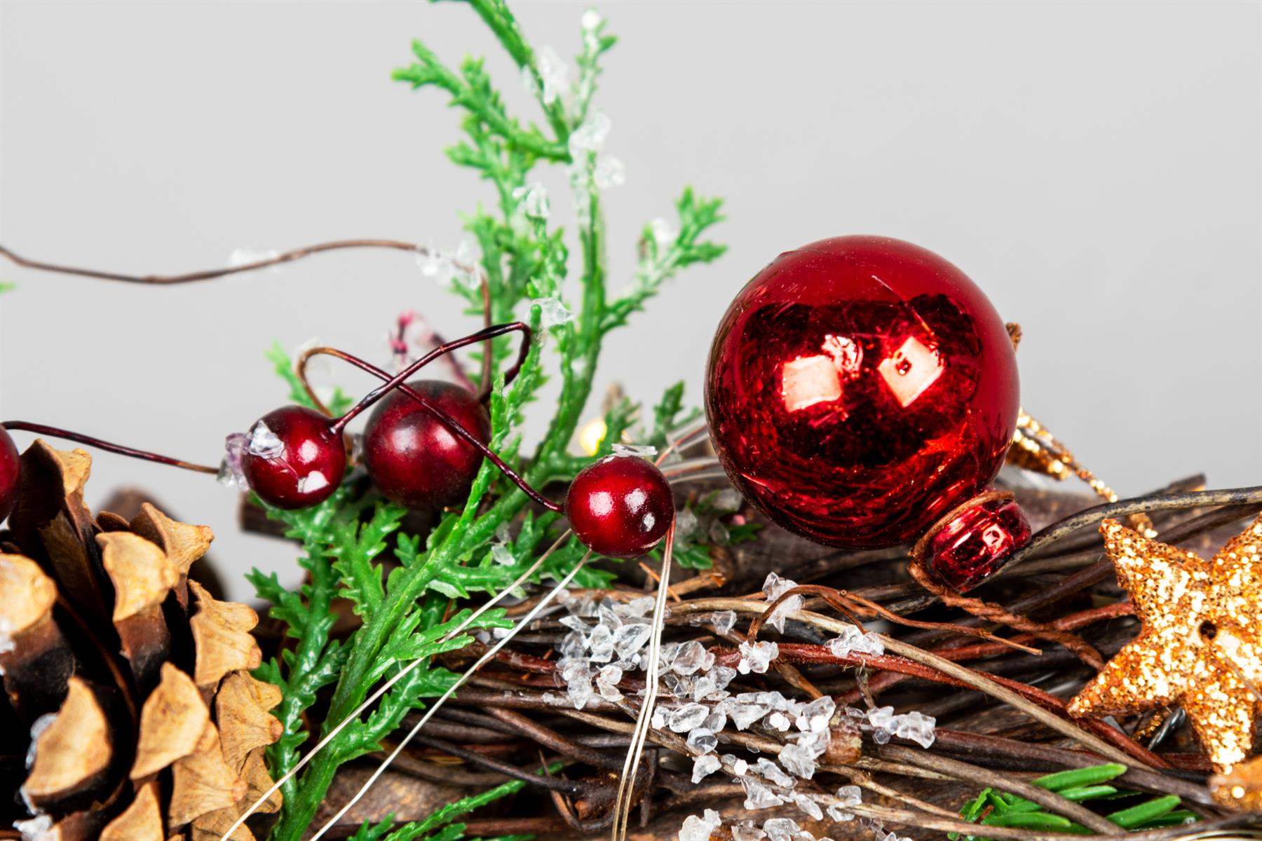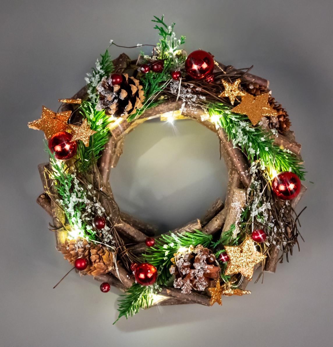 - Decorated with Warm White LED Lights vibrant red baubles, red berries, shimmering bronze stars, green foliage, and rustic pine cones, bringing the festive spirit to life.