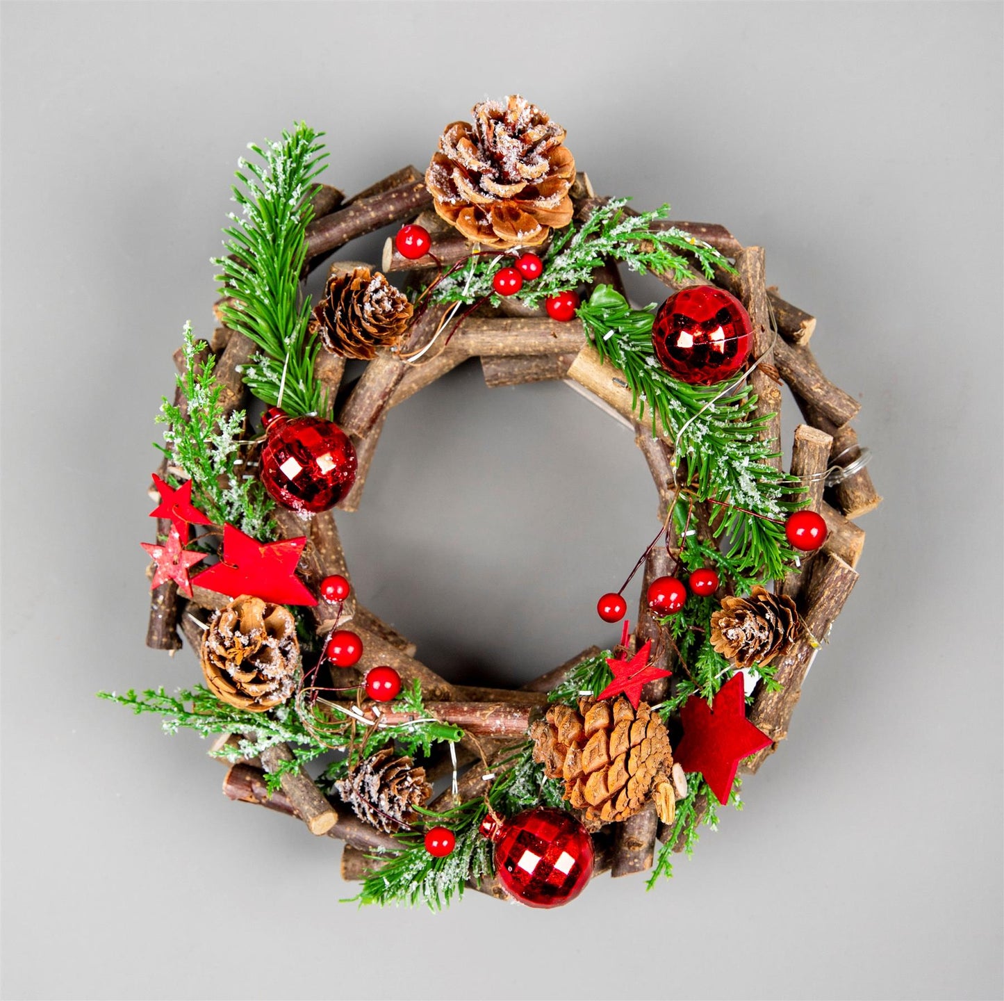 - Decorated with Warm White LED Lights vibrant red baubles, berries, stars, green foliage, and rustic pine cones, bringing the festive spirit to life.