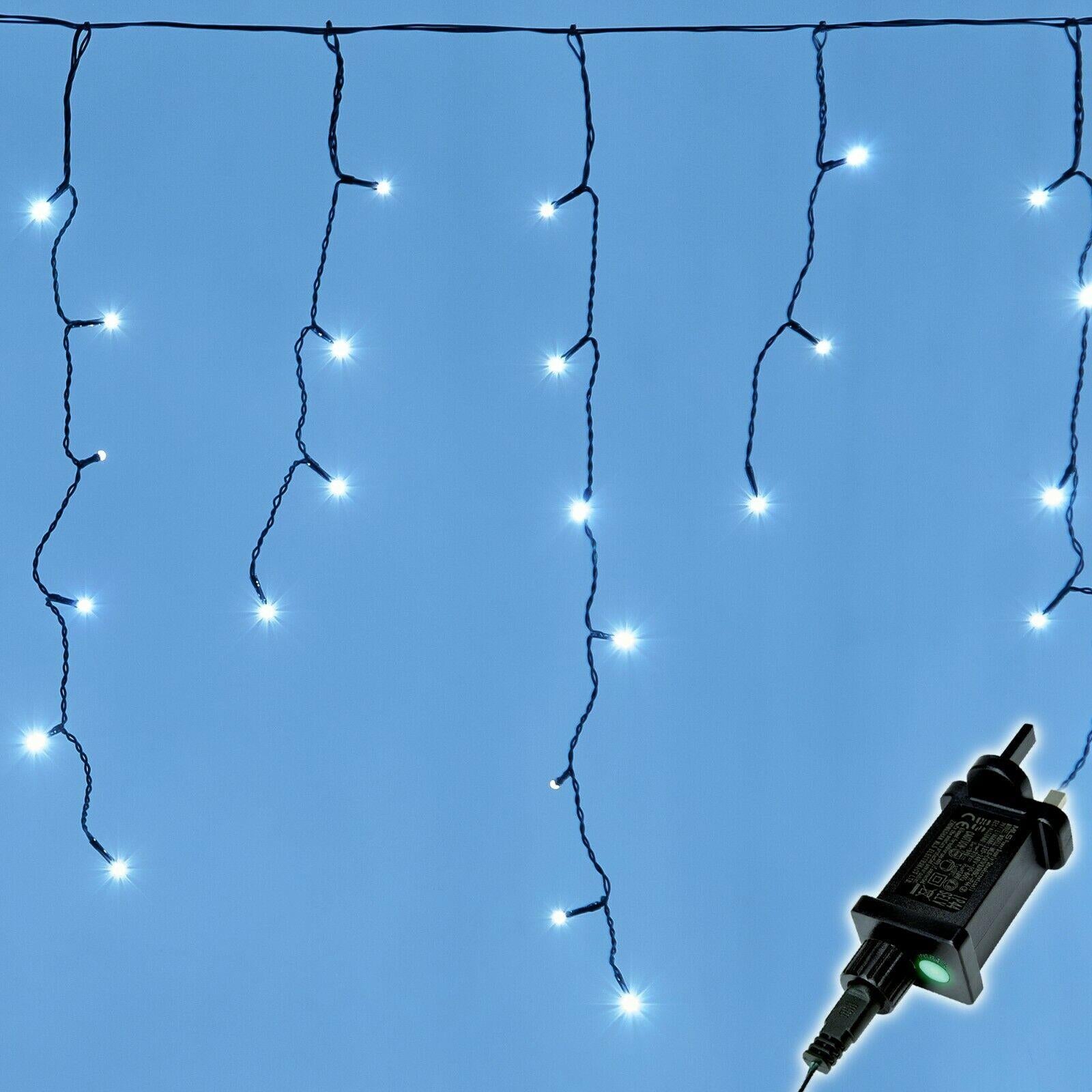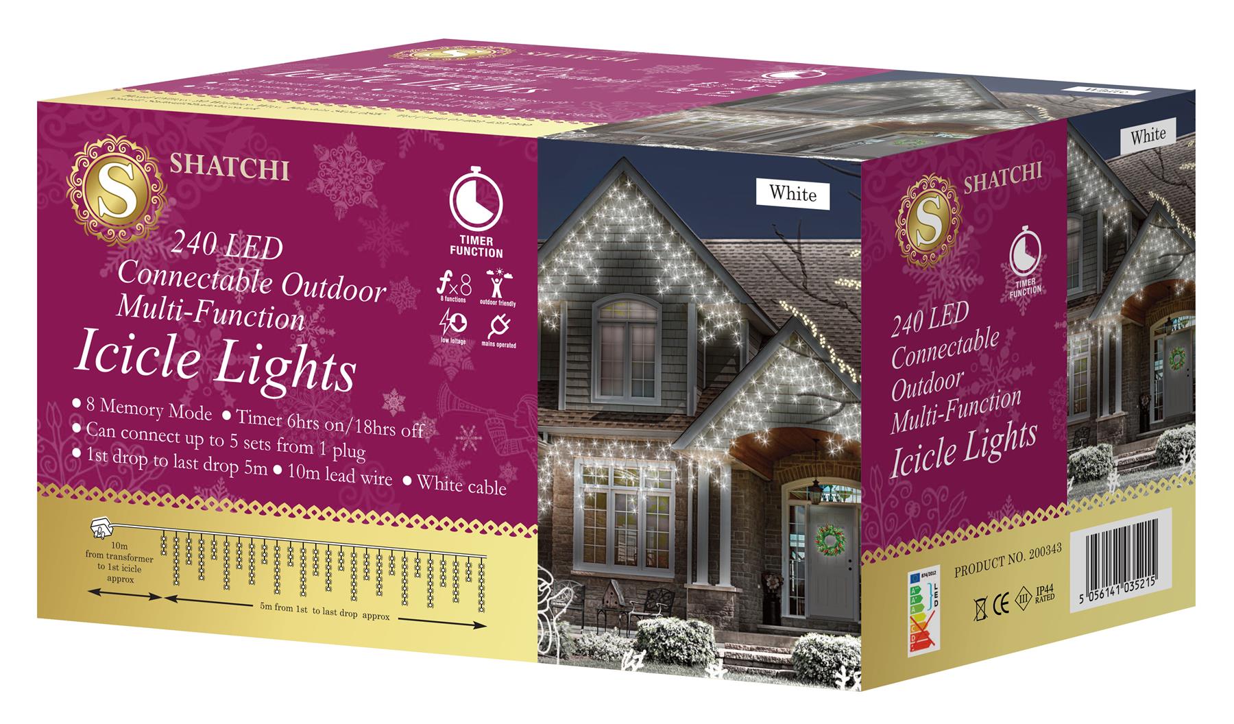 - CONNECTIBLE: Icicle Christmas lights measure 15m (10m Lead Wire + 5m first drop to last drop), Cable Colour: Clear, LED Count: 240 Cool White LEDs. Can connect up to 8 sets from 1 plug. UK plug operated.