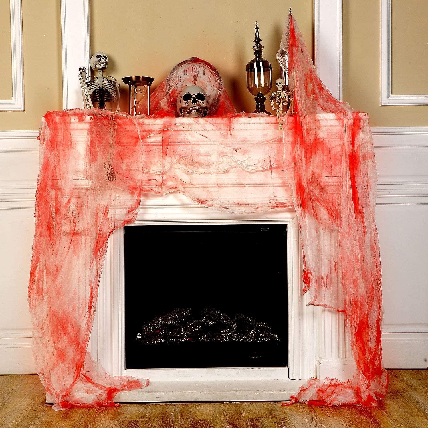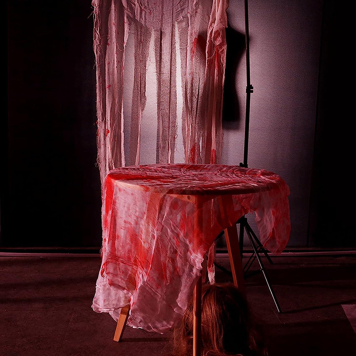 - The Bloody Gauze Table Cover creates a macabre atmosphere, featuring white gauze with drops, streaks, and patches of fake blood. This gruesome design adds an extra layer of horror to your Halloween decorations, making it an ideal prop for haunted houses, Halloween parties, and spooky-themed events.
