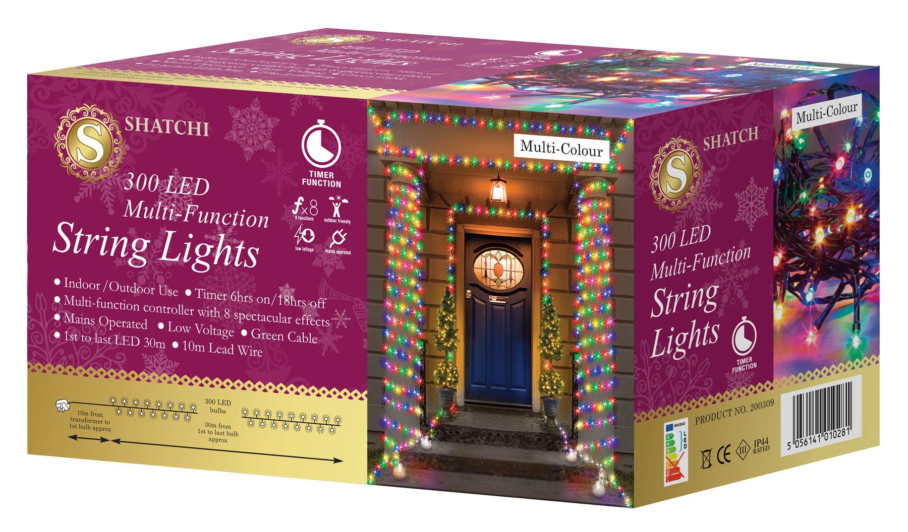 - Cable Colour: Green, Bulb Colour: Multicolour, Length from 1st to last bulb: 30m, lead wire: 5m. Safe and reliable: Input Voltage: 220-240V AC. Output Voltage: 31V DC. Low voltage LED bulbs not only help protect family and pets from the risk of electric shock and fire but also make a huge saving from your electricity bill. Principal certification: CE; RoHS; IP44.