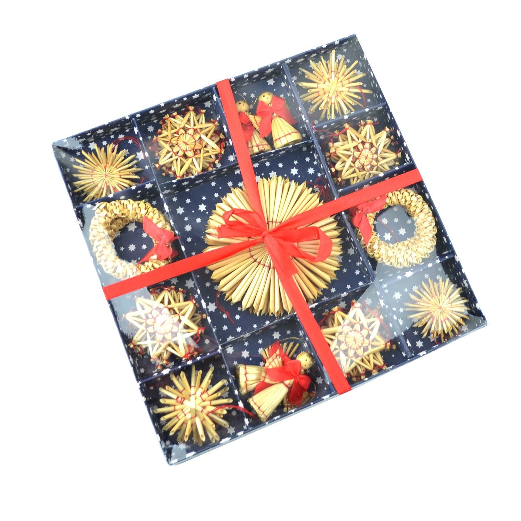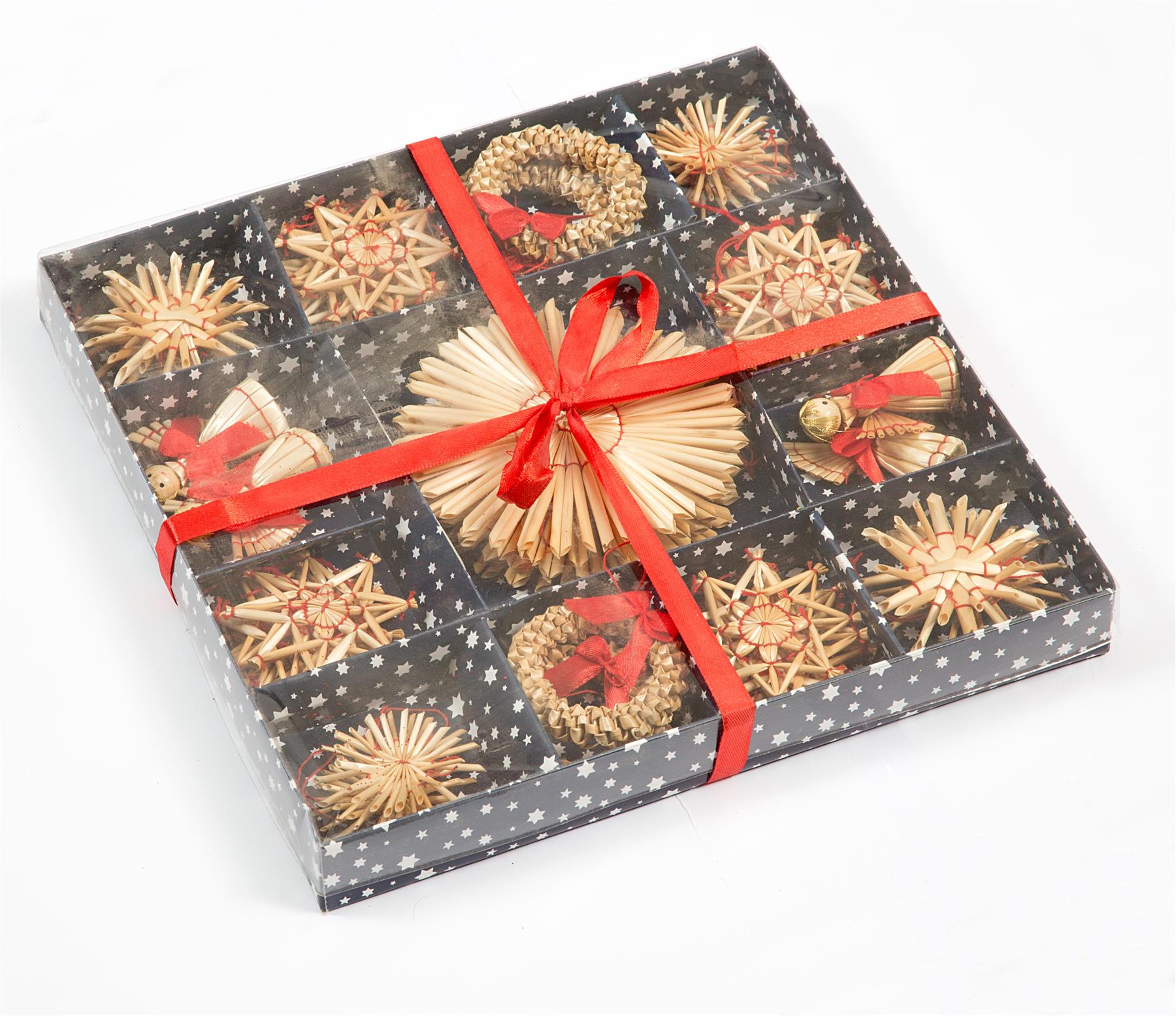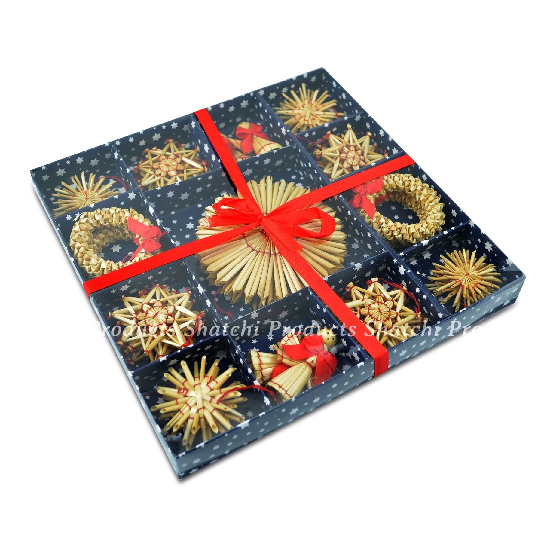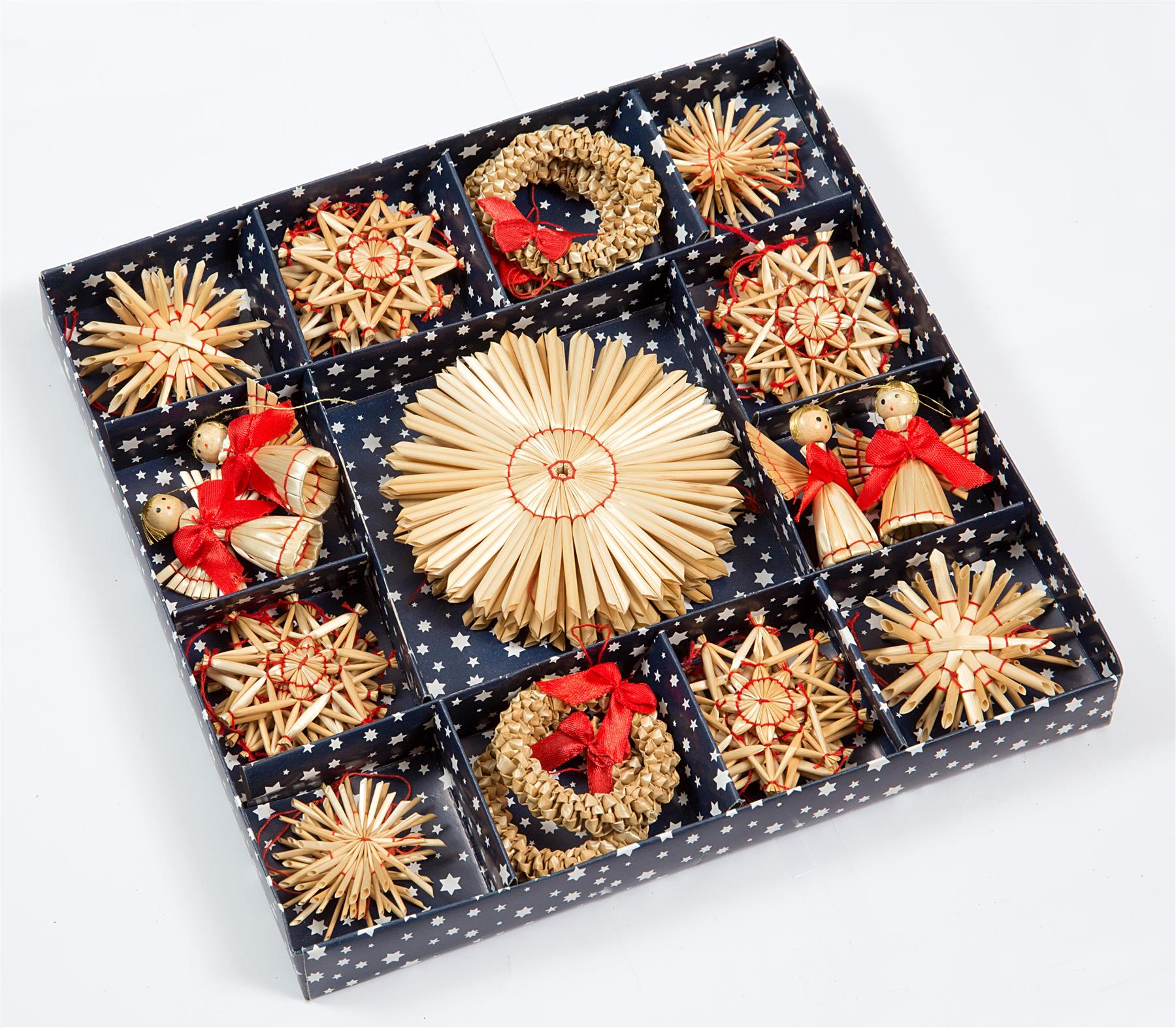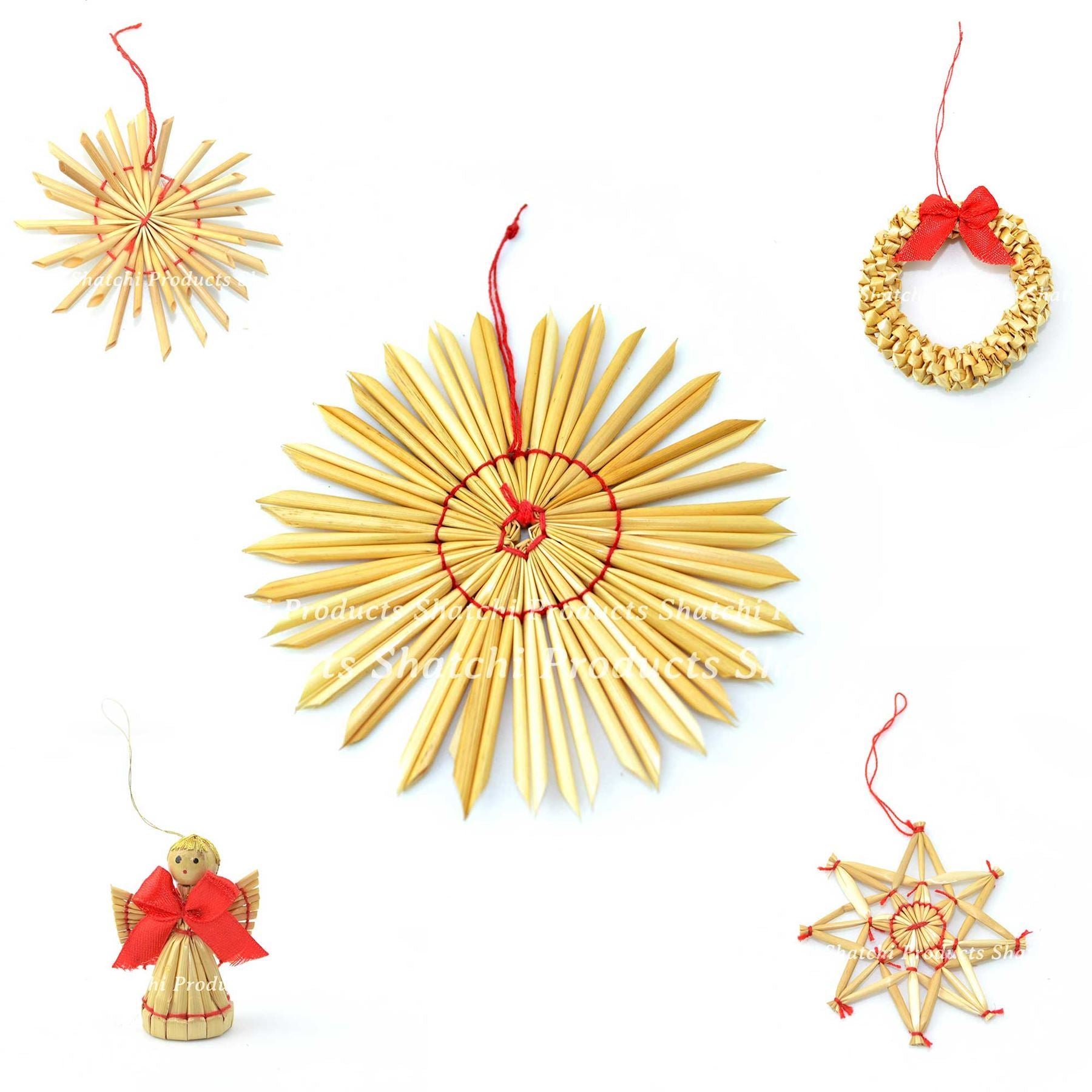 - Beautifully hand-crafted decorations made from natural wheat straw with red decor.