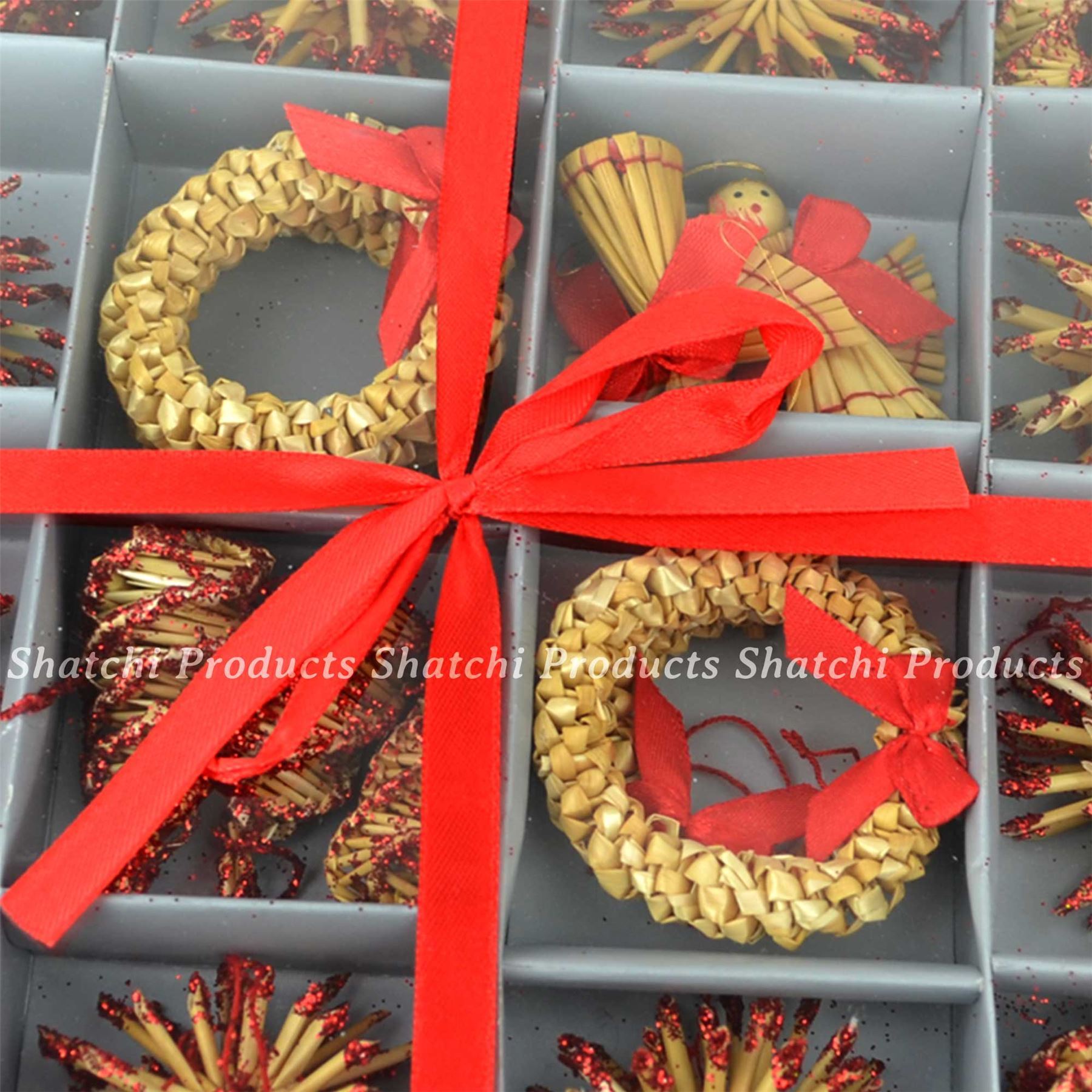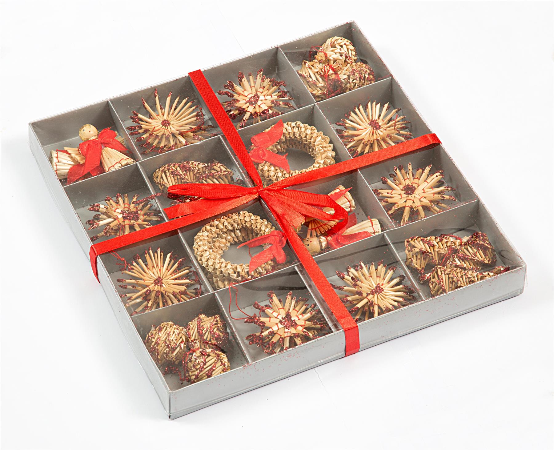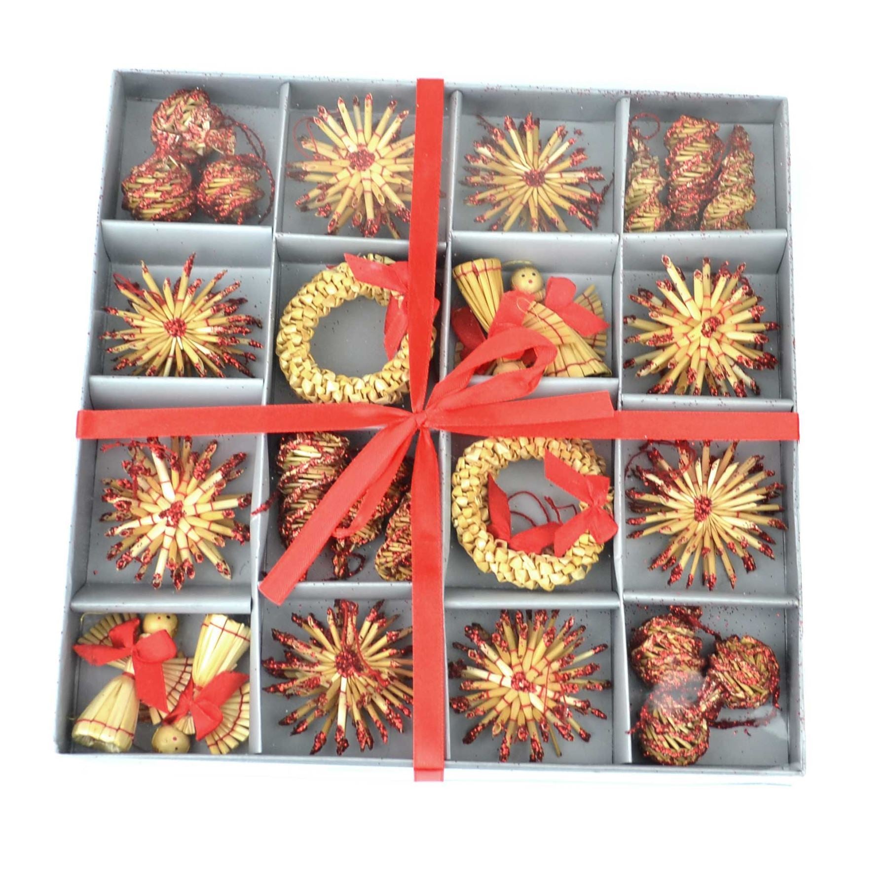 - Beautifully hand-crafted decorations made from natural wheat straw with red decor.