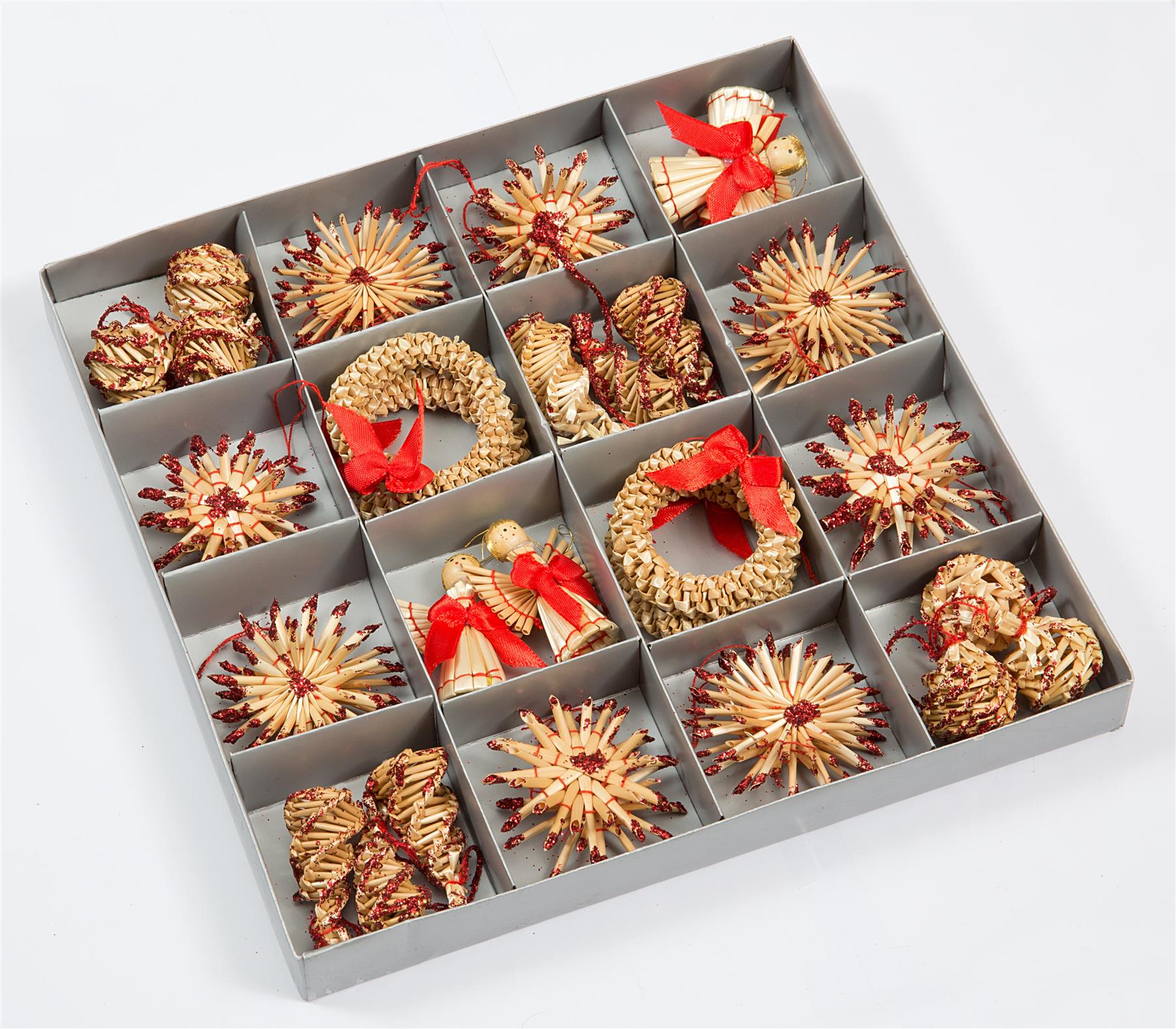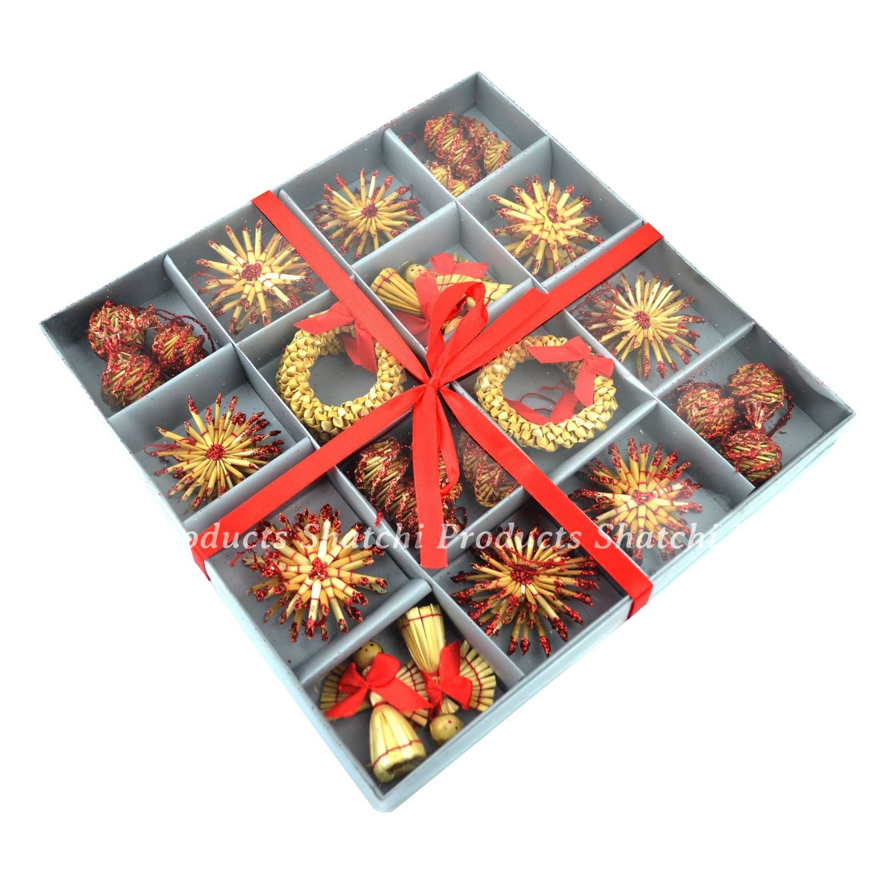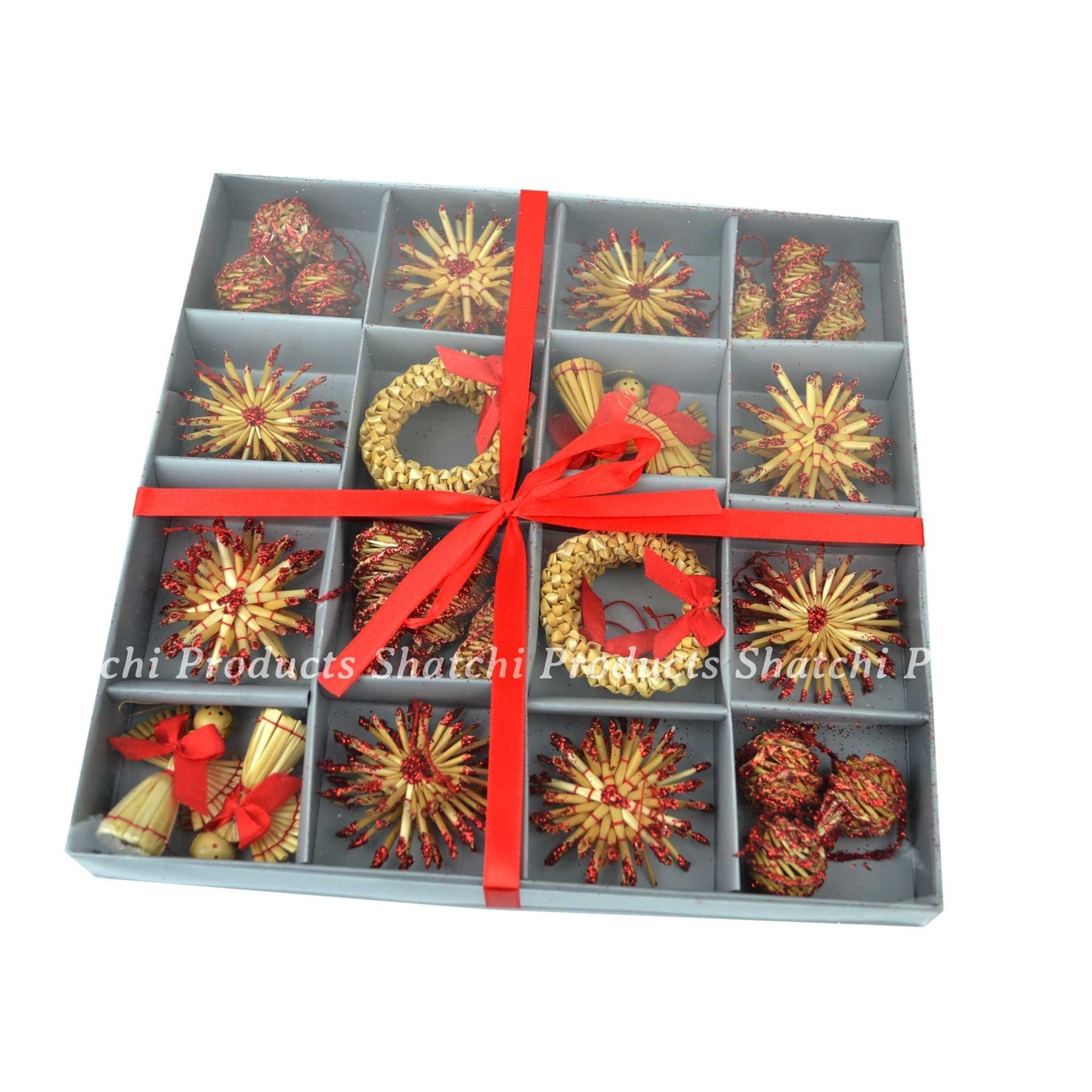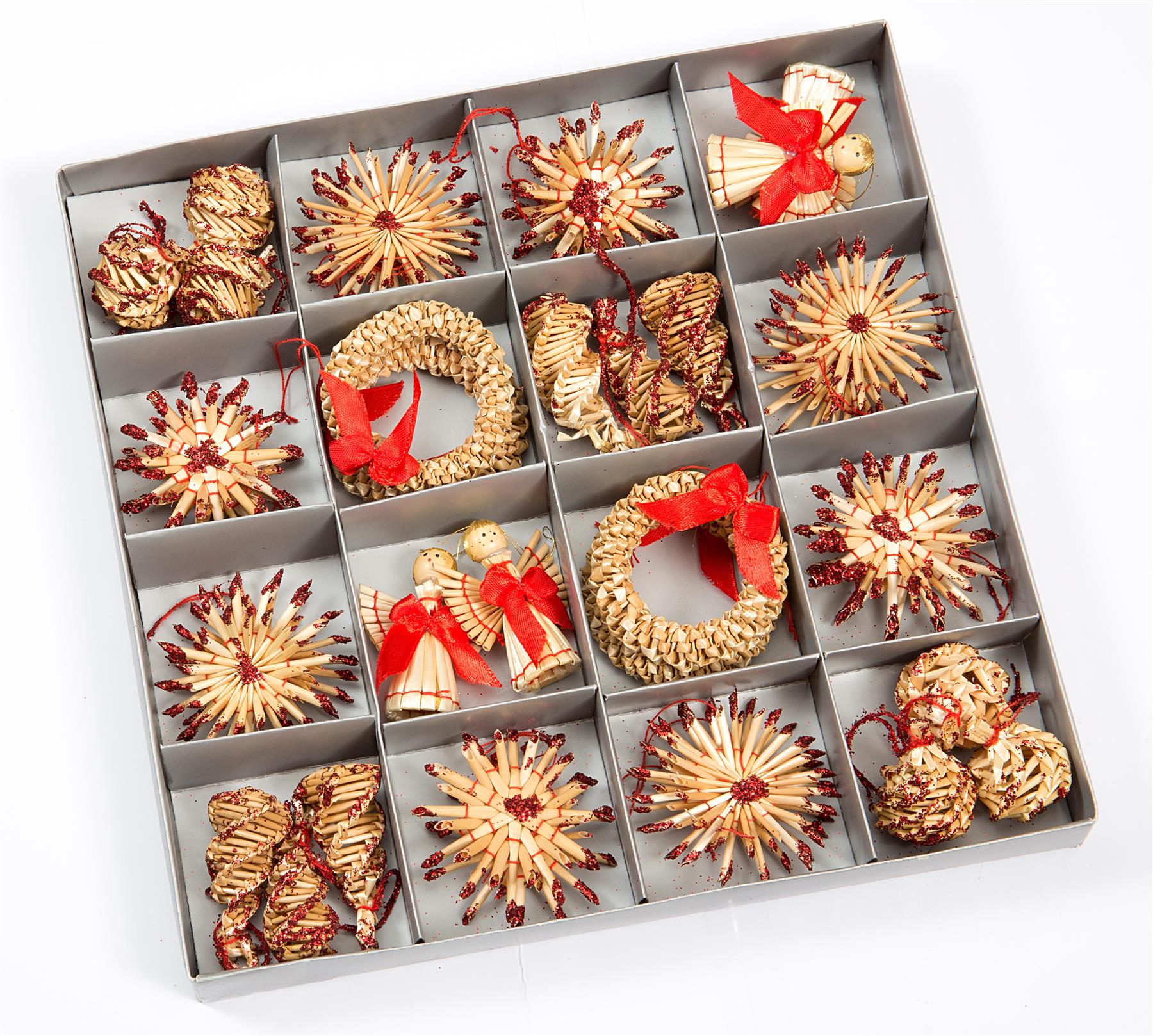 - Beautifully hand-crafted decorations made from natural wheat straw with red decor.