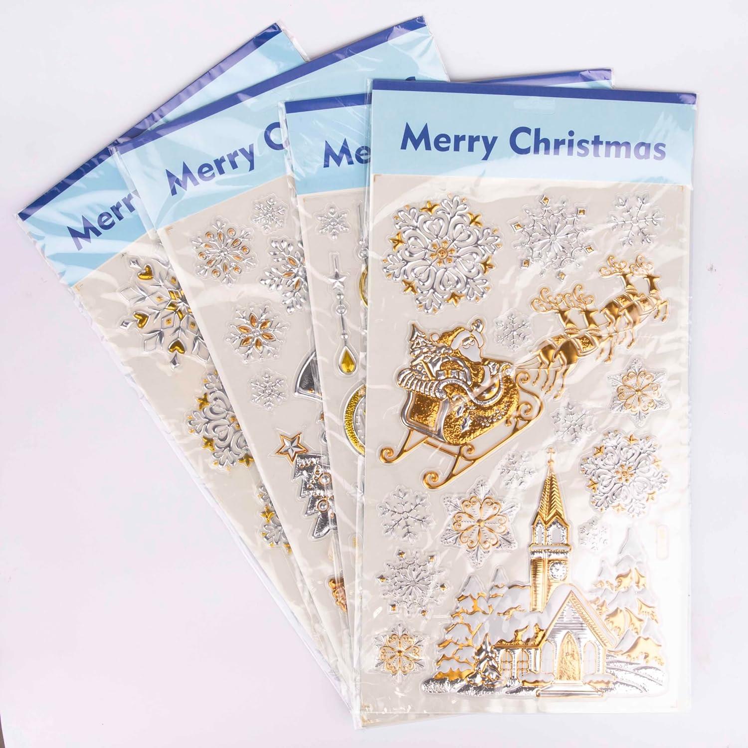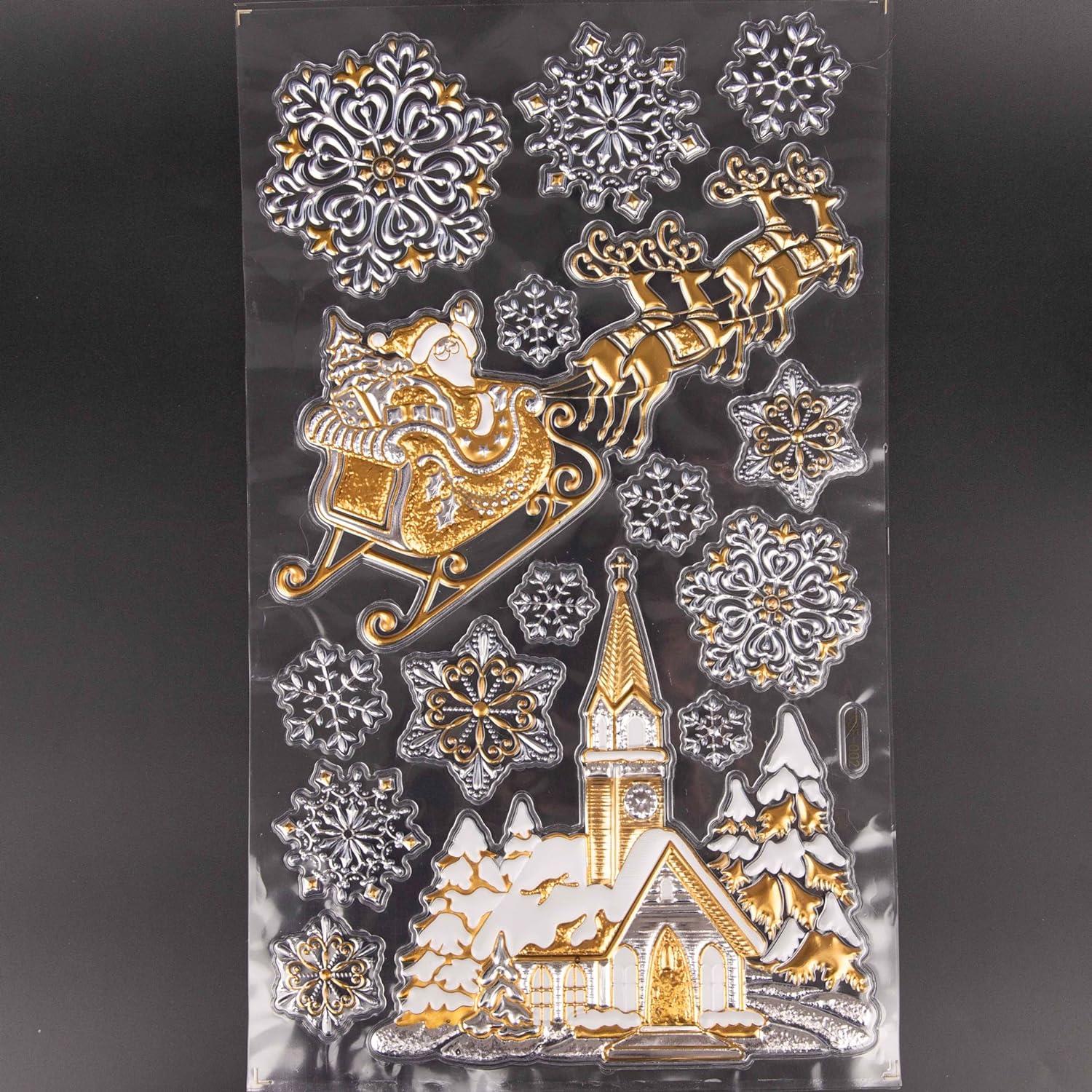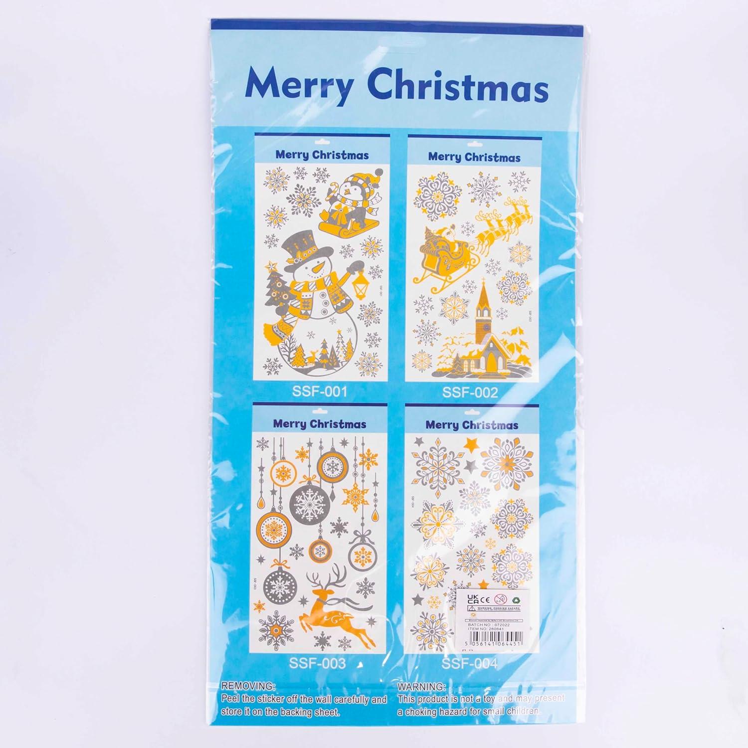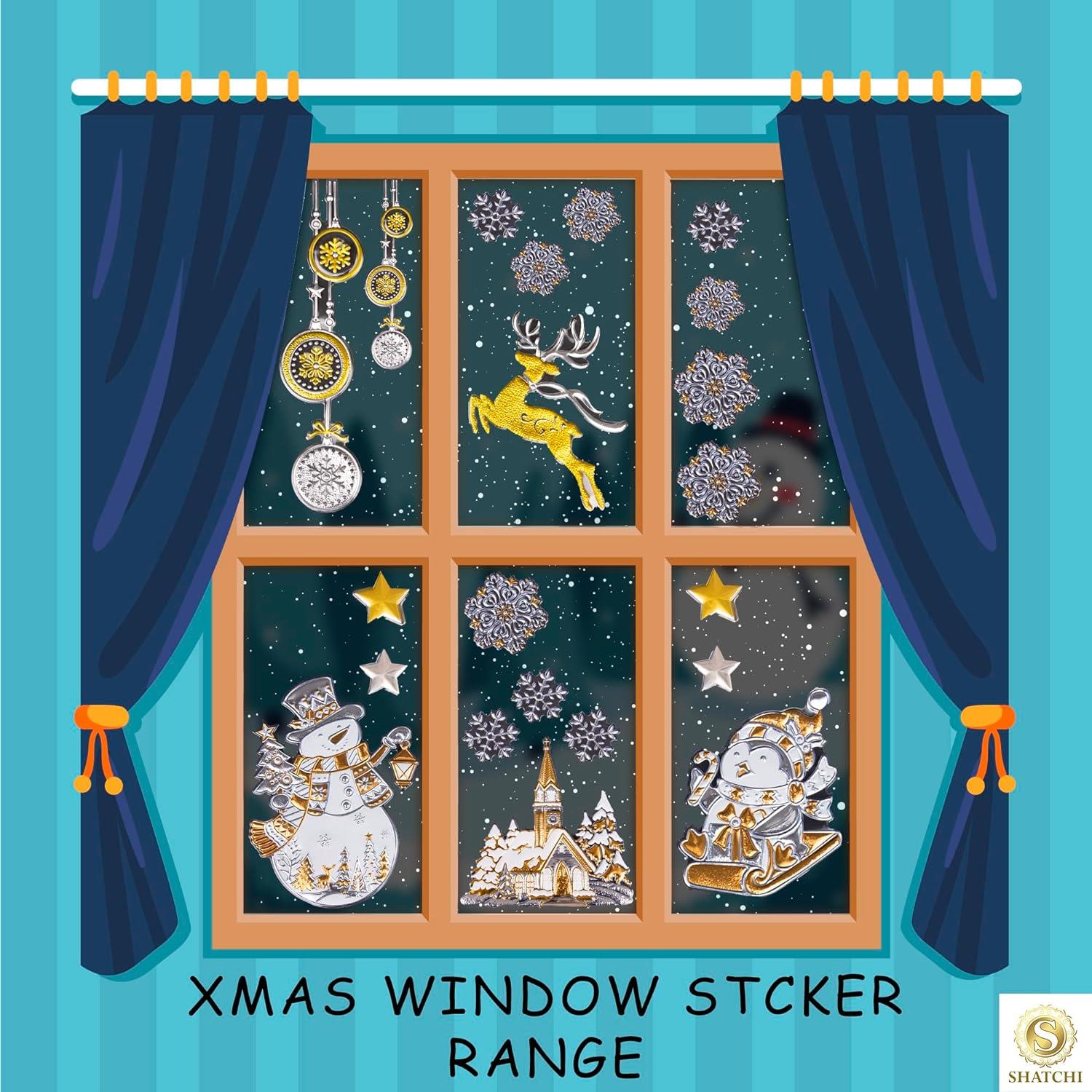- EASY TO PEEL CLINGS: Includes 4 sheets of Assorted window clings Golden & Silver Santa Reindeer Sleigh, Snowman, Stars, Village Scene, Reindeer, Snowflakes, Hanging Baubles, and many festive elements as shown in images.