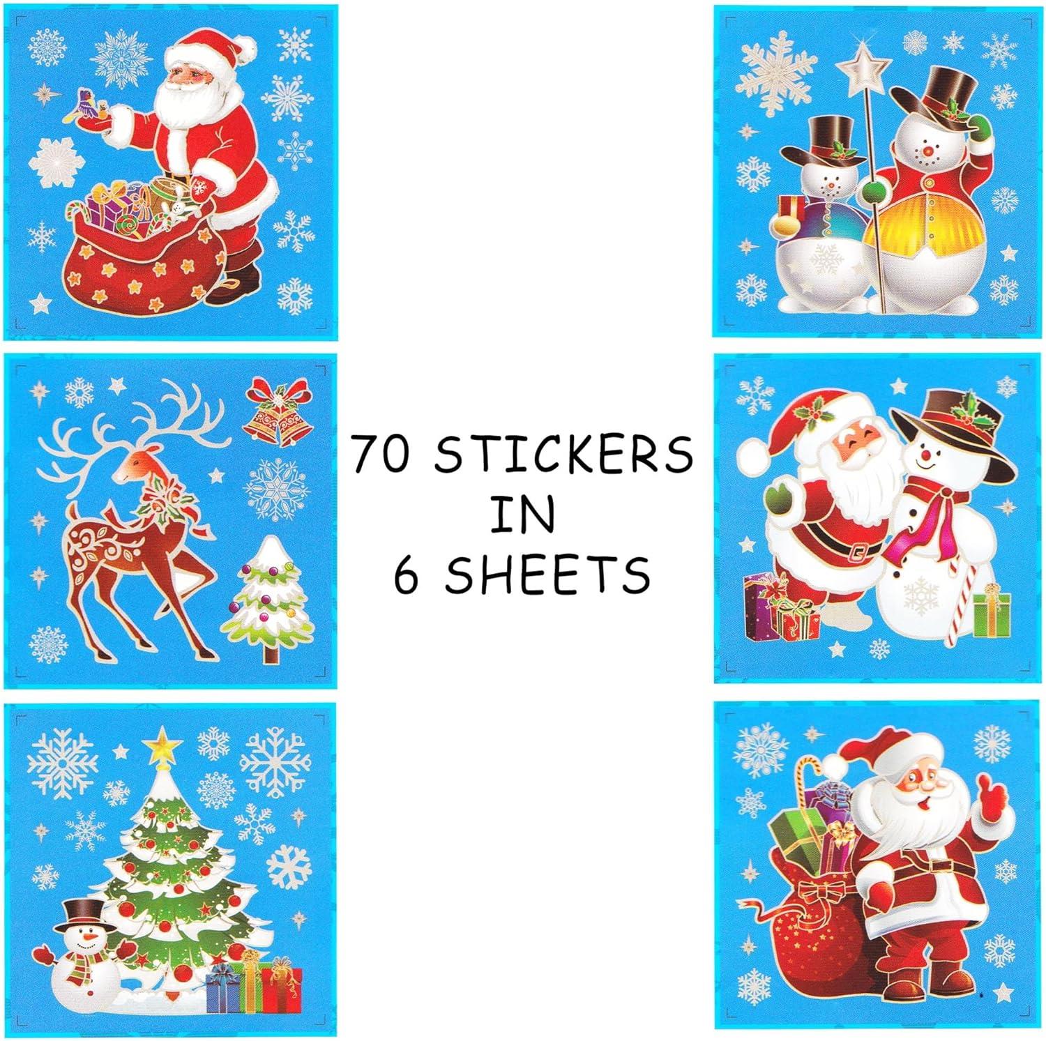 - EASY TO PEEL CLINGS: Includes 6 sheets of Assorted window clings with colorful Santa, Snowman, and Reindeer figures surrounded with snowflakes and festive elements as shown in images.