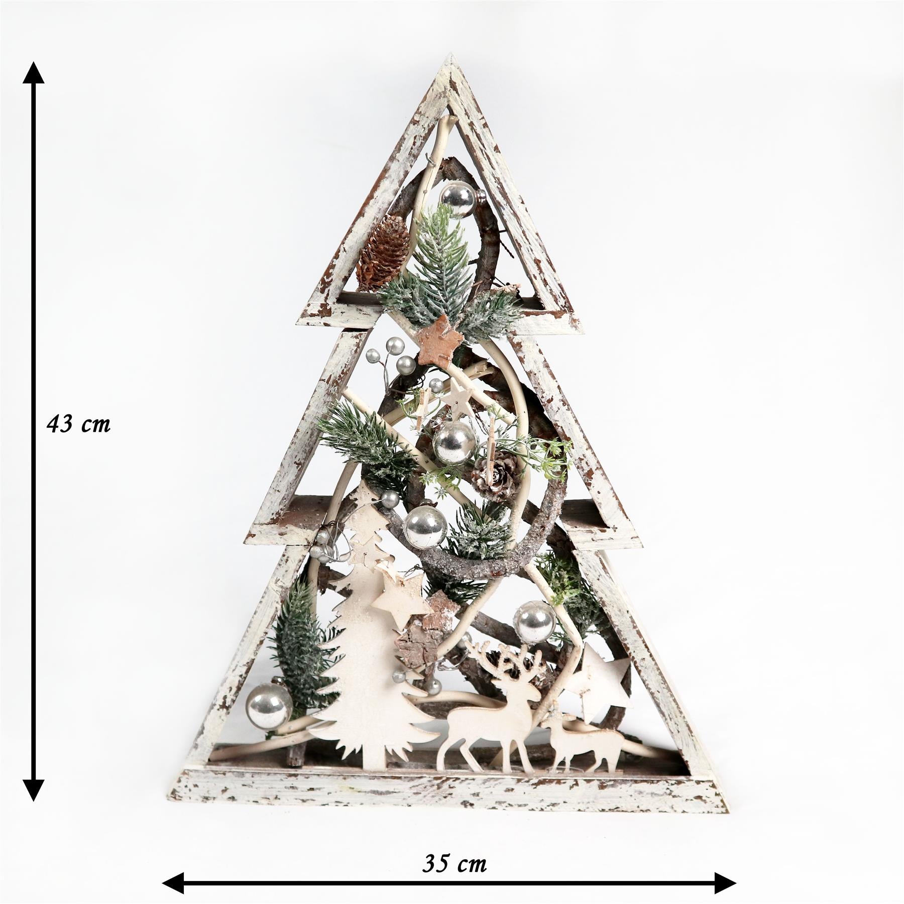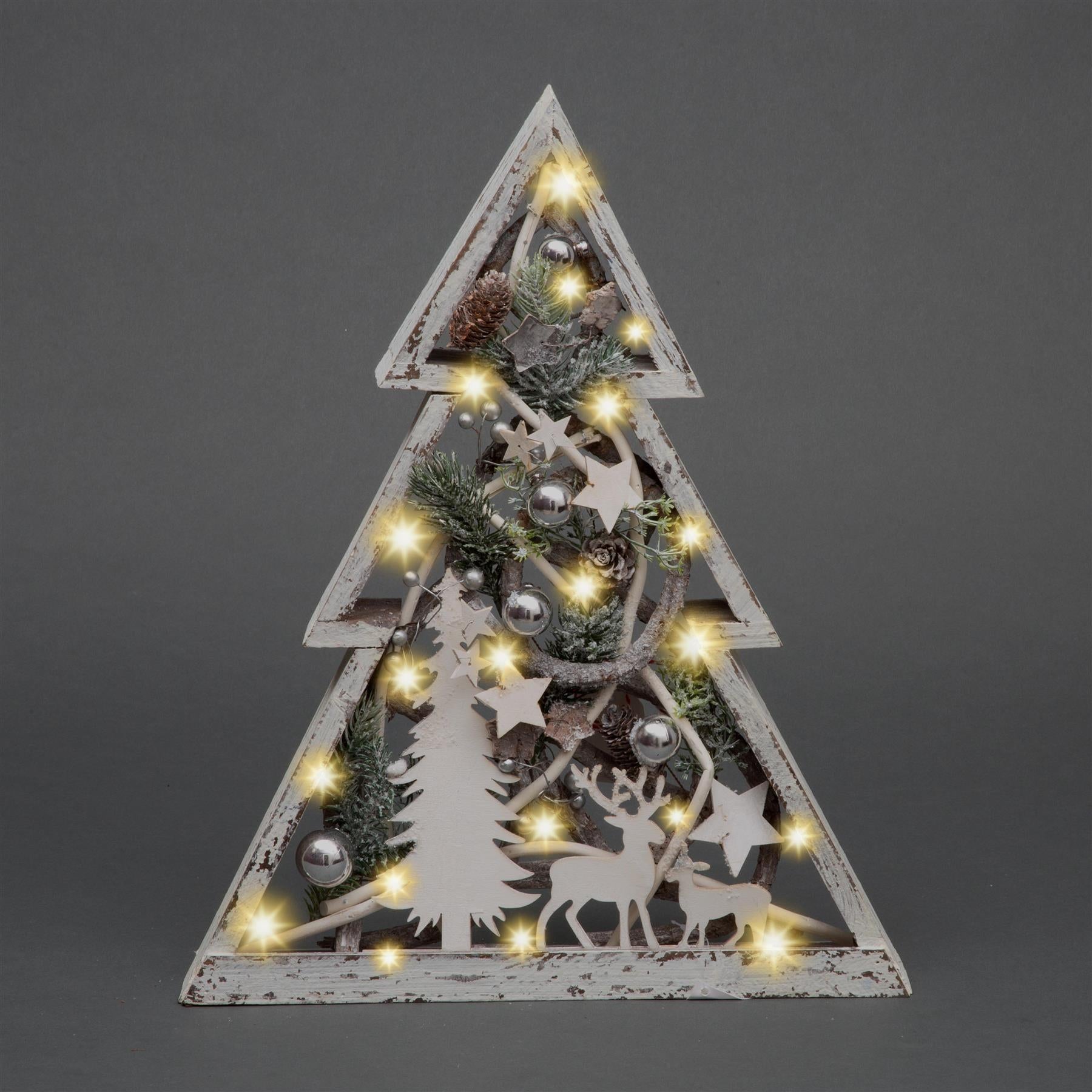 - Wrapped with 20 warm white LED string lights Shape: Christmas Tree, Measures approx.: H43 x W35cm x D5.5cm, Colour: White Requires 2 x AA batteries (not included). For indoor use only, Order Quantity: 1 pc