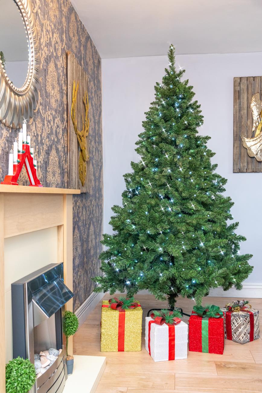 - Size: 4ft(120cm), Approx. Width:80cm, Material: PVC/Metal, Tips: 308, Colour: Green, Construction: Hinged, LEDs: 144(White), Order Quantity: 1 Pc (Comes with Metal Stand)