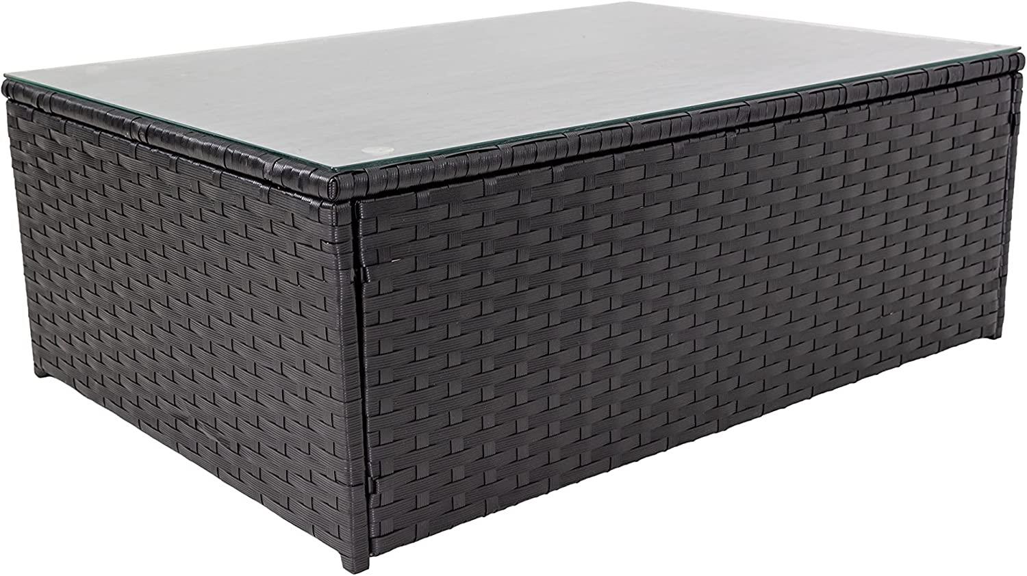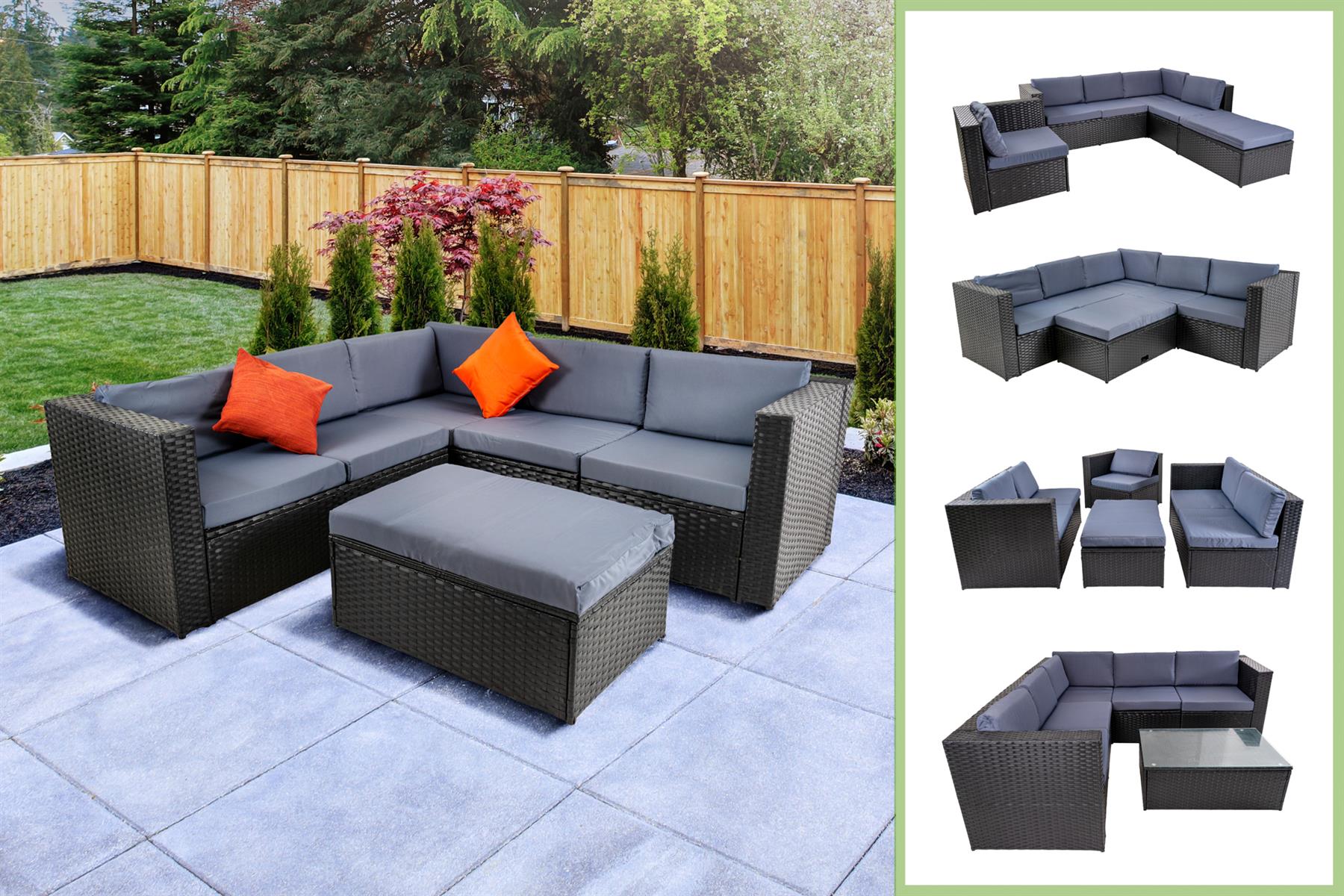 - The Set has black color rattan material, transparent sturdy glass on top of the table, grey cushions, and a seat on the sofa.