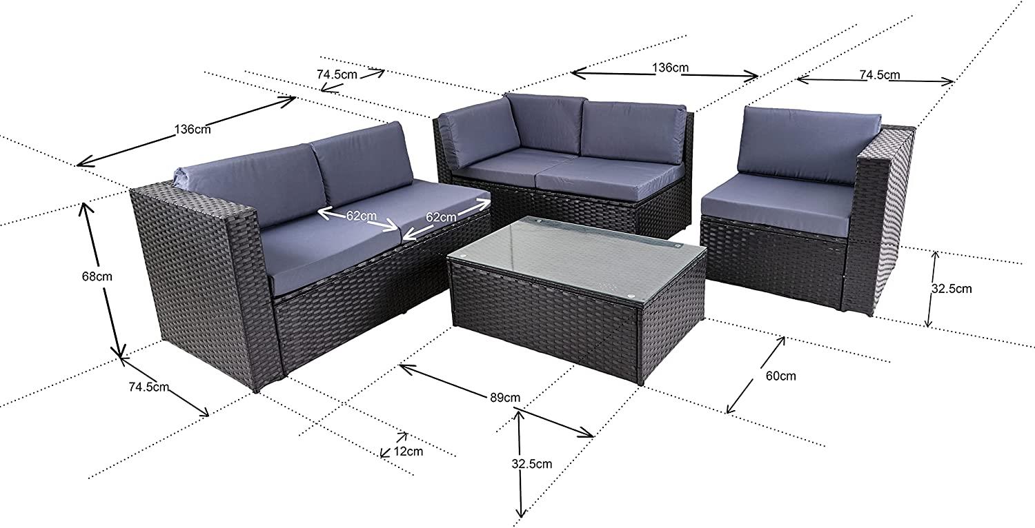 - Item Dimension: Sofa: 136Lx68Dx74H cm, 68Lx68Dx74H cm, and 136Lx68Wx74H cm, Table: 89Lx60Dx32.5H cm, Cushions: 8cm, 5mm clear toughened glass