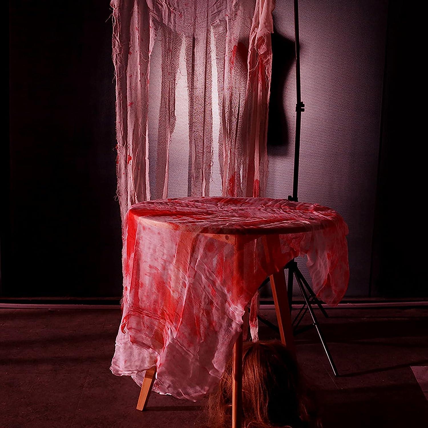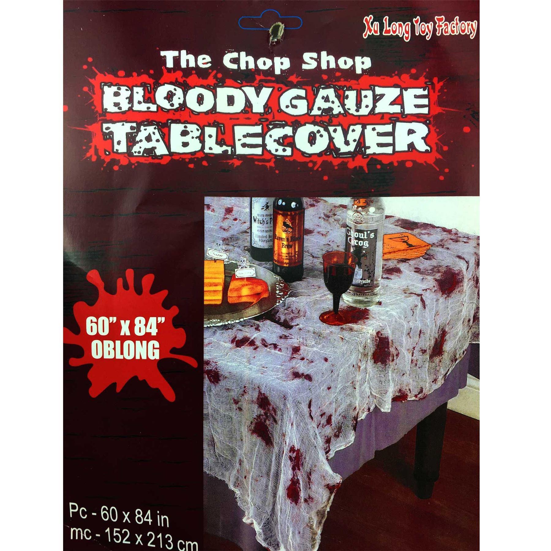 - The Bloody Gauze Table Cover creates a macabre atmosphere, featuring white gauze with drops, streaks, and patches of fake blood.