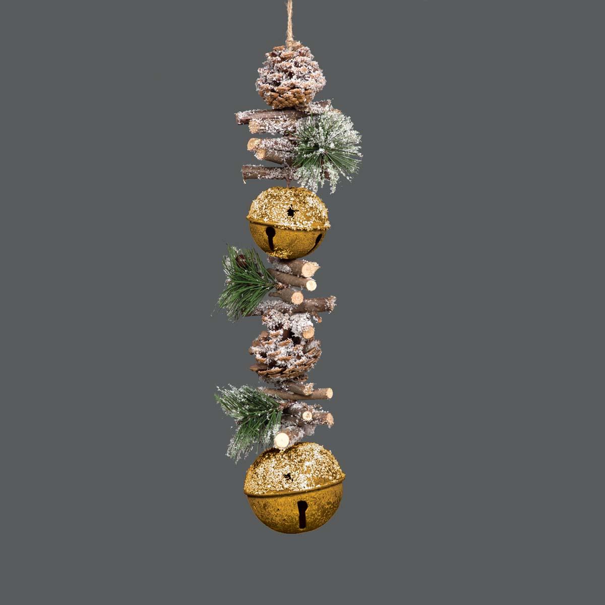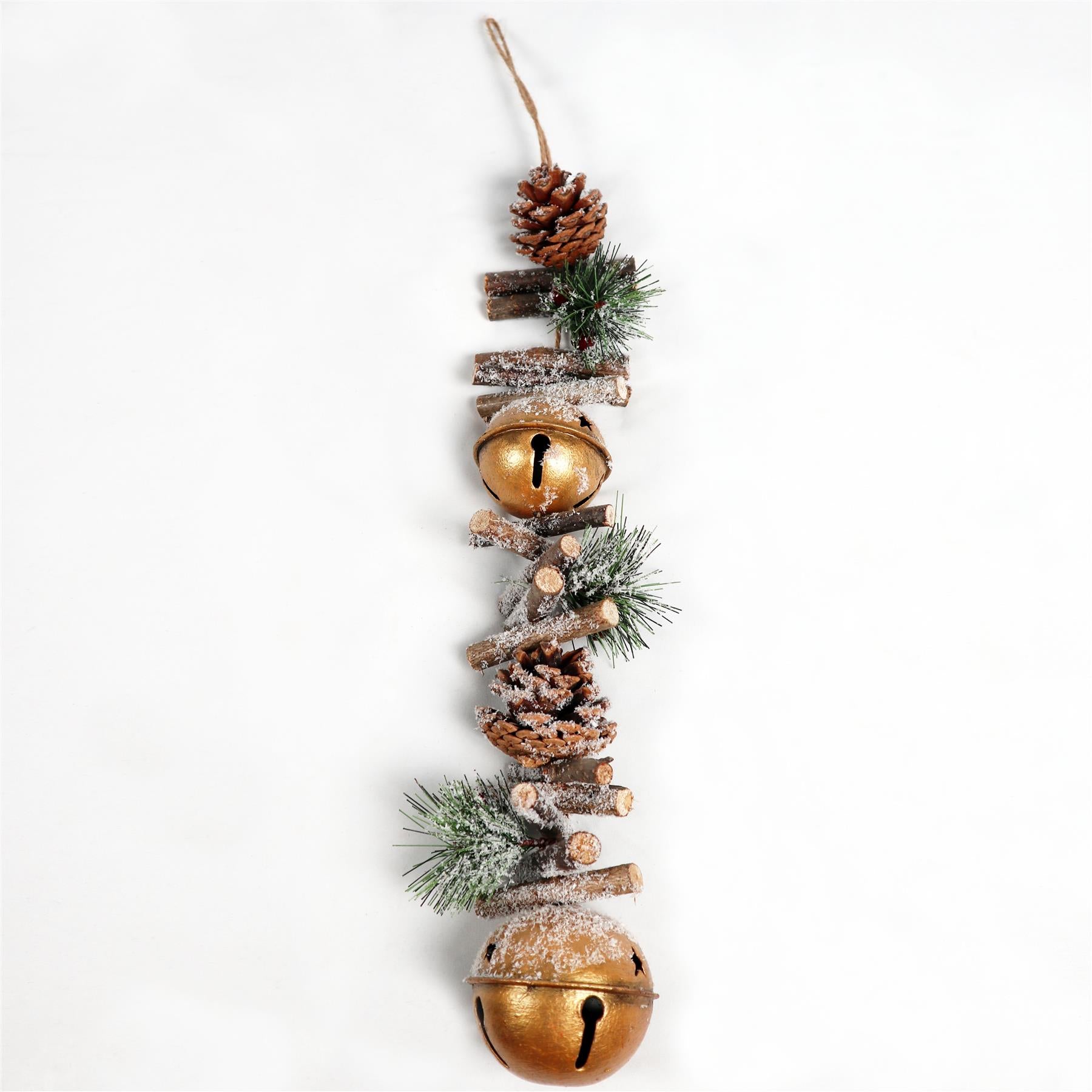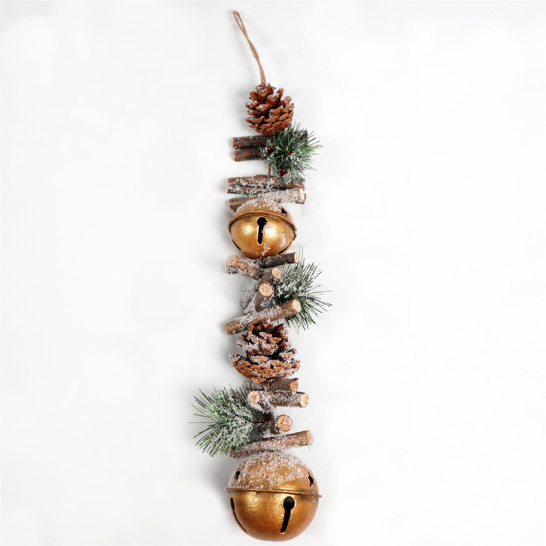 - Hanging Decoration Bell Christmas Home Wall Door Decor Art Craft for Xmas Party. It has brown wooden sticks on top and is wrapped with bells, Pinecones, and leaves dusted with snow and berries.