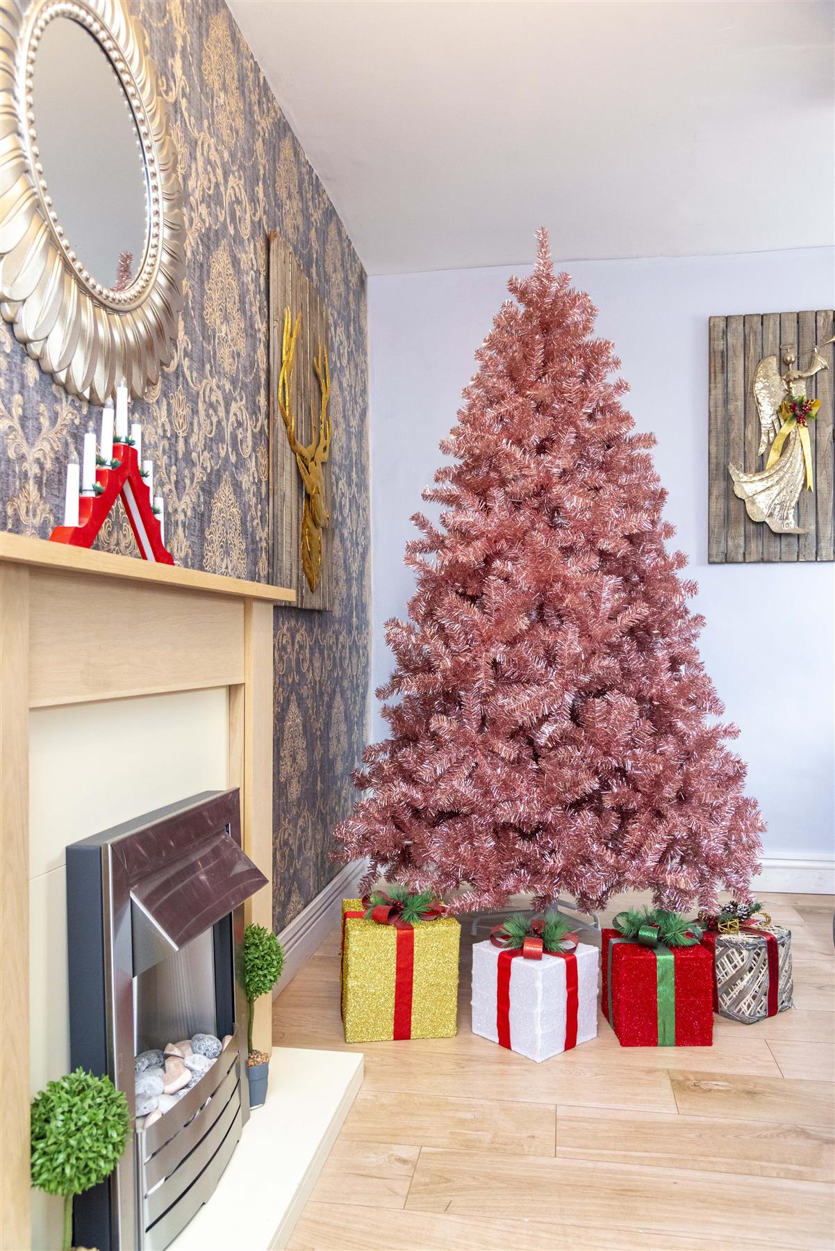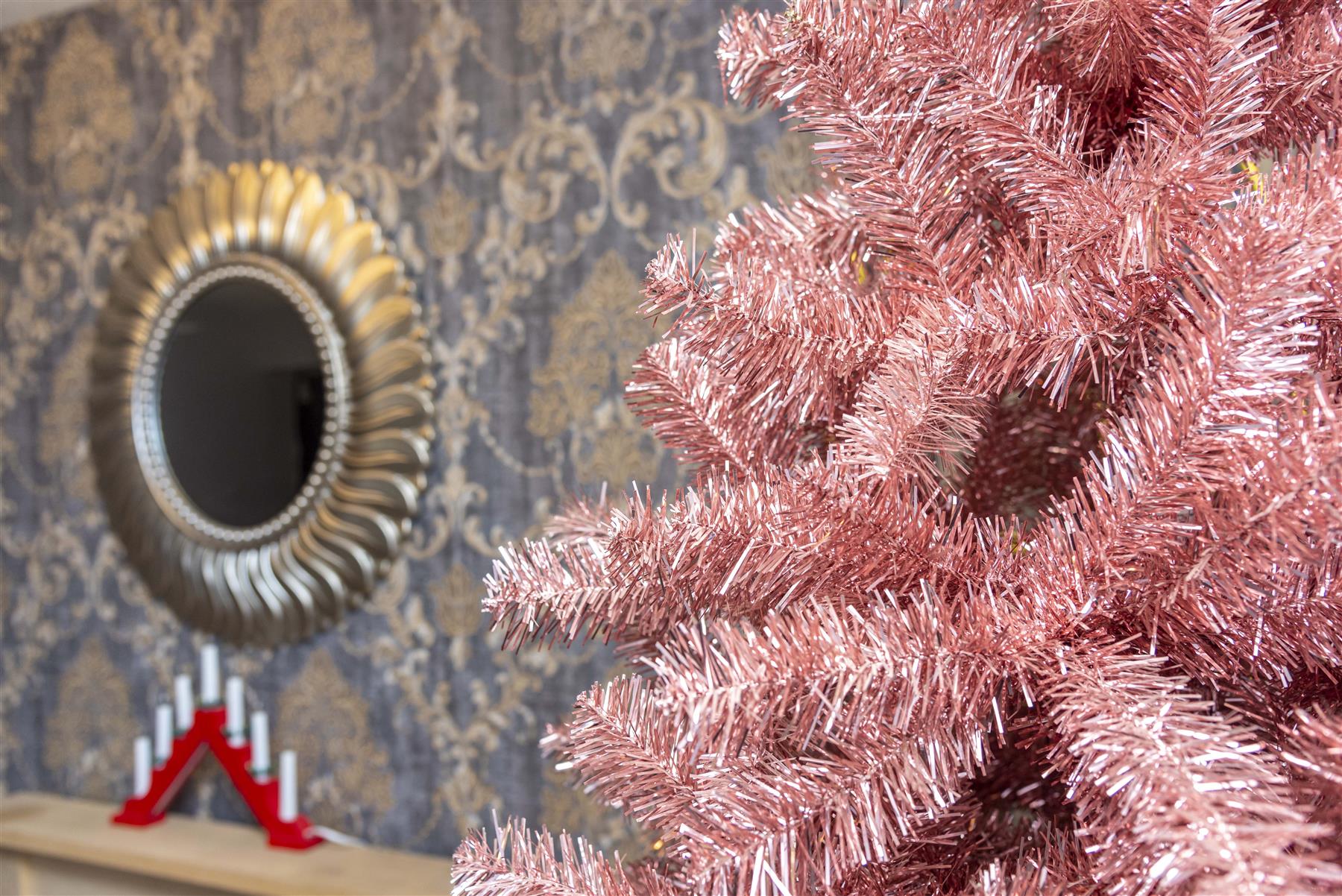 - This Christmas try our unique rose gold color Christmas tree to be an immediate eye-catcher in any setting, with a shiny pink tinsel design that breaks free from the traditional tree.