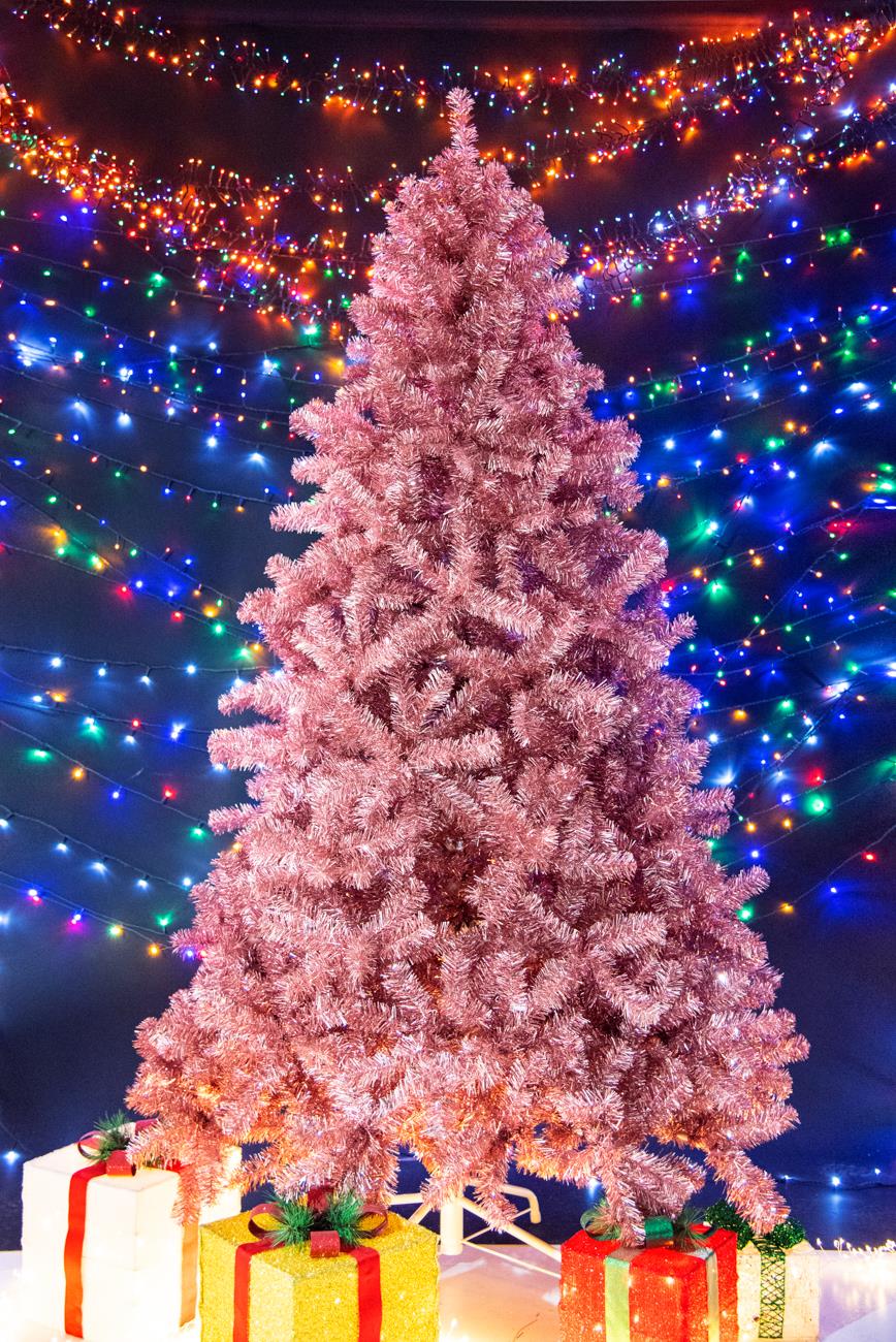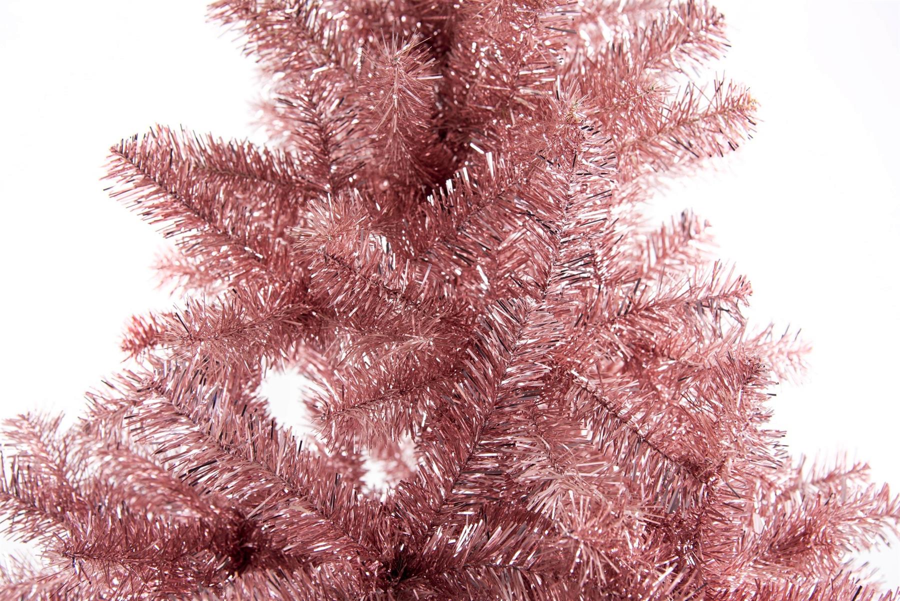 - This Christmas try our unique rose gold color Christmas tree to be an immediate eye-catcher in any setting, with a shiny pink tinsel design that breaks free from the traditional tree.