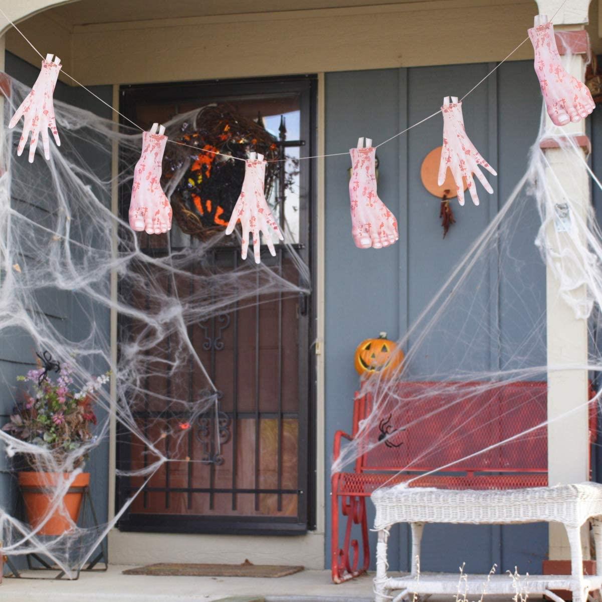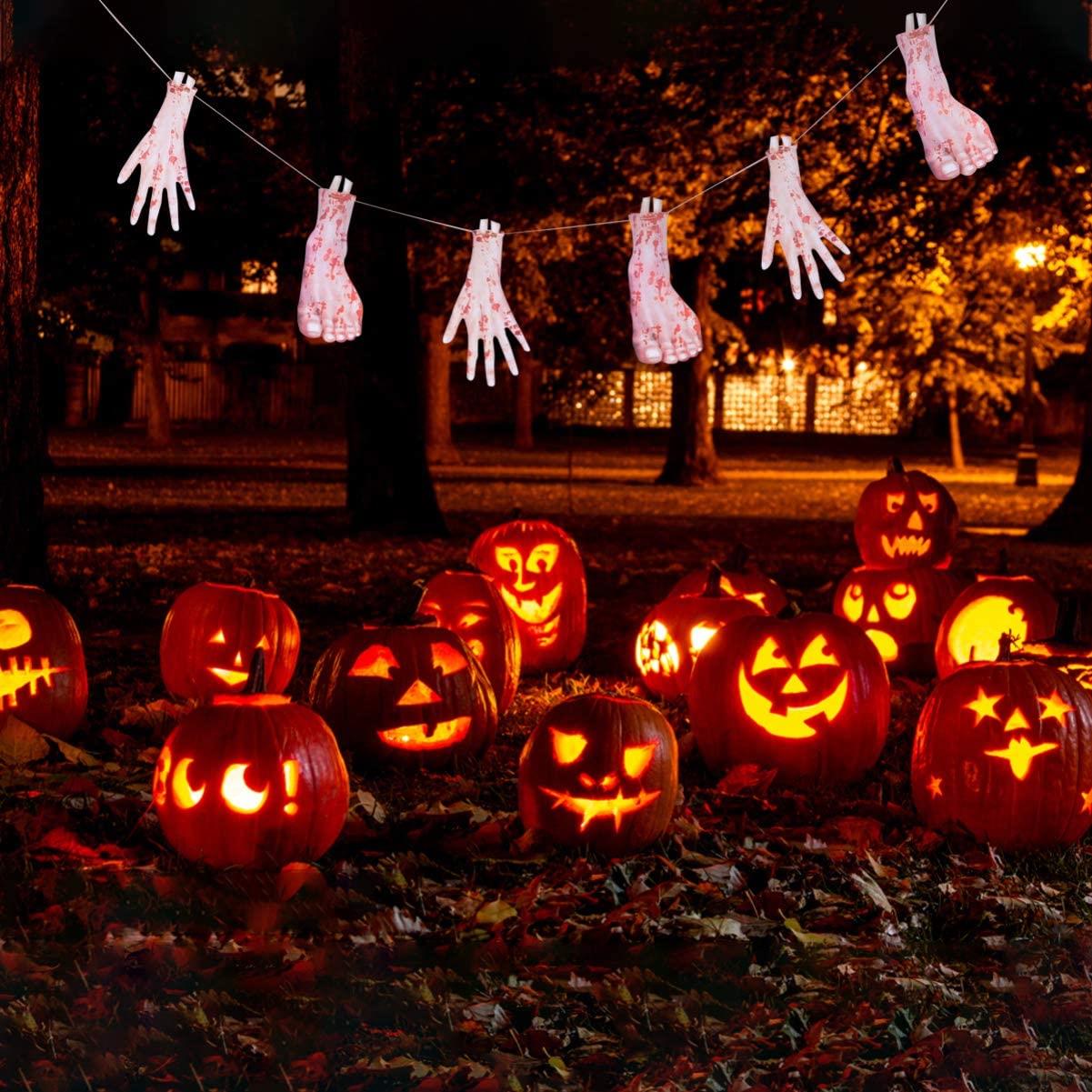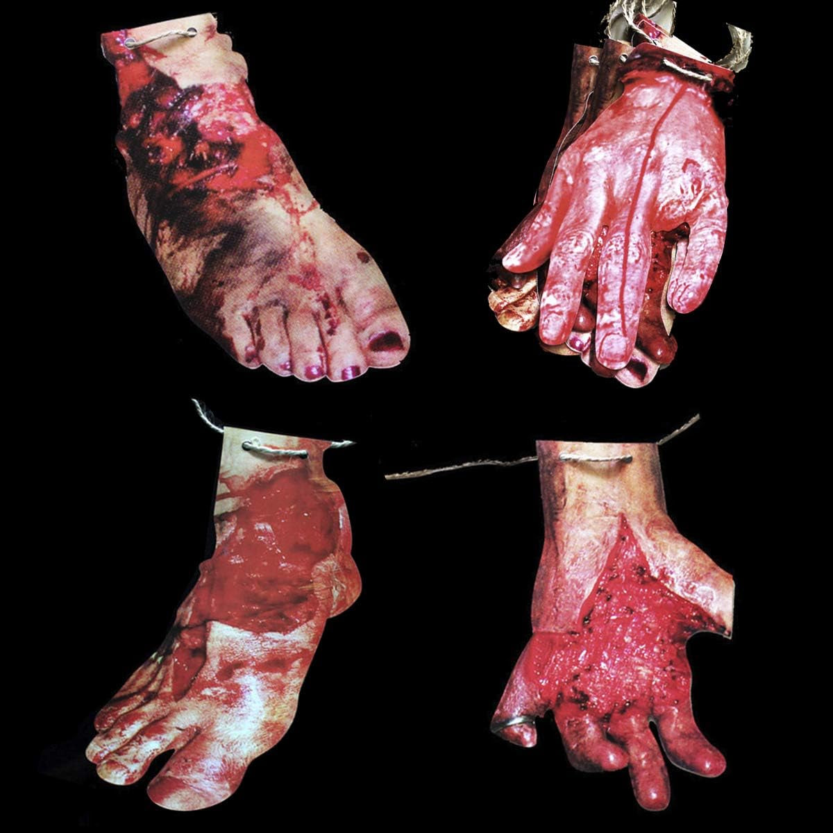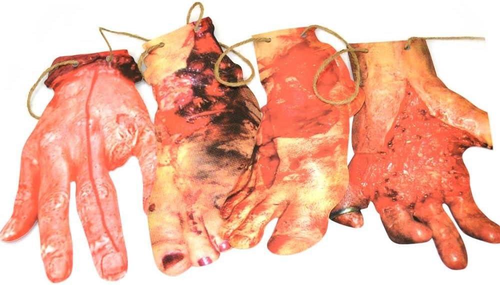 - This ghastly garland features a macabre assortment of limbs - arms and feet - hanging with a bloodied flair, creating an atmosphere of eerie intrigue that perfectly complements the Halloween spirit.