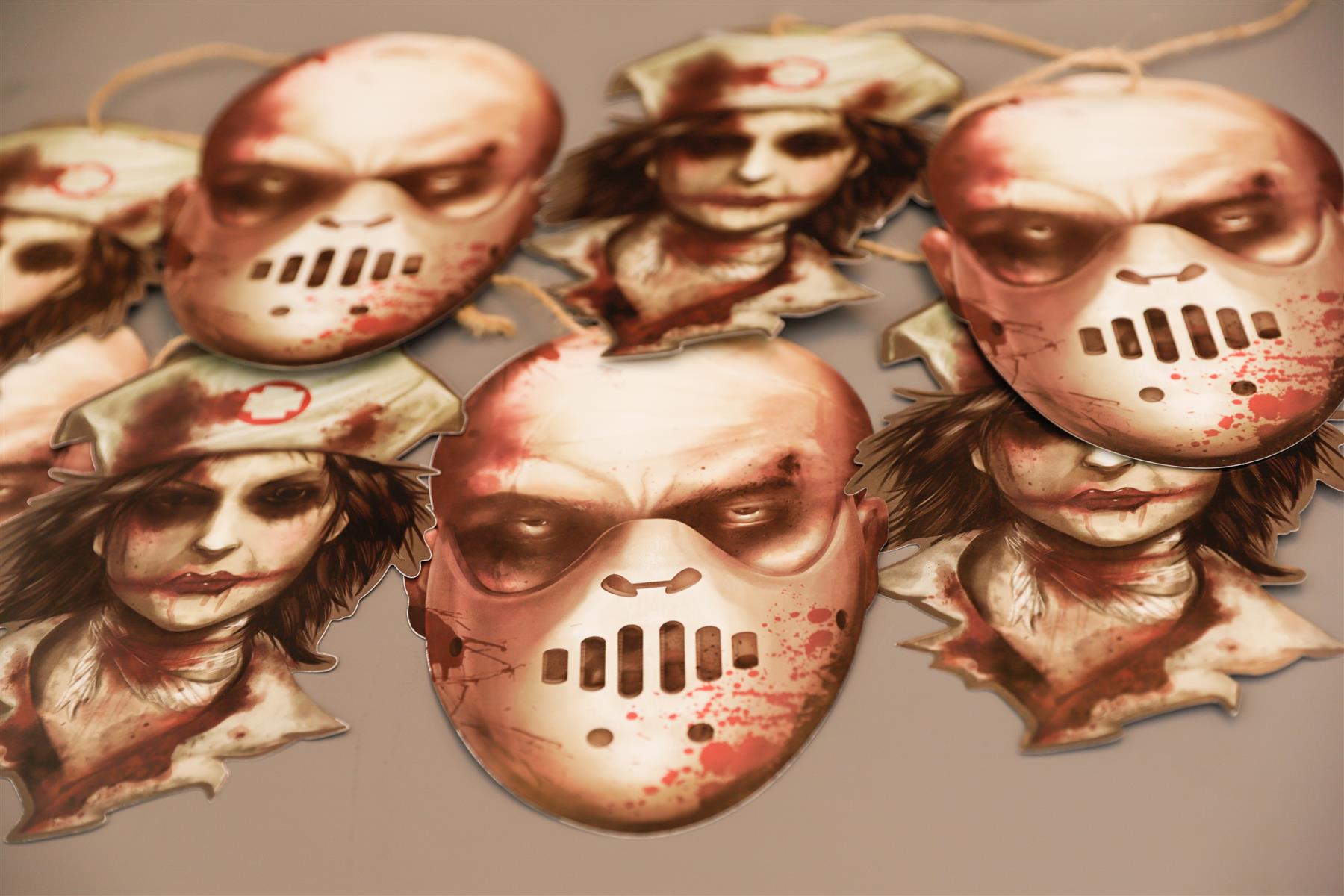 - Each head-turning detail is meticulously crafted to evoke a sense of dread, from the 8 assorted hanging bloody heads cut-outs to the eerie black swirls on which they hang.
