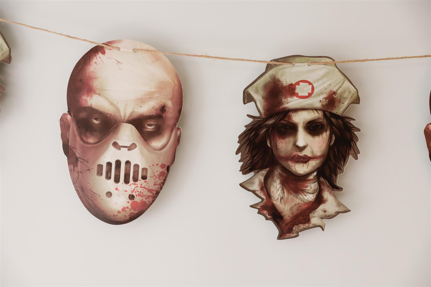- Embrace the horror of Halloween with the SHATCHI Halloween Chopped Bloody Faces Garland Bunting Banner.