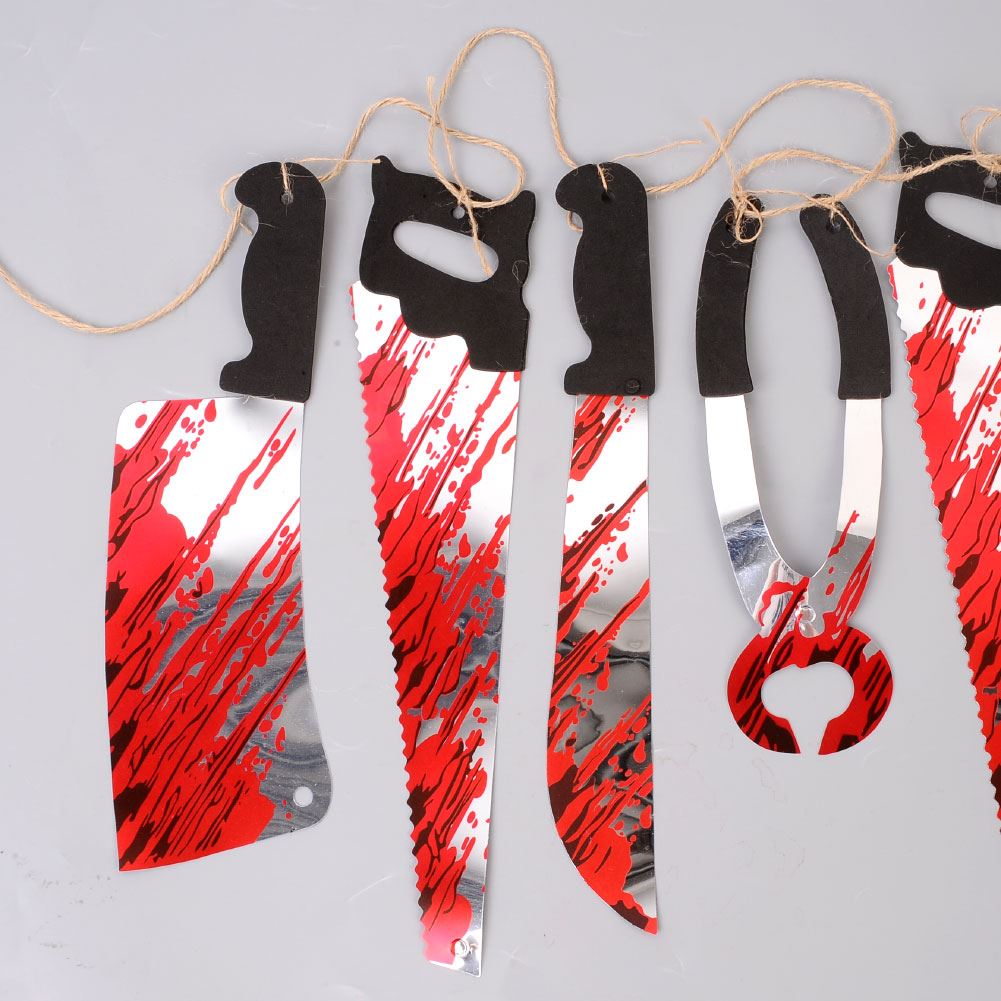 - Whether you're hosting a Halloween party or simply aiming to transform your space into a horrifying spectacle, this bloody weapons garland is the perfect addition.