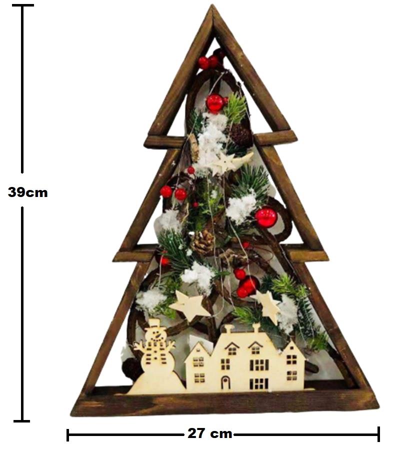 - The decoration has a brown wood frame in the shape of a Xmas tree. The frame has been filled with brown wooden sticks, pine cones, red berries, leaves, small red baubles, and wooden stars that have been dusted with snow.