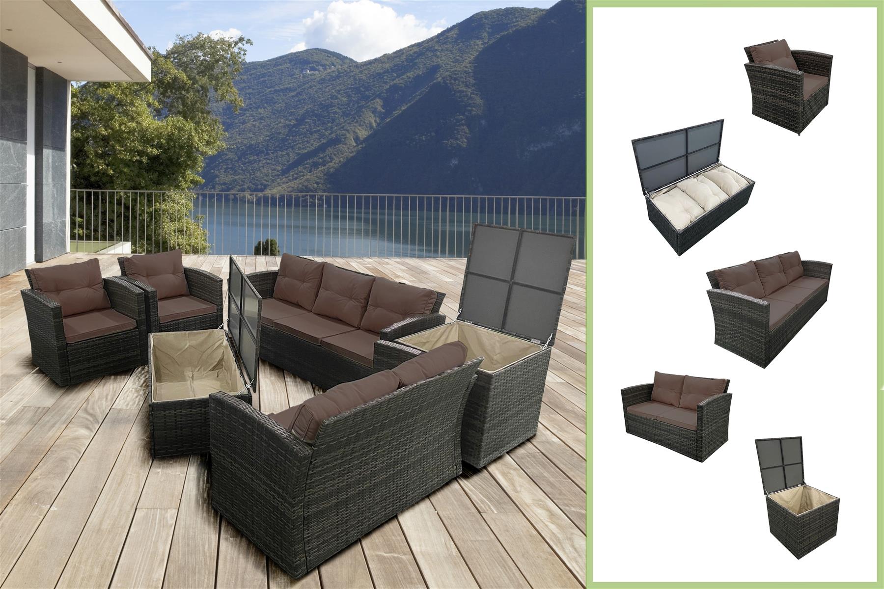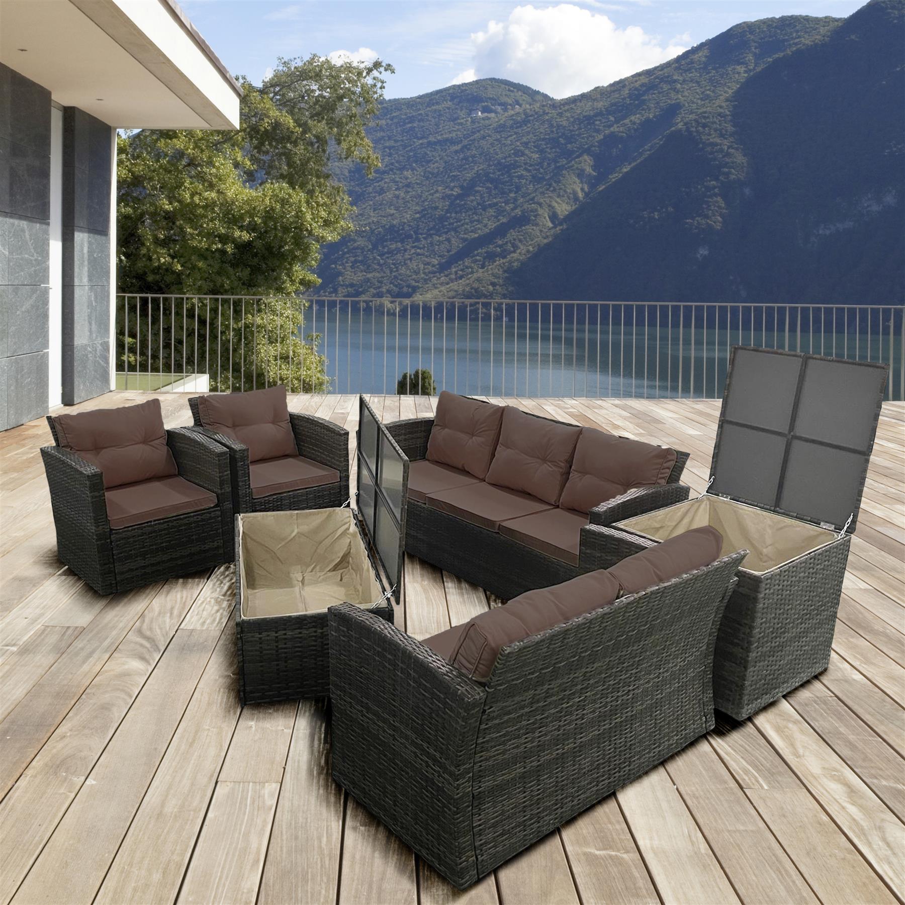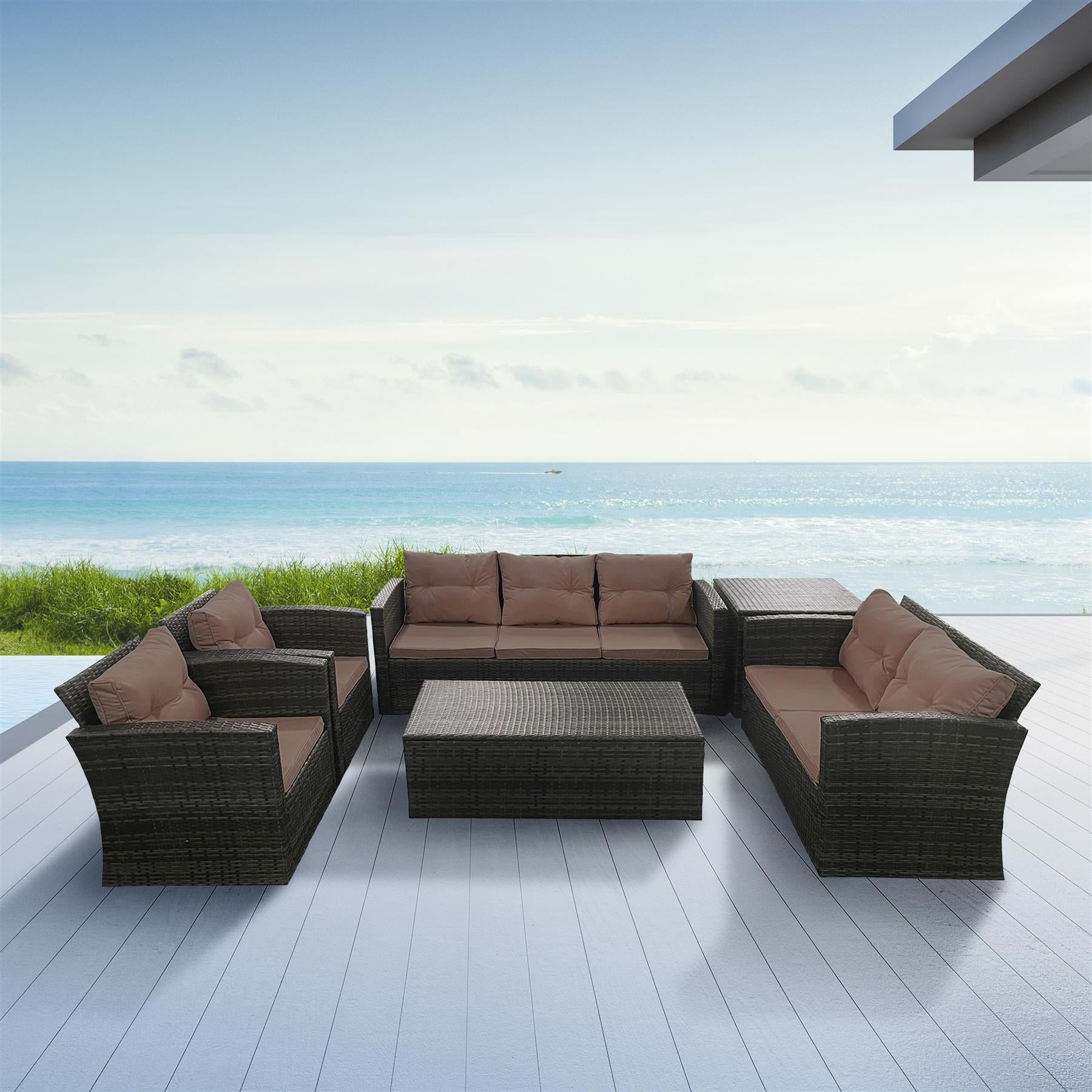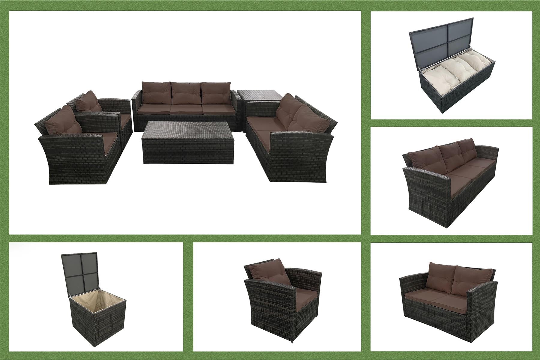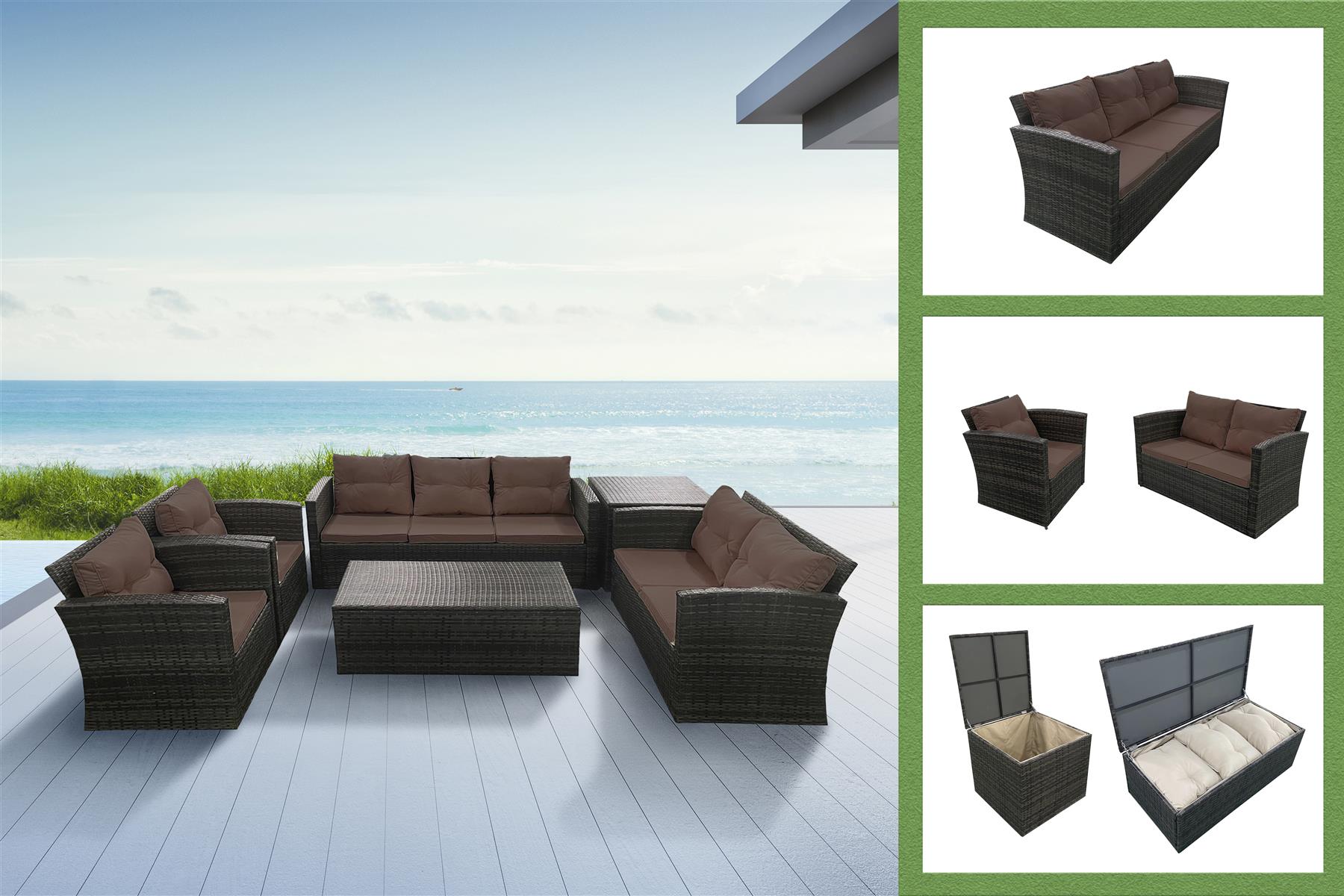 - Patio wicker sets include 1 three-seater sofa, 1 two-seater sofa, 1 rattan table, 2 rattan chairs, and 1 storage box.