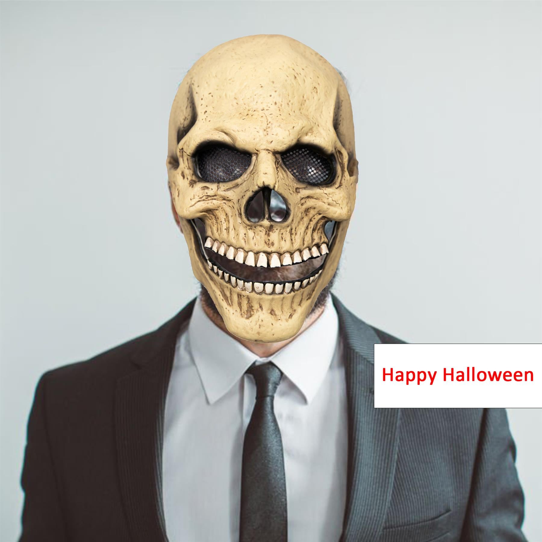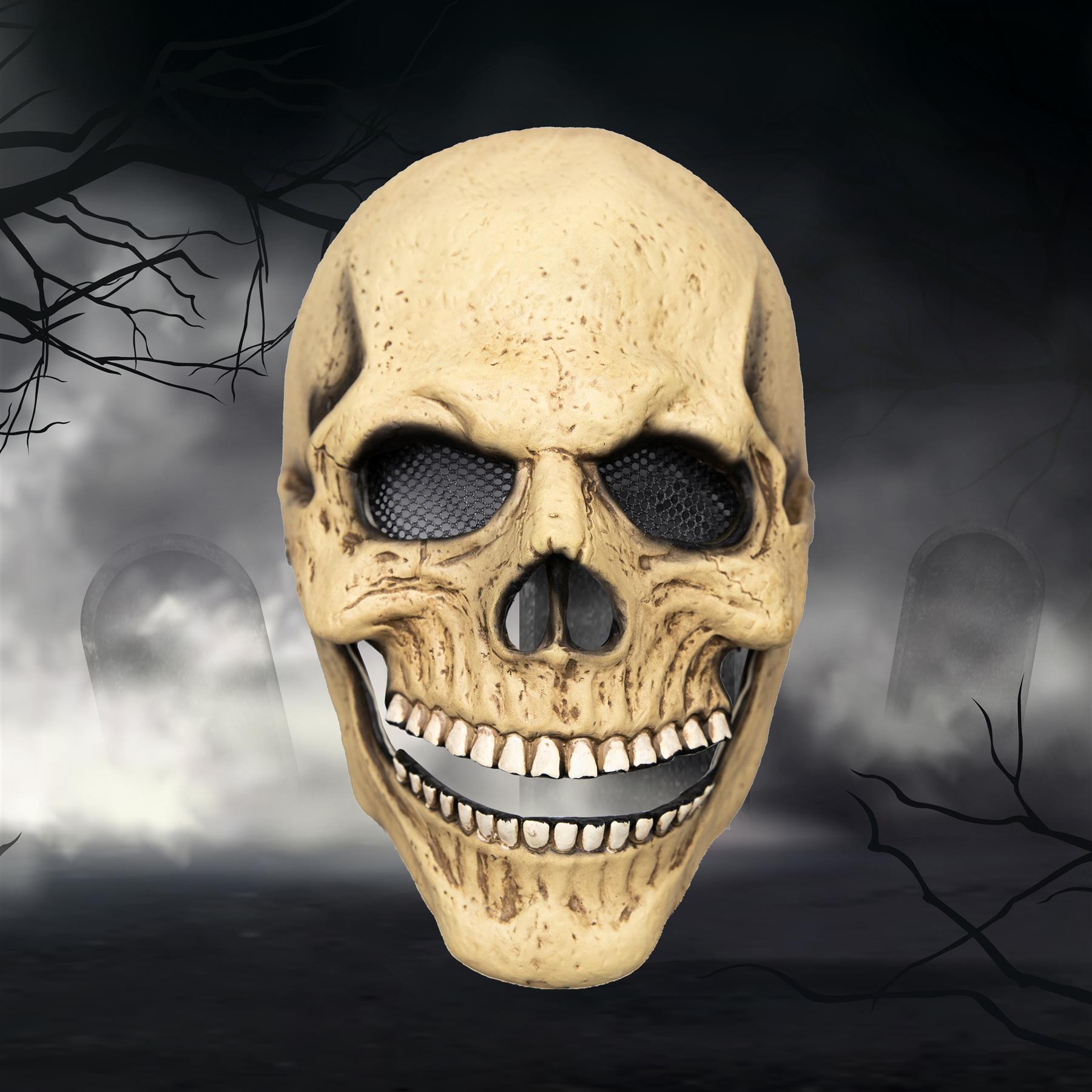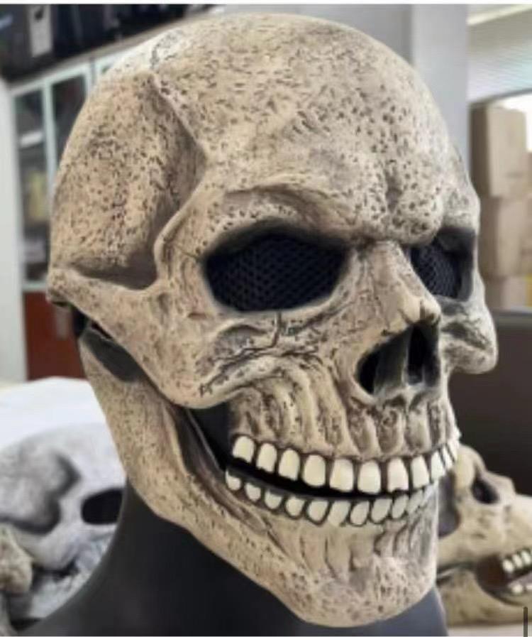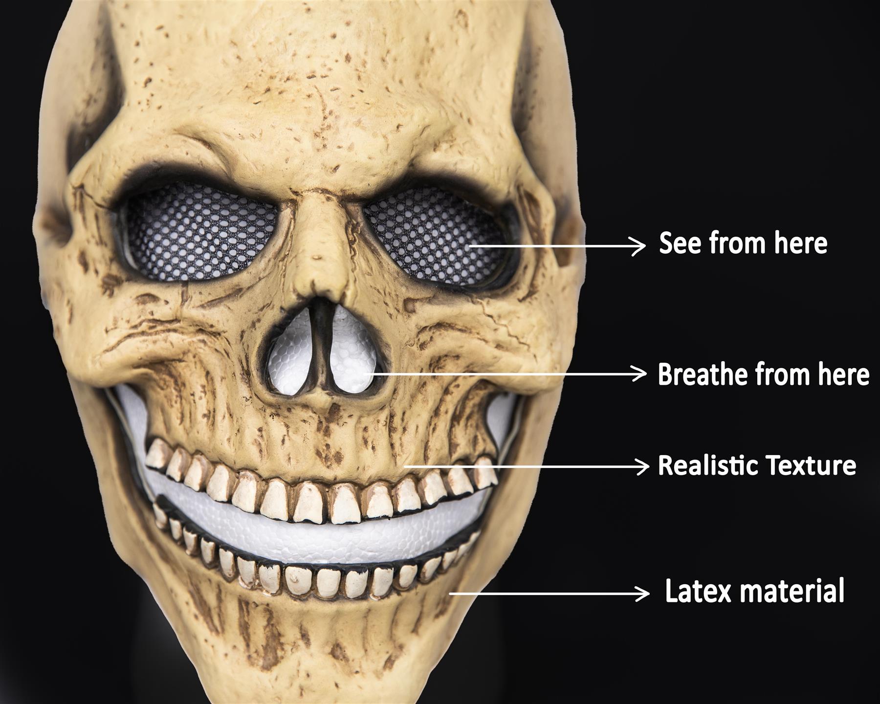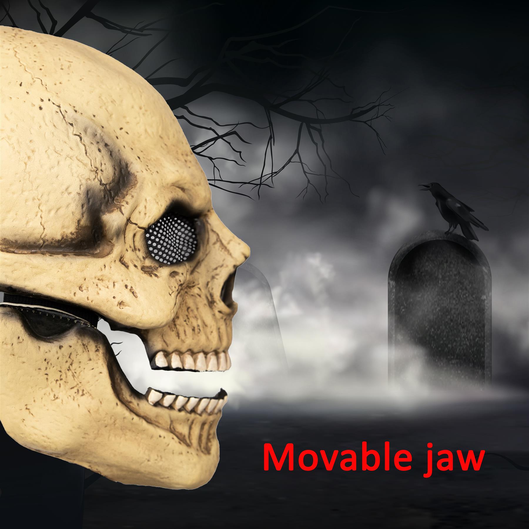 - Roomy enough to fit any child or adult. You can see through the eyes. This skull mask has with movable creepy jaw design.