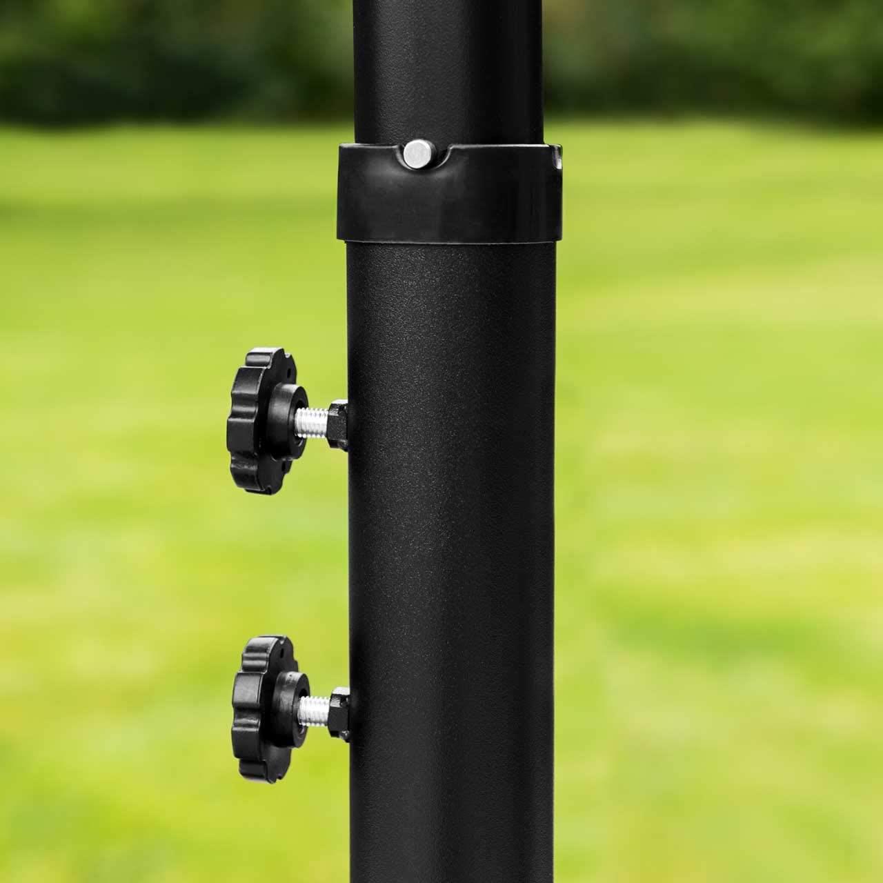- Made from top-quality materials, this parasol is built to last and withstand the elements. It comes with a cross base for added stability and can be rotated 360 degrees and tilted to your desired angle.