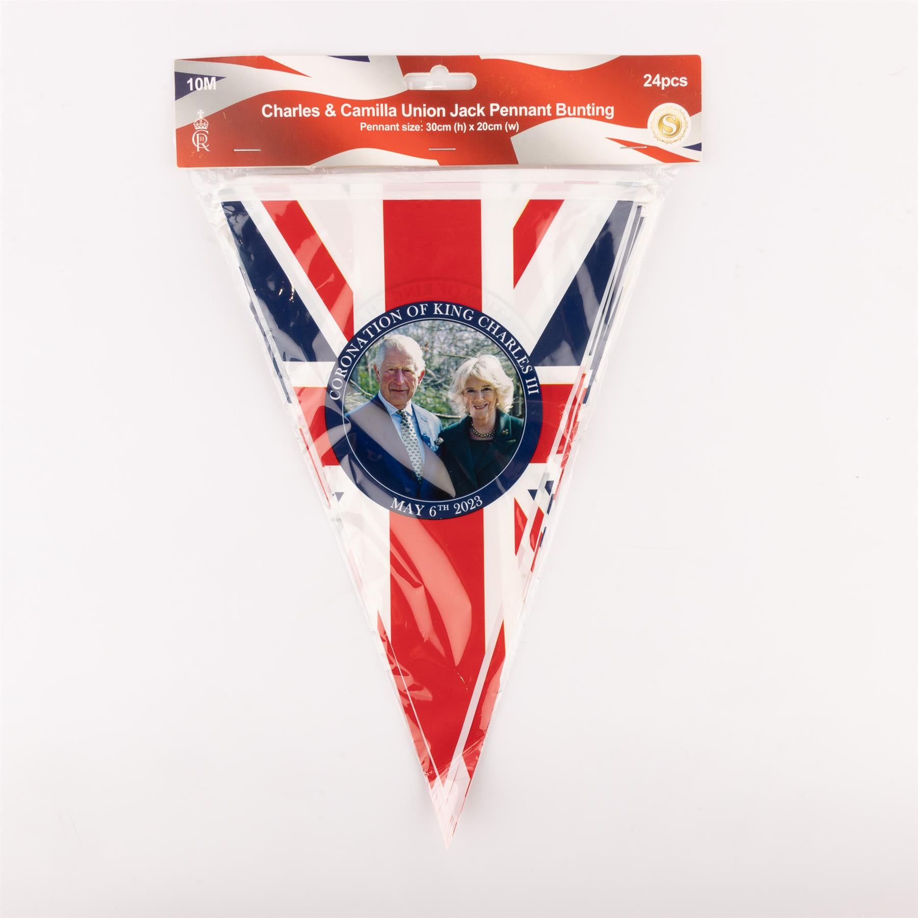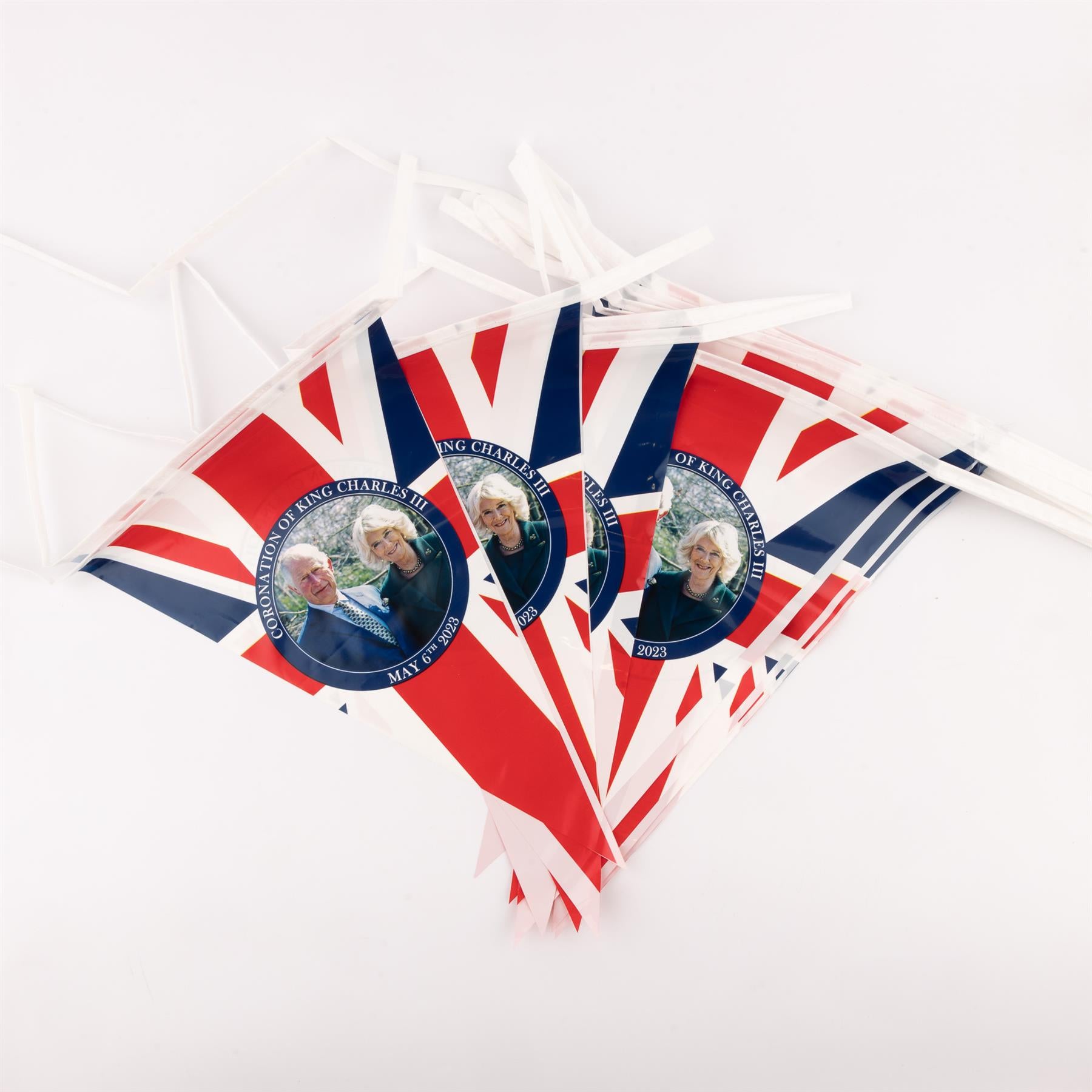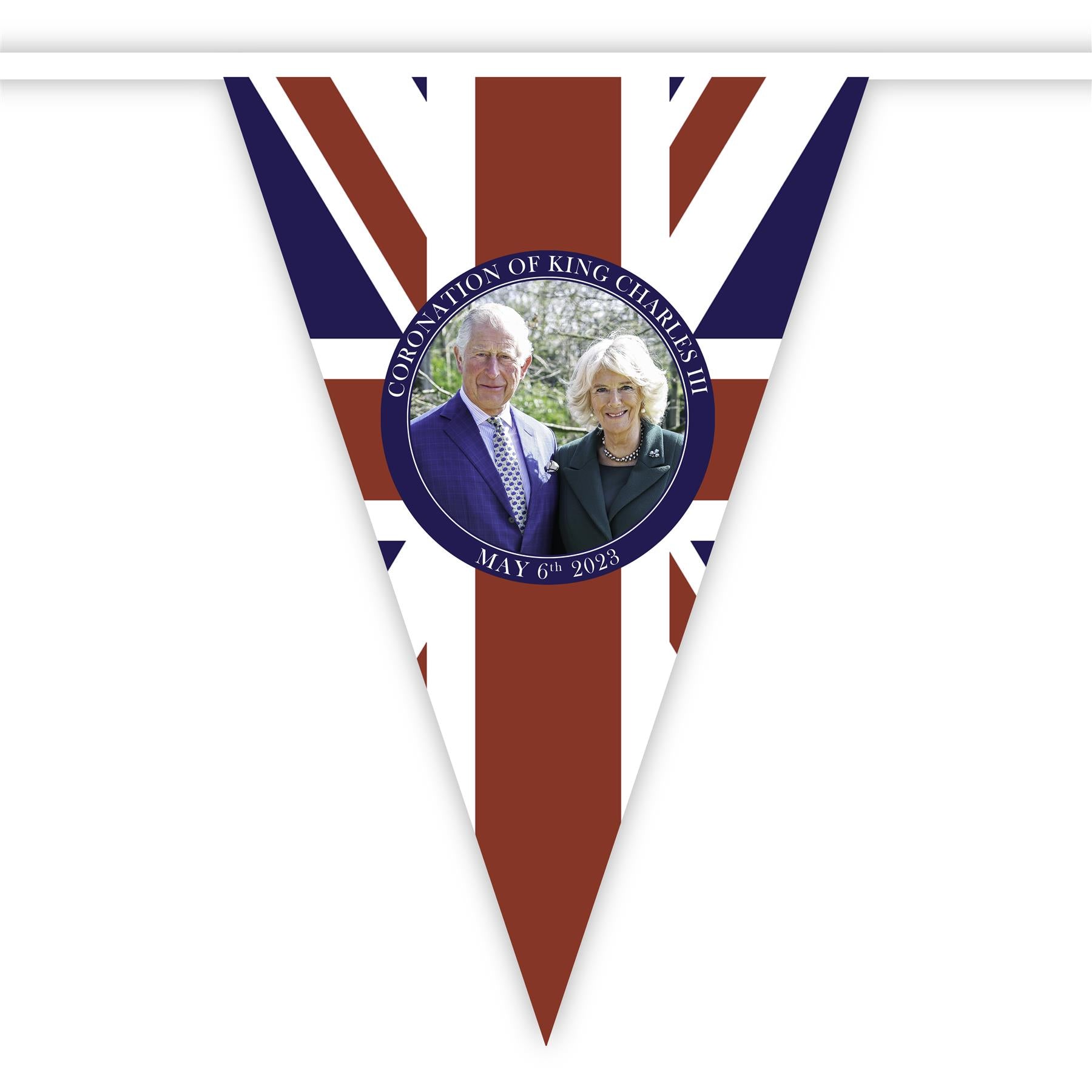 - the King's Coronation Decoration: Celebrate King's Coronation with our exclusively designed union jack bunting featuring HM King Charles III with Camilla Parker Queen Consort & new royal emblem or cipher.