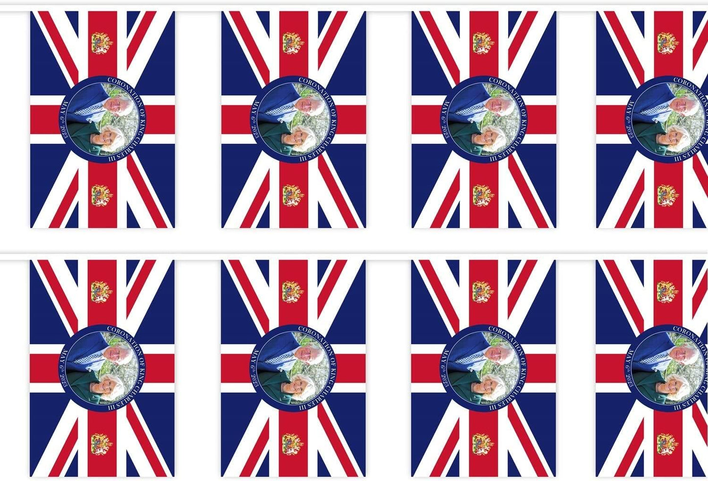 - King's Coronation Decoration: Celebrate the King's Coronation with our exclusively designed union jack bunting featuring HM King Charles III with Camilla Parker Queens Consort & National Emblem of Great Britain.