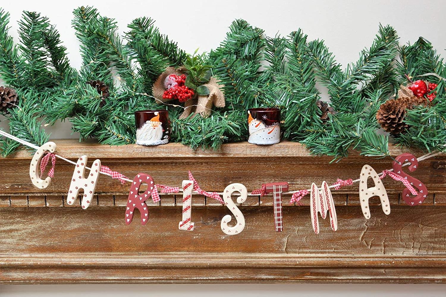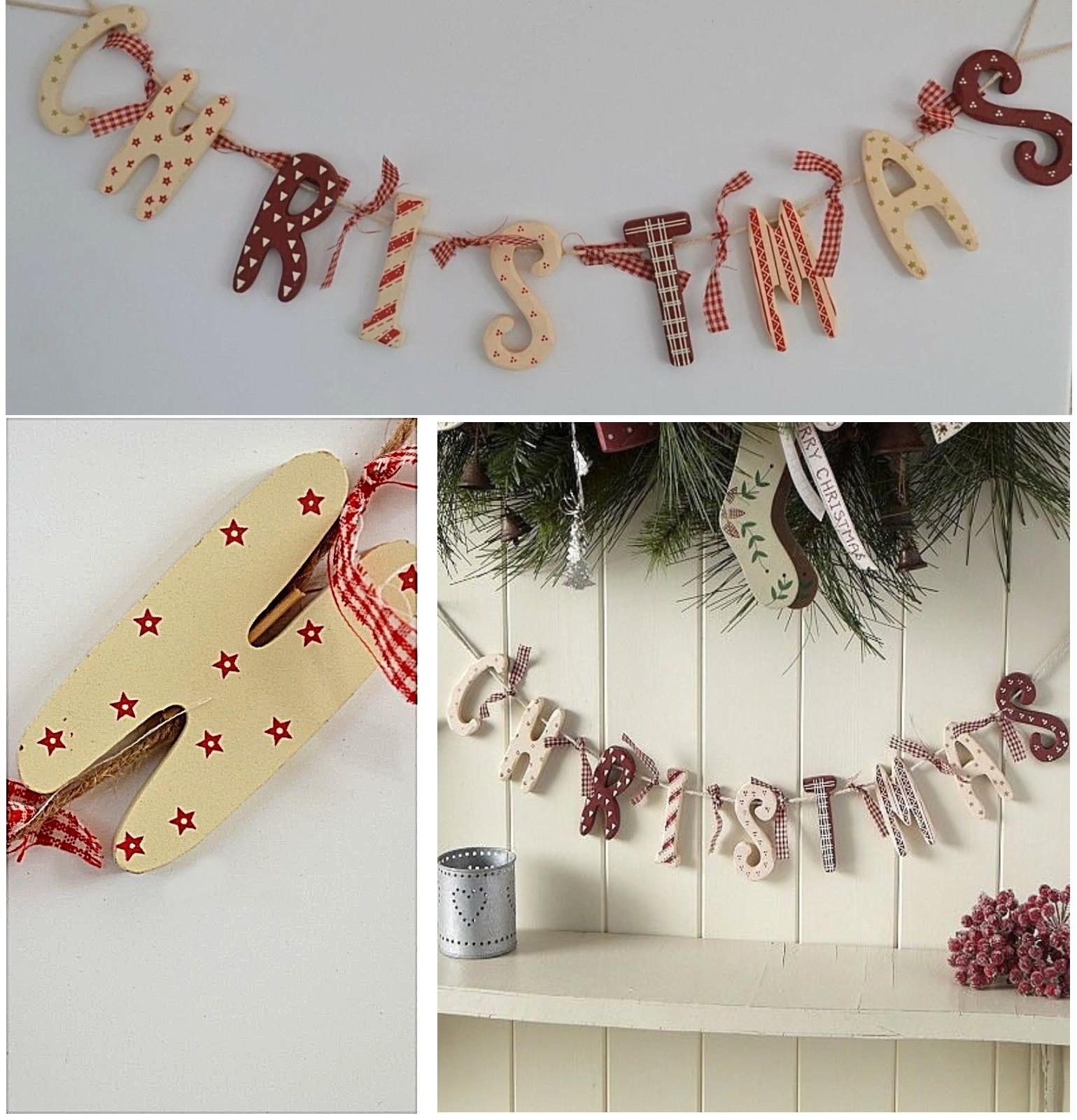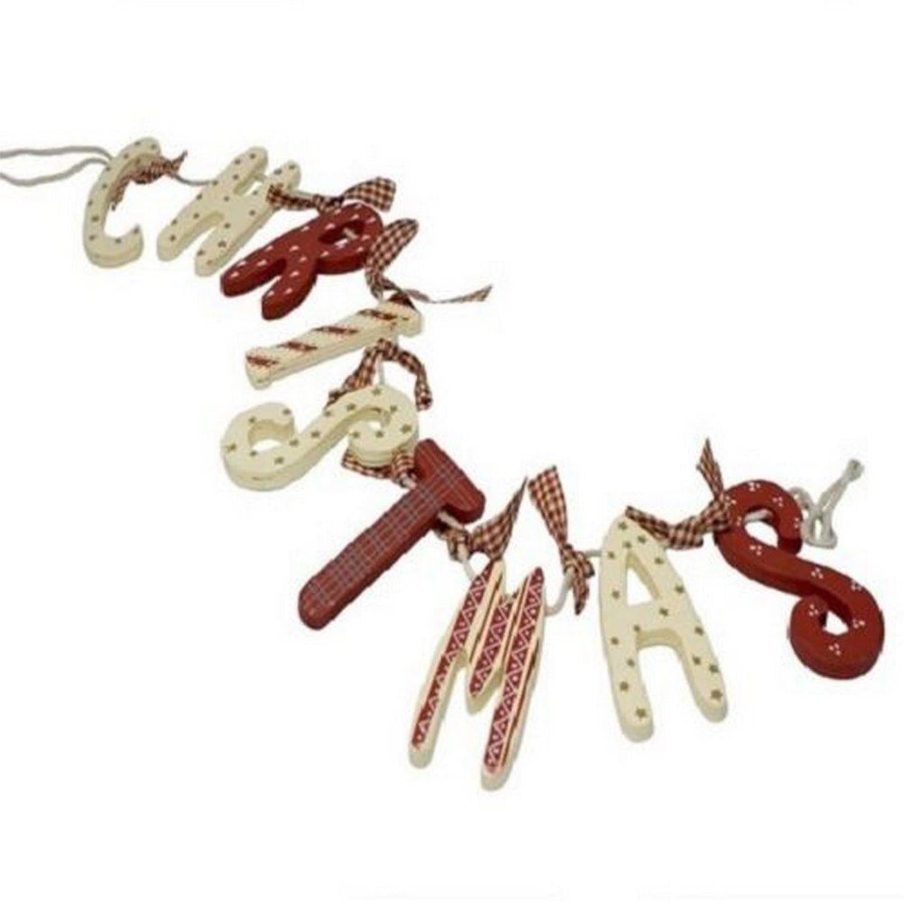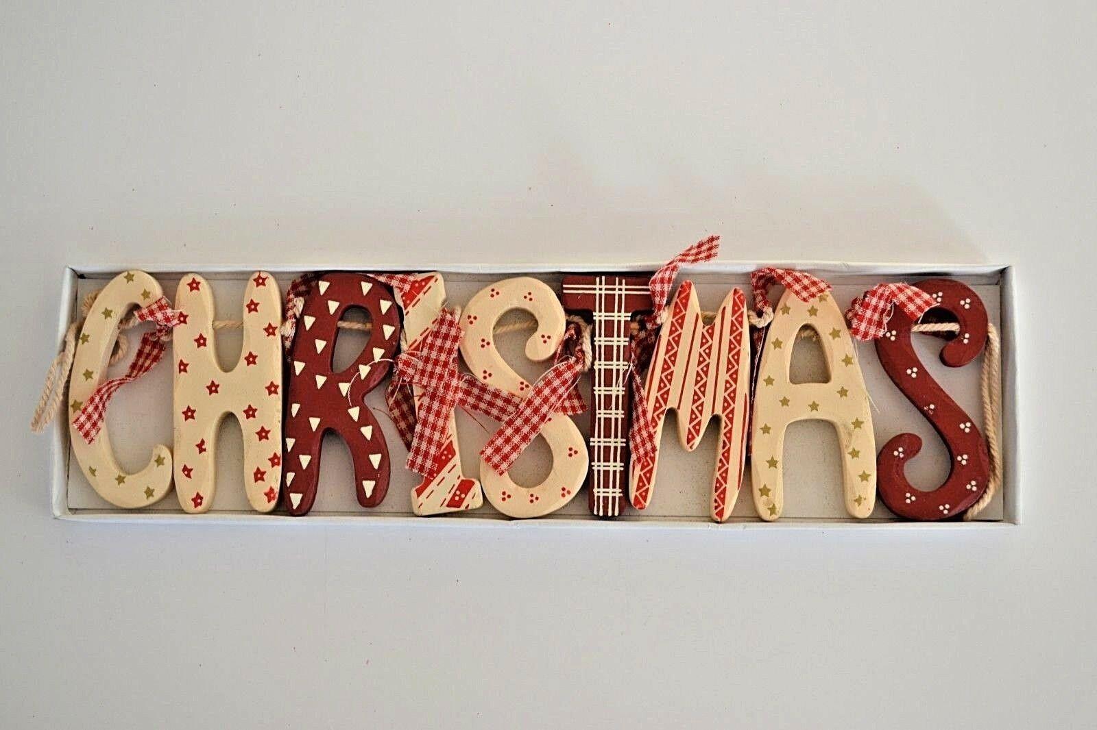 - Size Of Letters Approx 8 x 3.5 Cm. Colour: Red and cream. Material: Wood letters. In the Box: 1 x Wood Christmas garland.