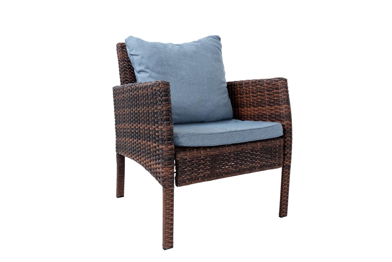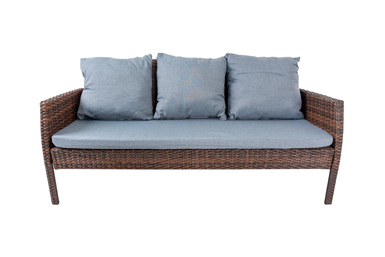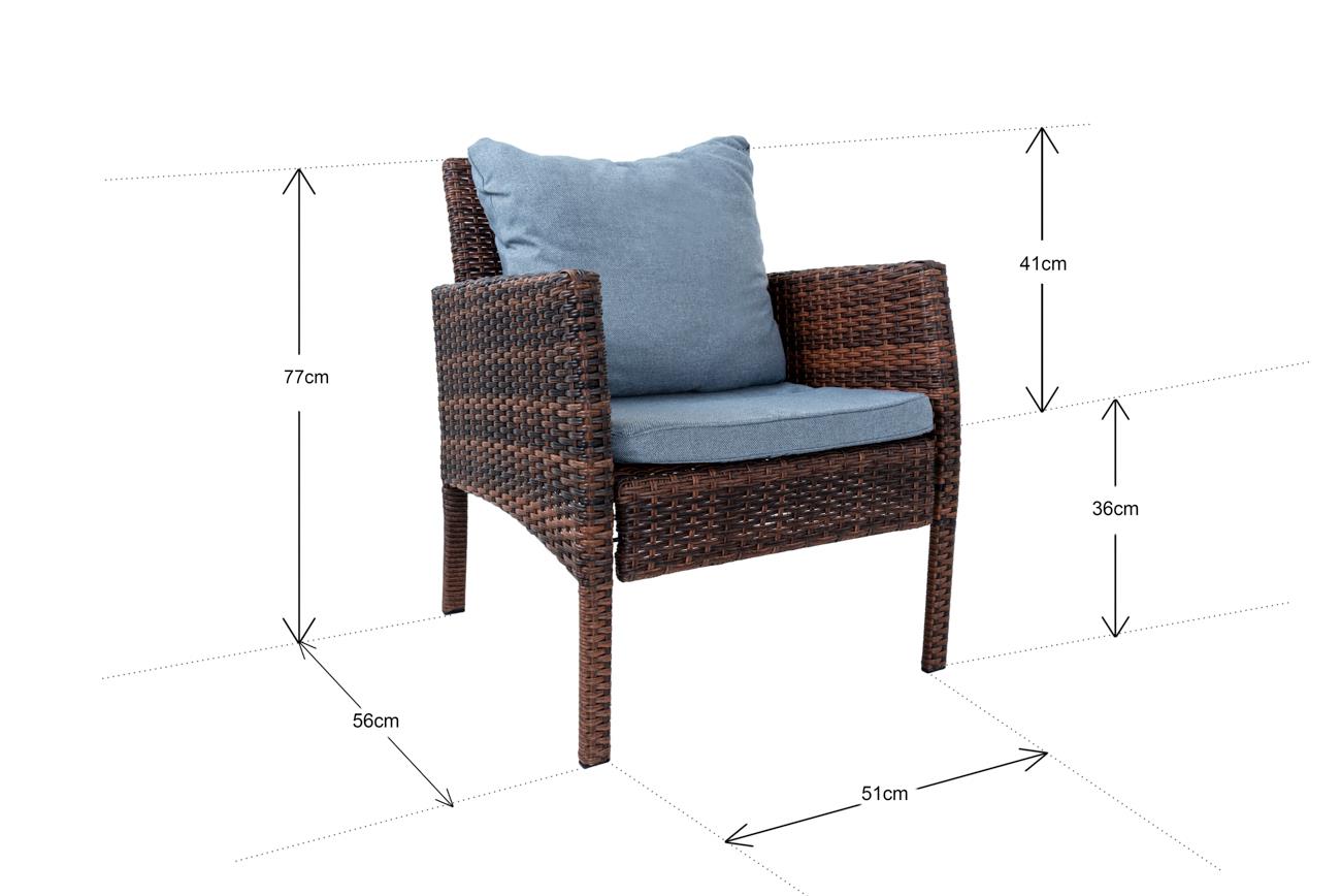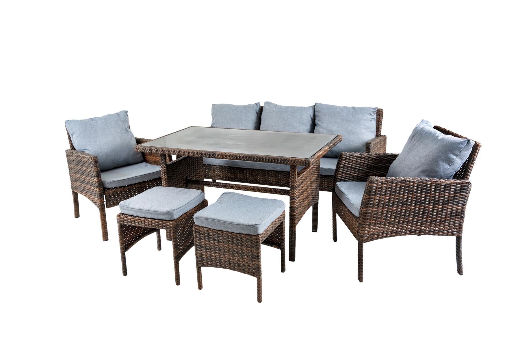 - The Set has dark brown color rattan material, 5mm toughened glass on top of the table, and light grey cushions covering on sofa and chair.