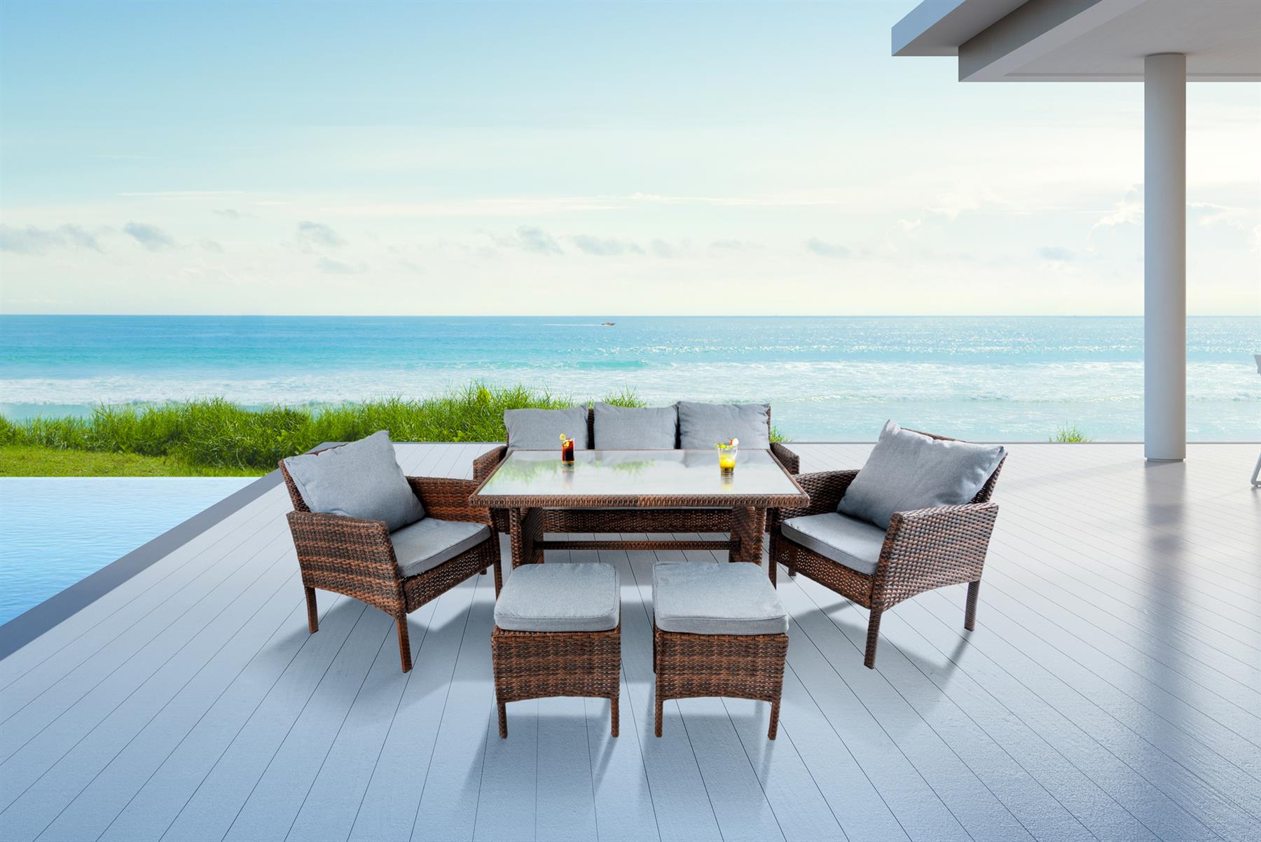 - Patio wicker sets include 1 Sofa, 1 rattan table, 2 rattan chairs, and 2 rattan stools.