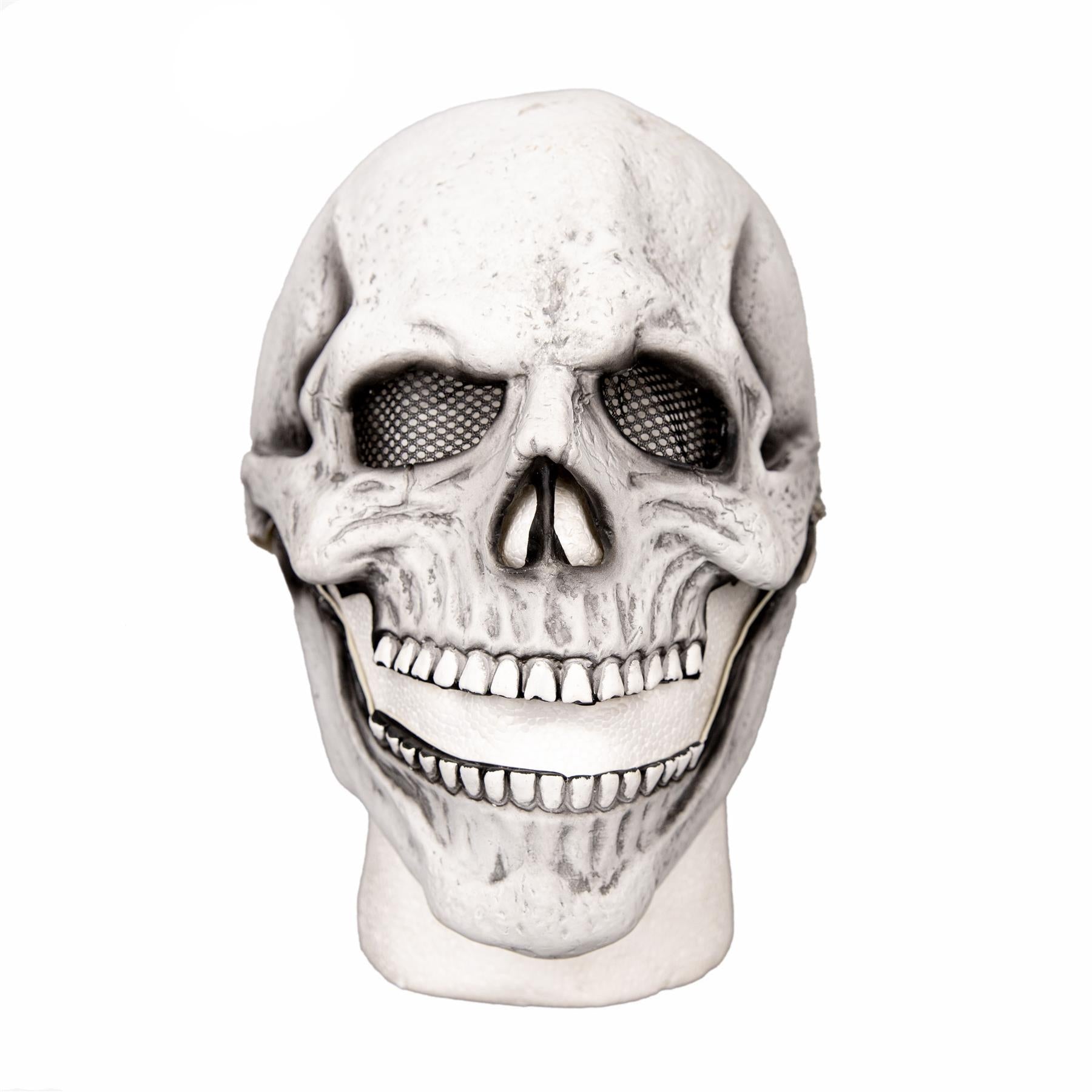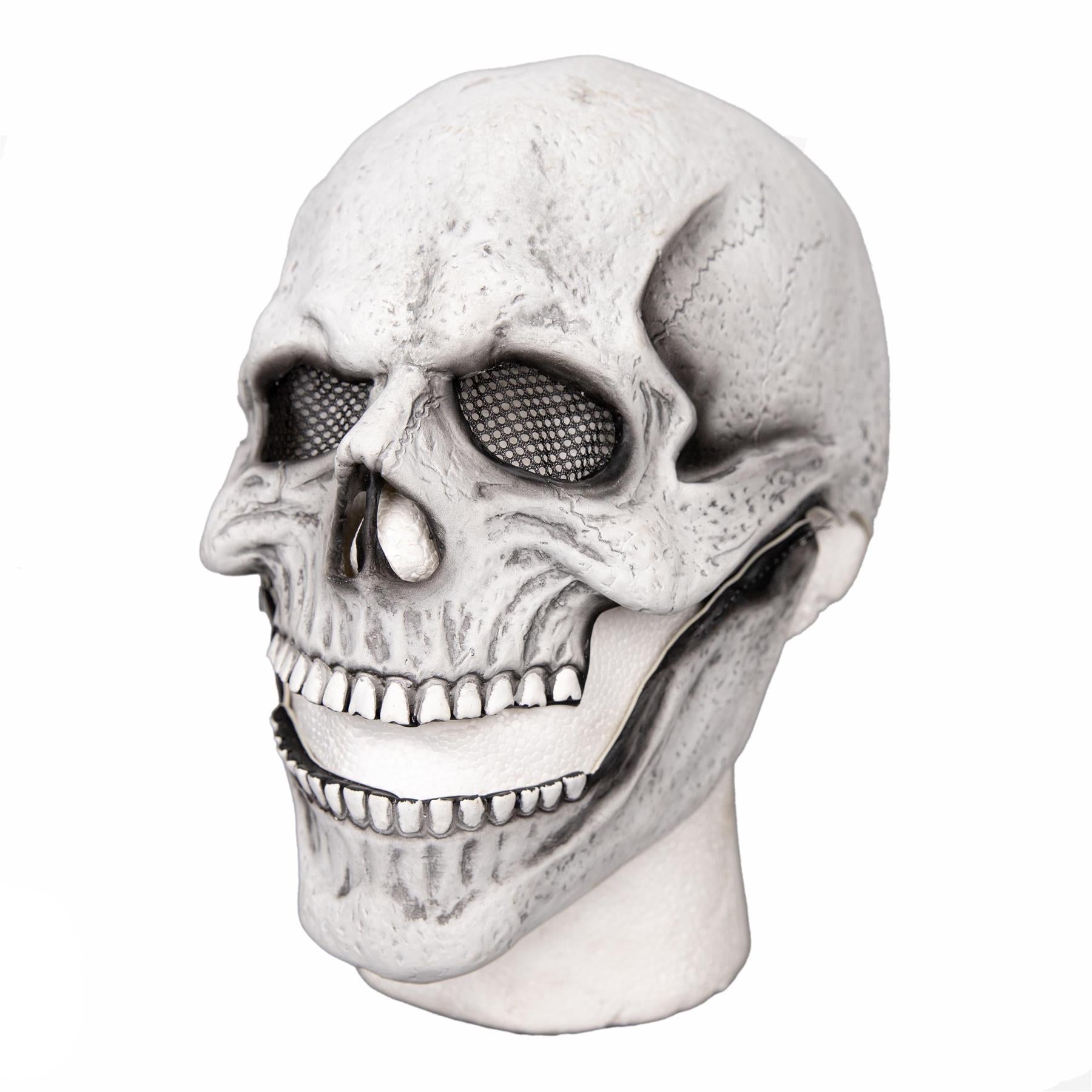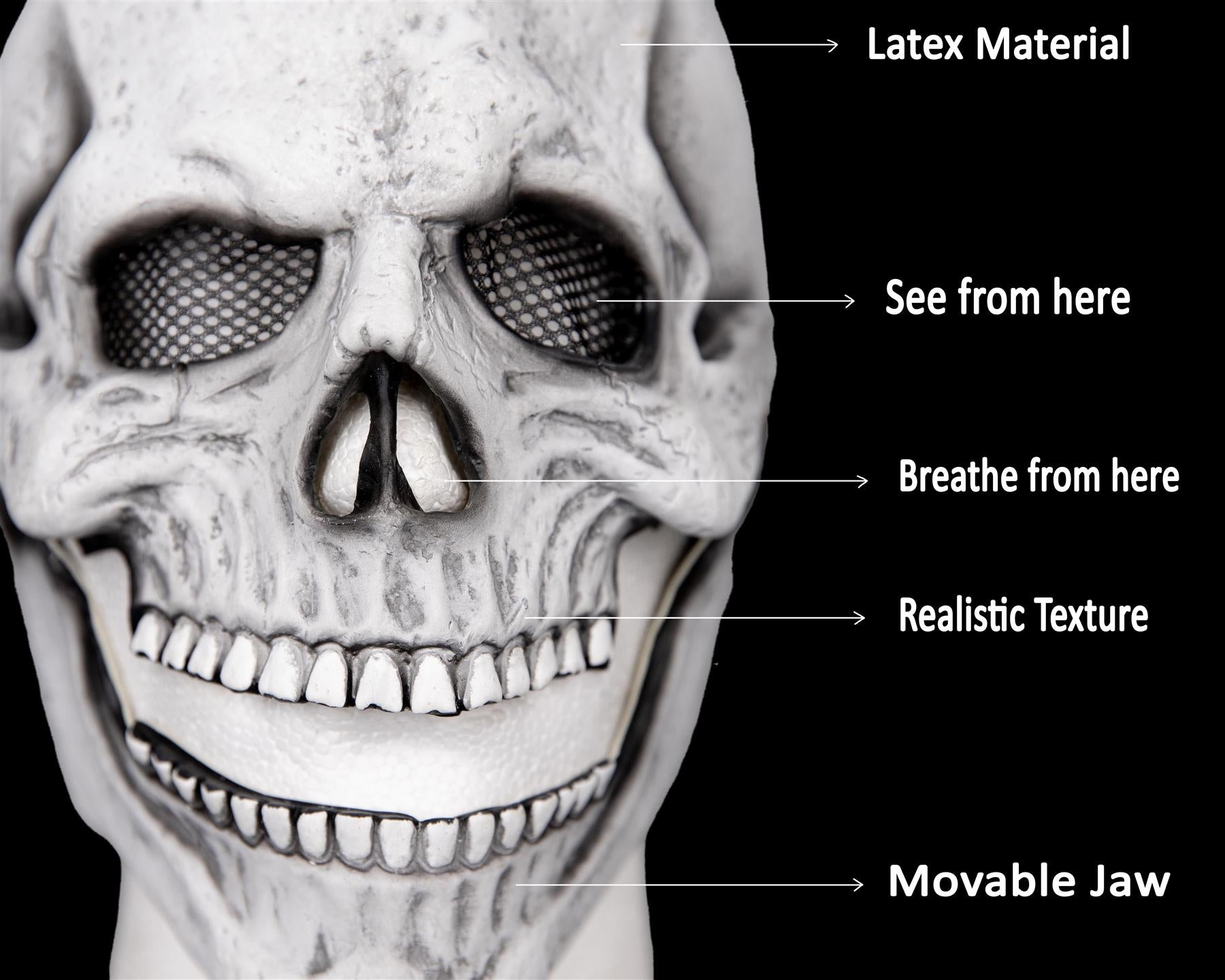 - Roomy enough to fit any child or adult. You can see through the eyes. This skull mask has with movable creepy jaw design.