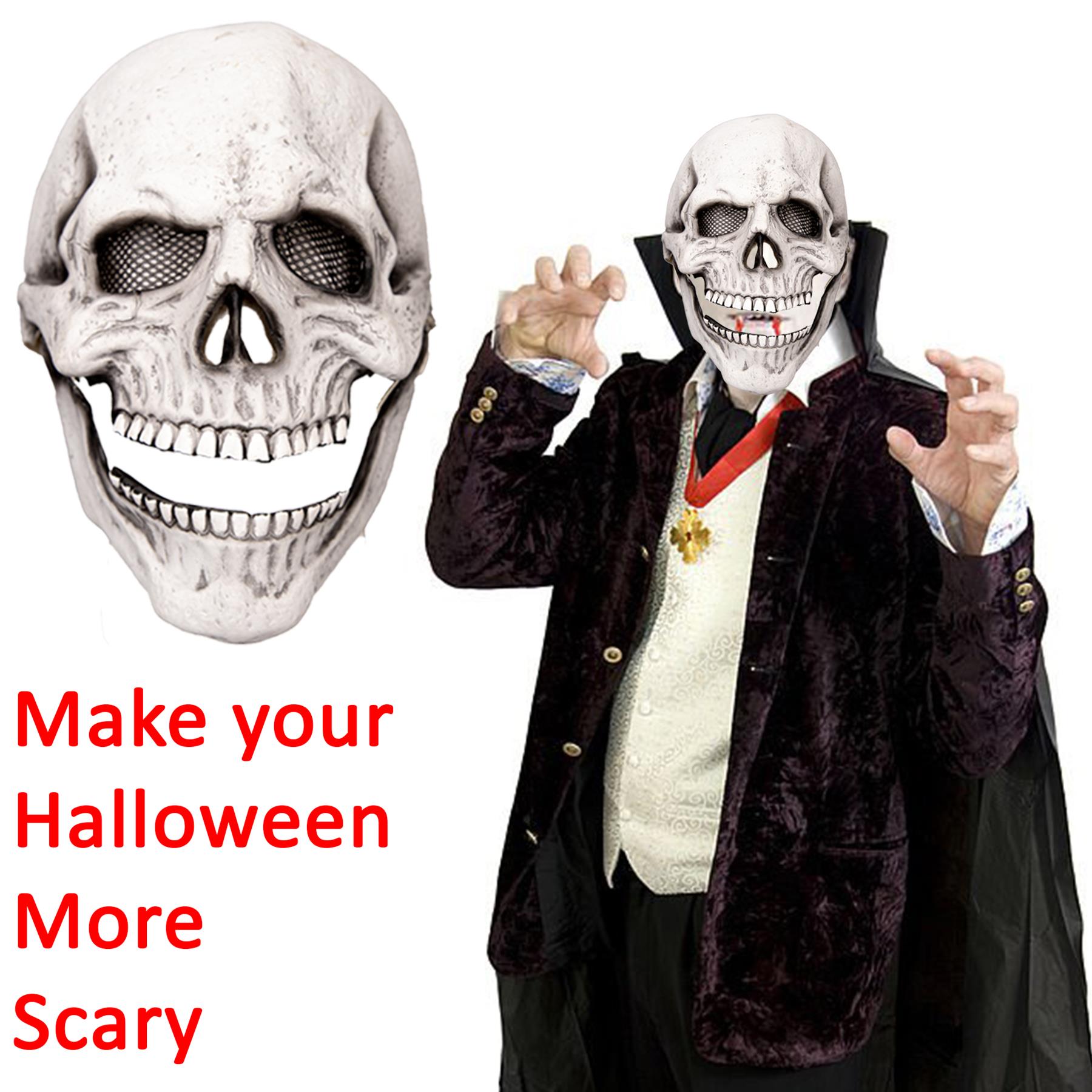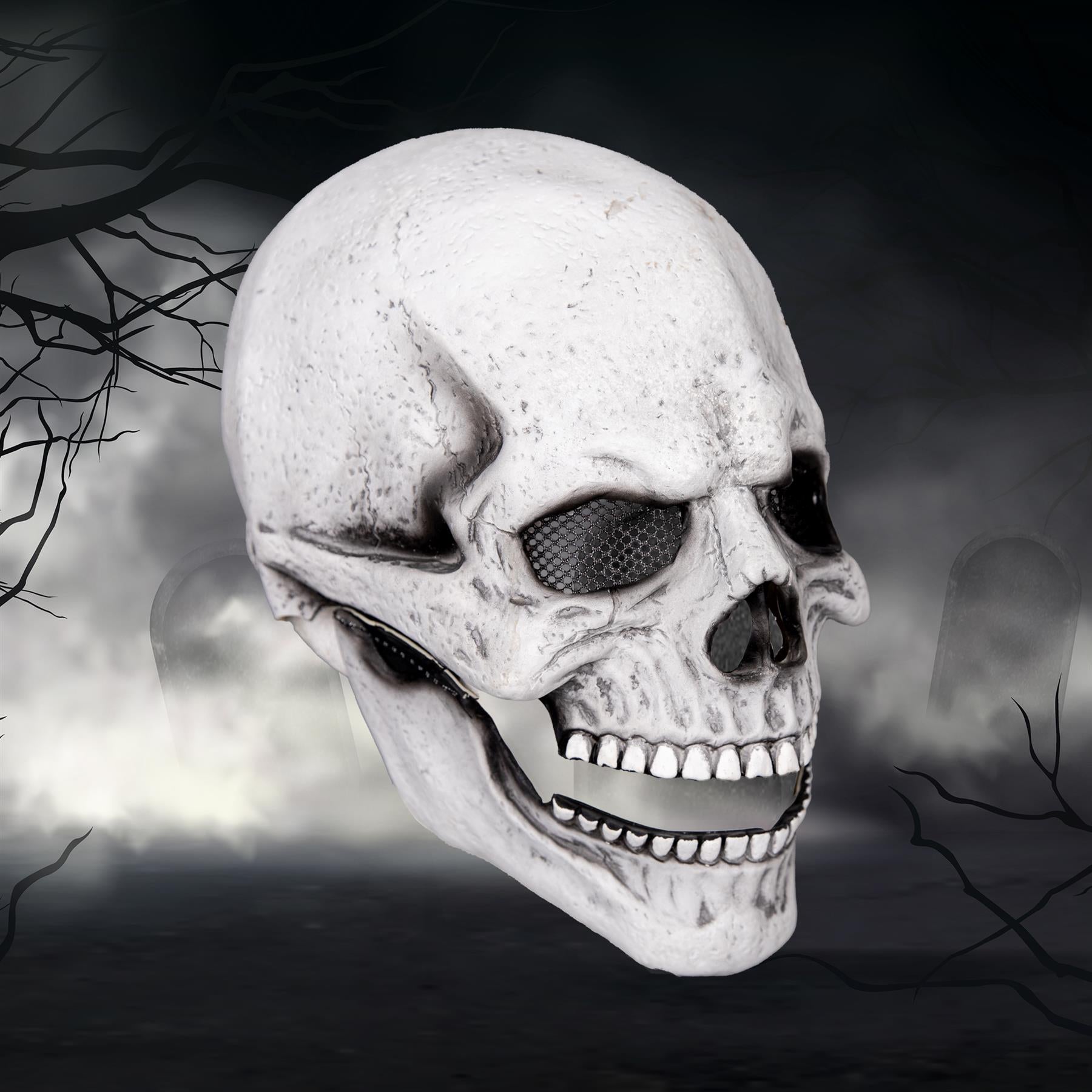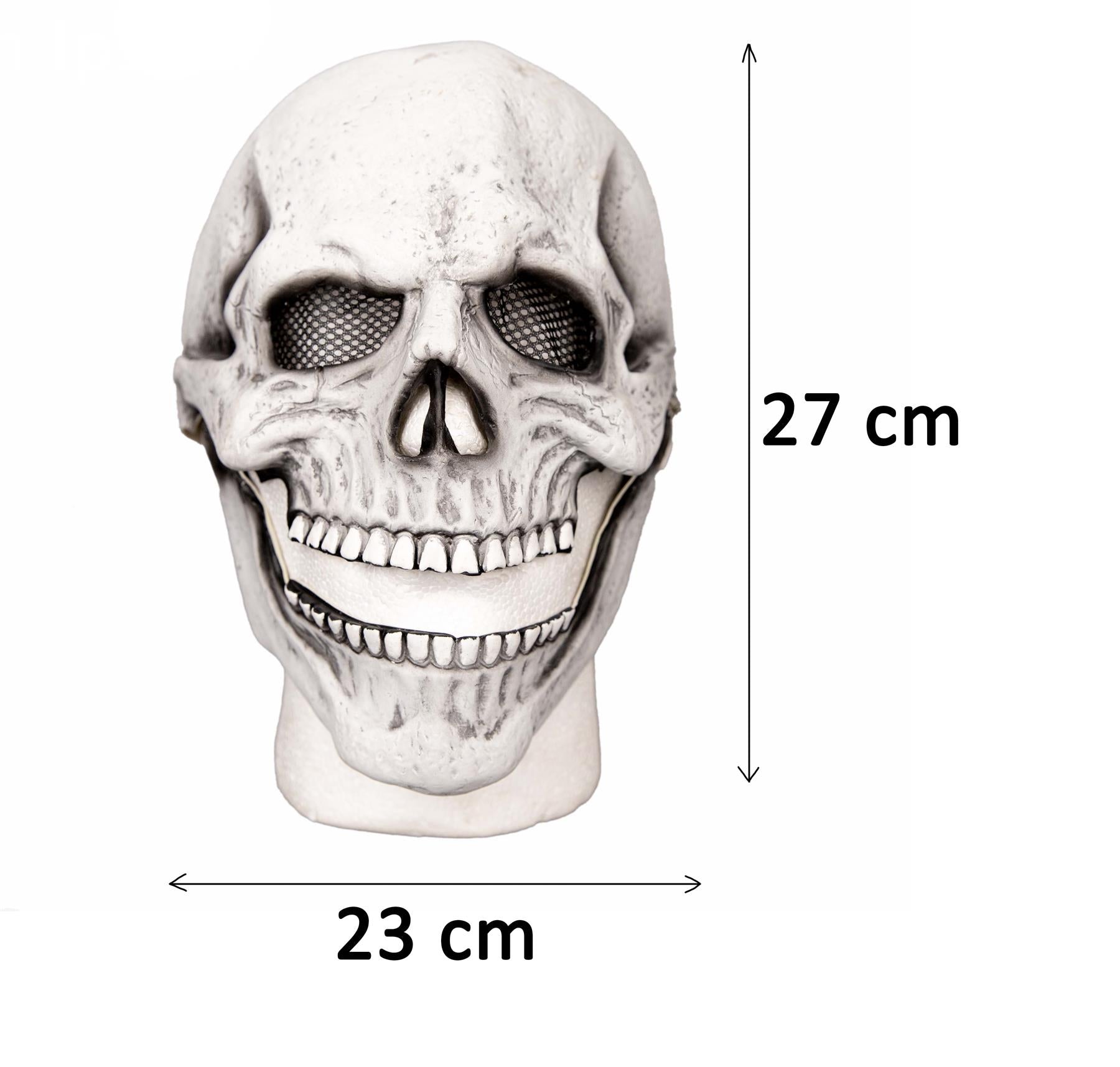 - Roomy enough to fit any child or adult. You can see through the eyes. This skull mask has with movable creepy jaw design.