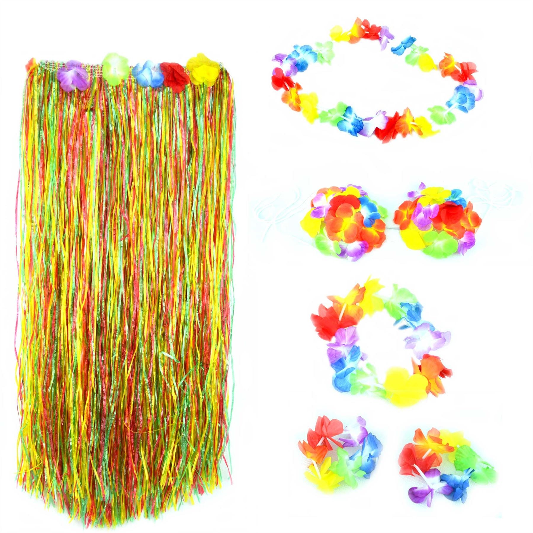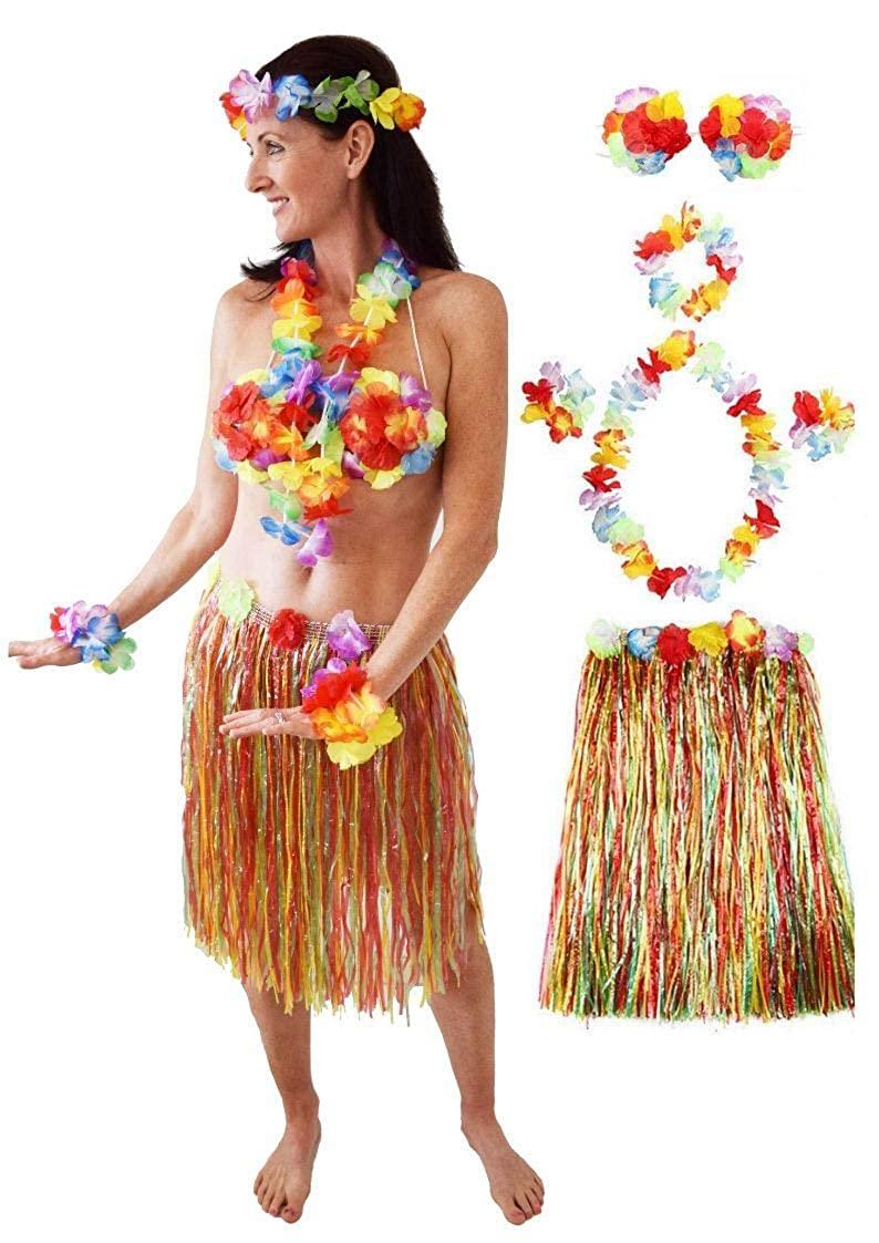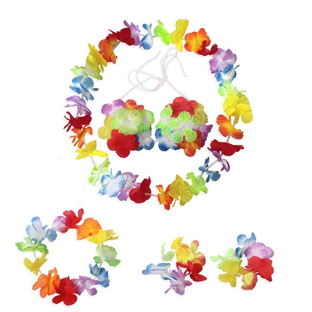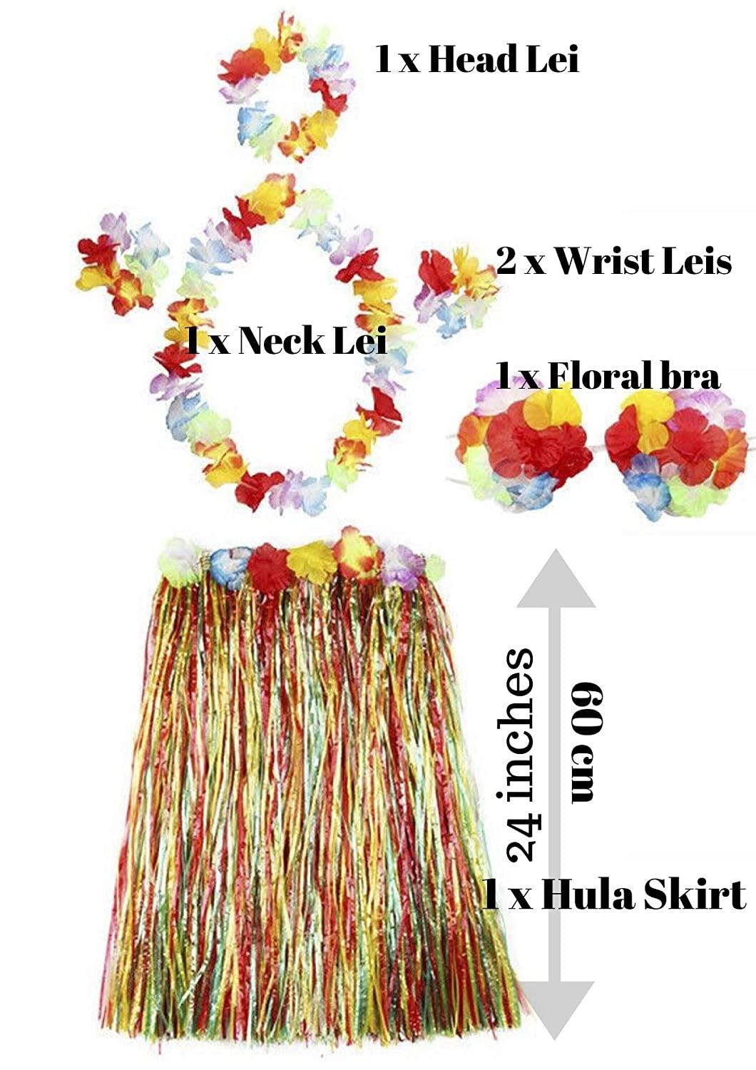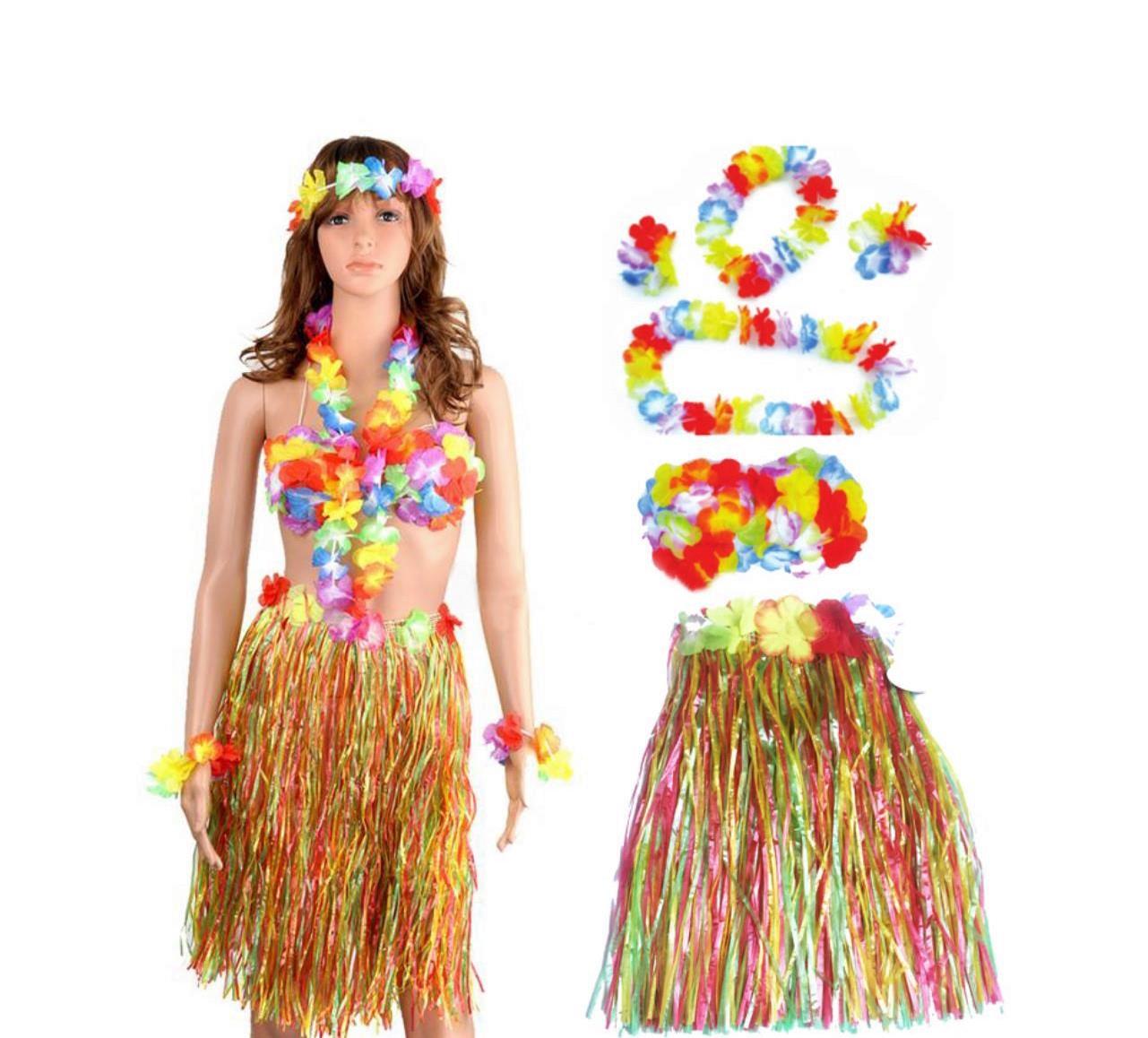 - This Hawaiian Fancy Dress 6pcs set includes Hawaiian Multi-Coloured Lei Flower Design: 1 head Garland, 1 neck garland and 2 pieces of wrist bracelets, 1 flower bra, and 1 nylon skirt Hawaiian Lei Flower Garlands are fashion set for beach tourists or festival parties.