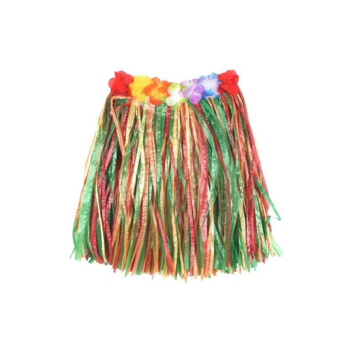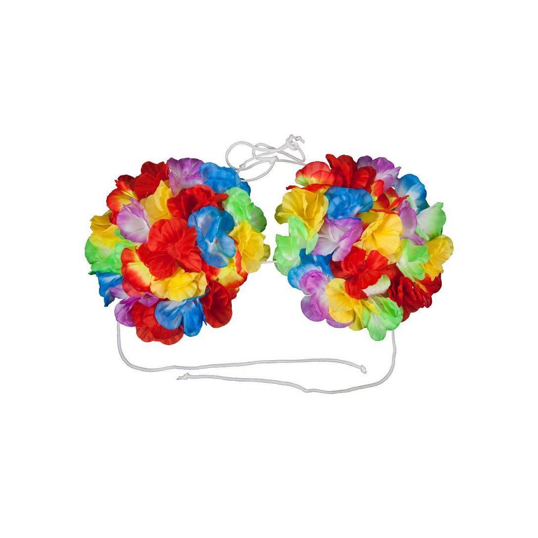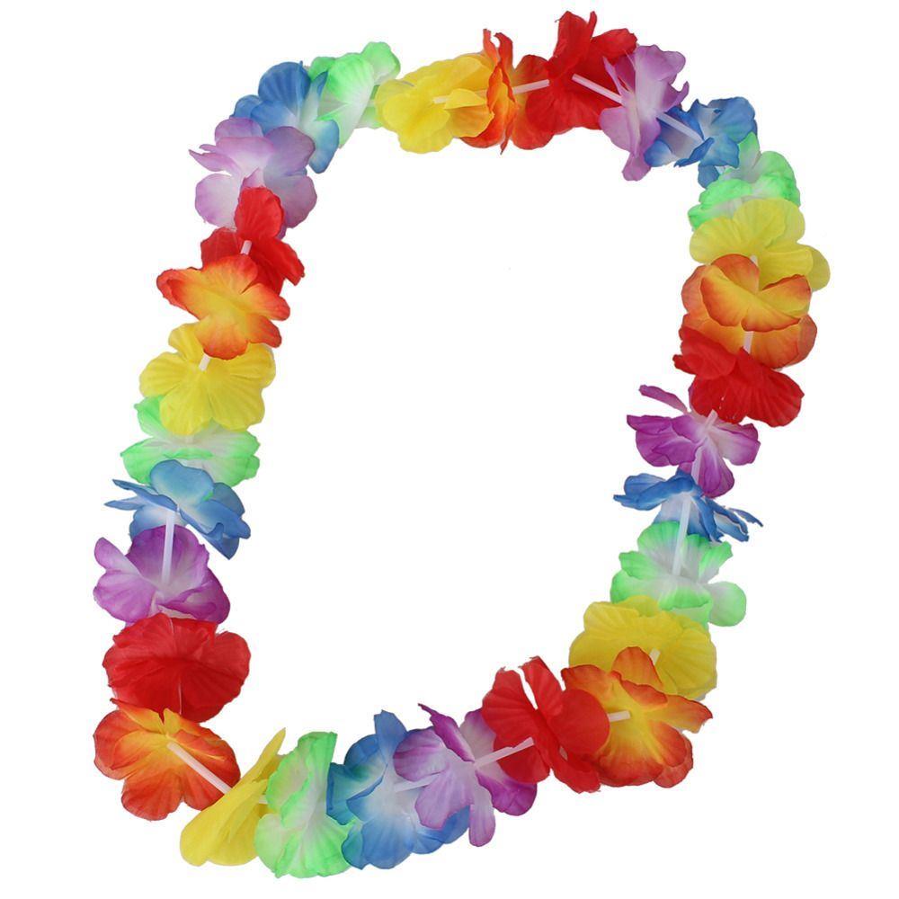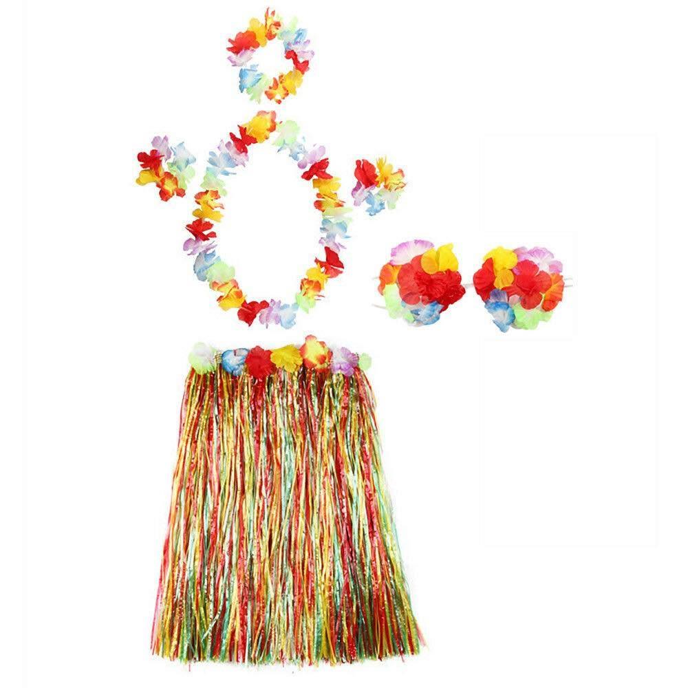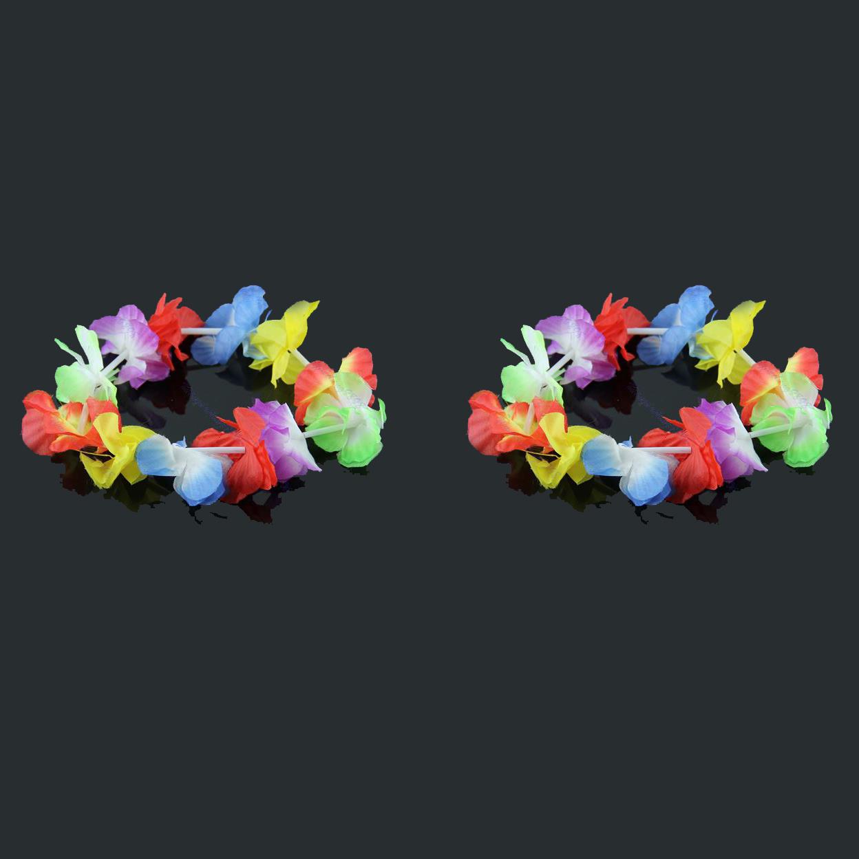 - This Hawaiian Fancy Dress 6pcs set includes Hawaiian Multi-Coloured Lei Flower Design: 1 head Garland, 1 neck garland and 2 pieces of wrist bracelets, 1 flower bra, and 1 nylon skirt Hawaiian Lei Flower Garlands are fashion set for beach tourists or festival parties.