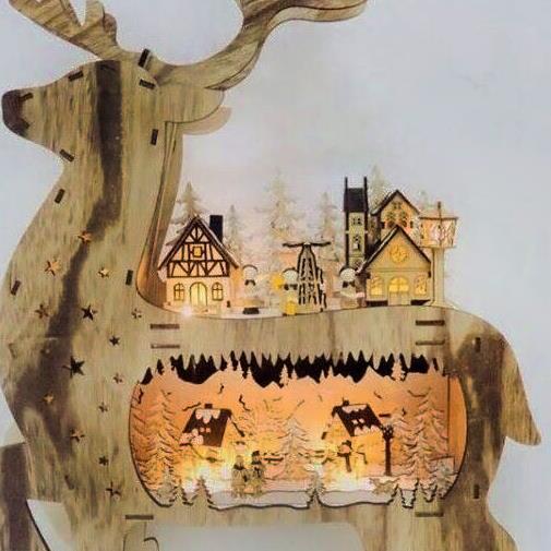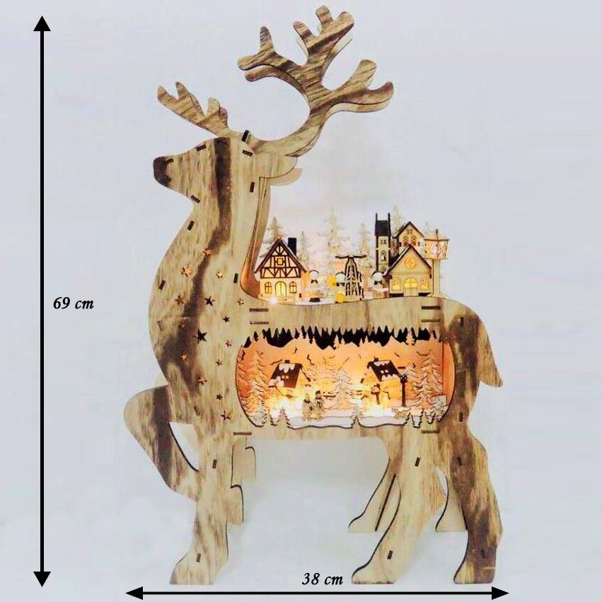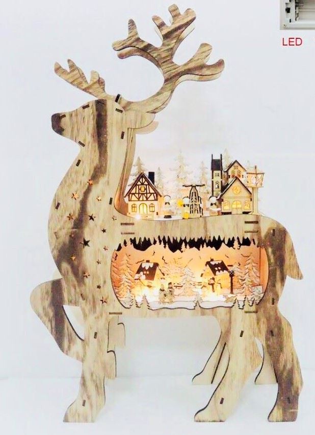 - LED Light Up Warm White, Battery Operated, requires 2 x AA Batteries (Not Included), Size: Approx. 38x11x69 cm, Laser Cut Wooden Frame. Order Quantity: 1 x Front Facing Wooden LED Reindeer.