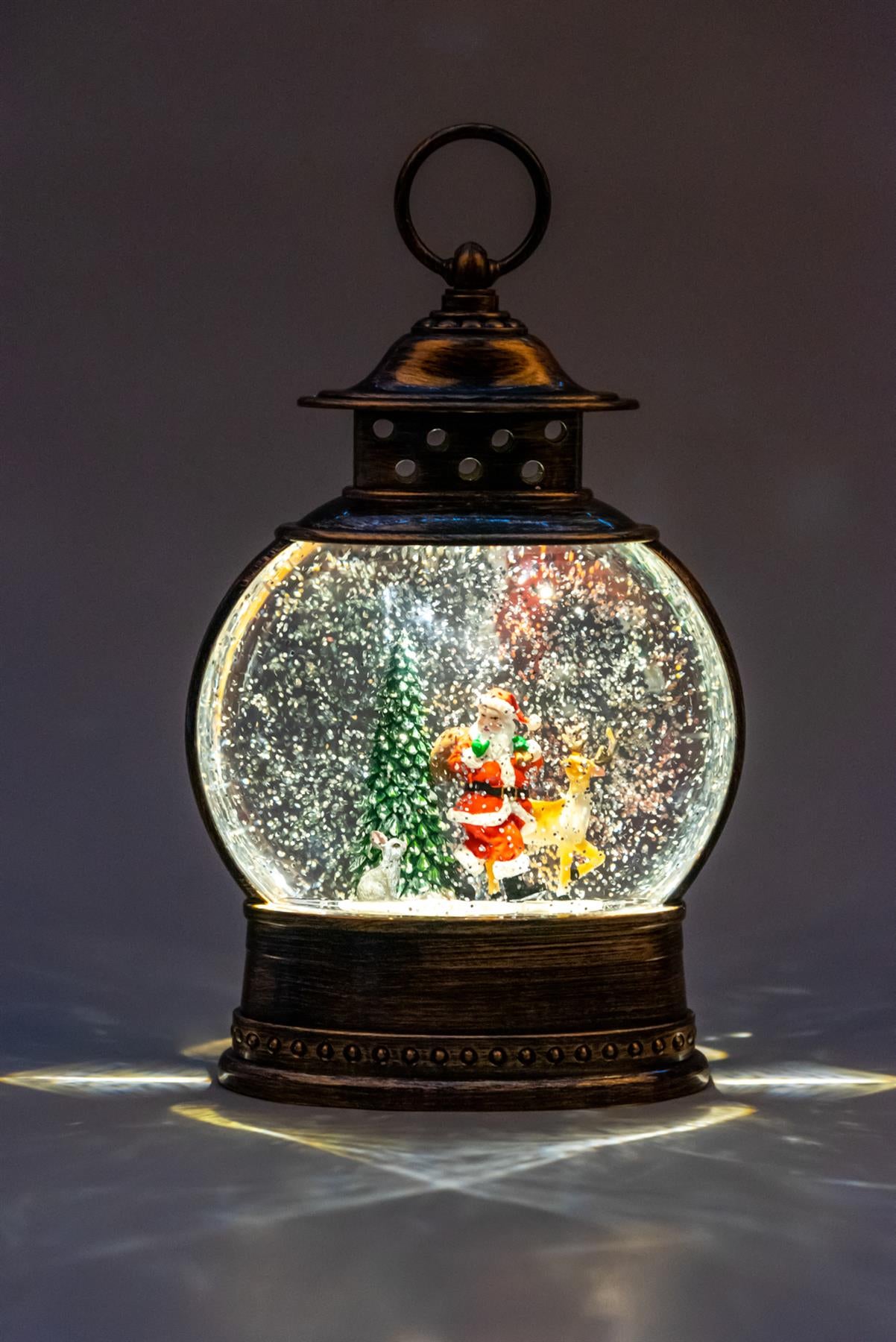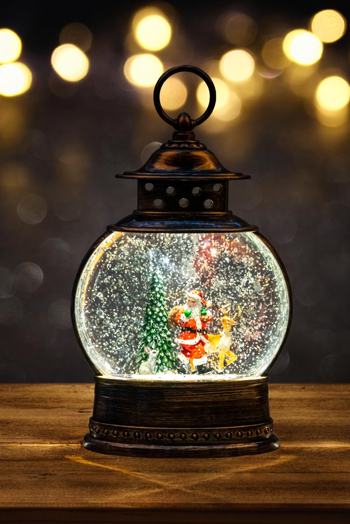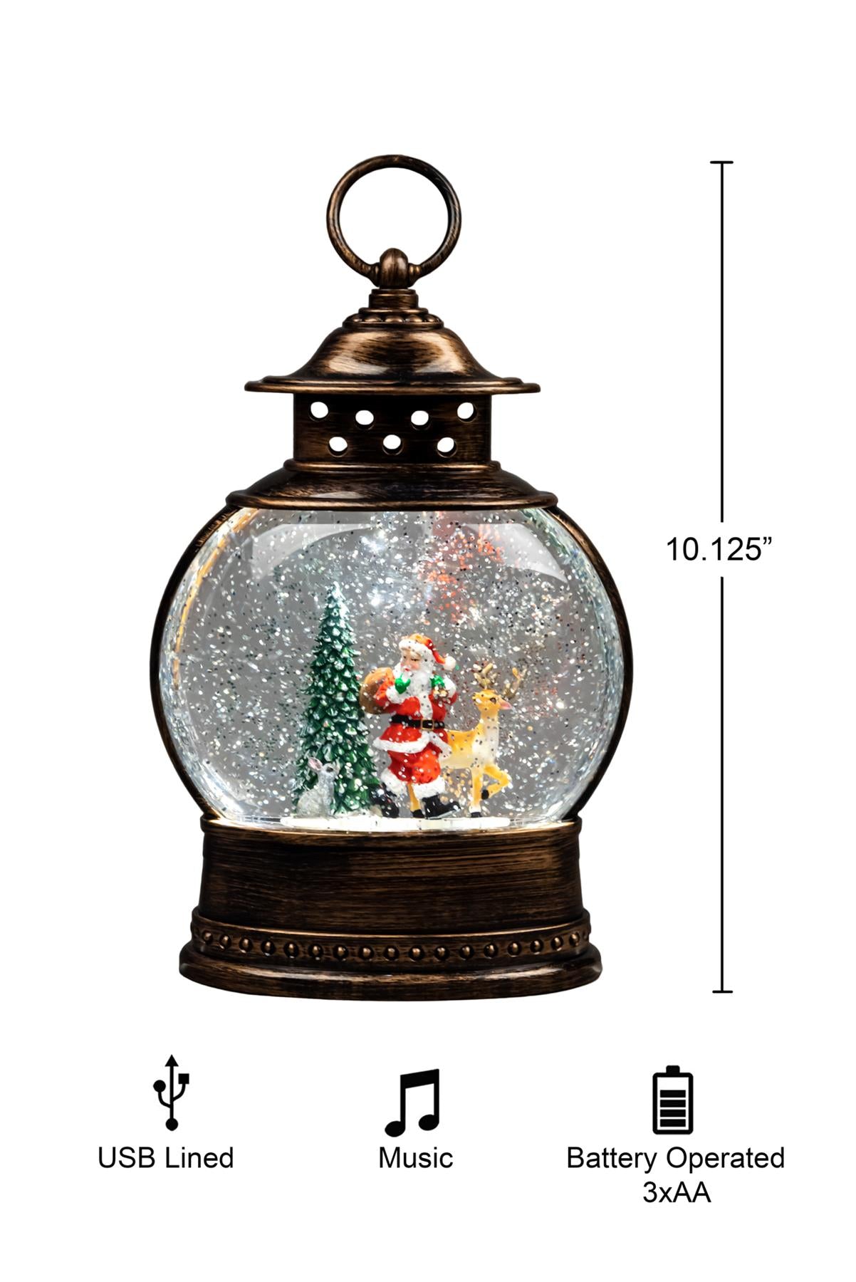 - Swirling glitter crystals run around with water, and the warm LED light brings us a warm feeling. Bronze Christmas lantern globe with Christmas theme music captures the full of the special elated festival.