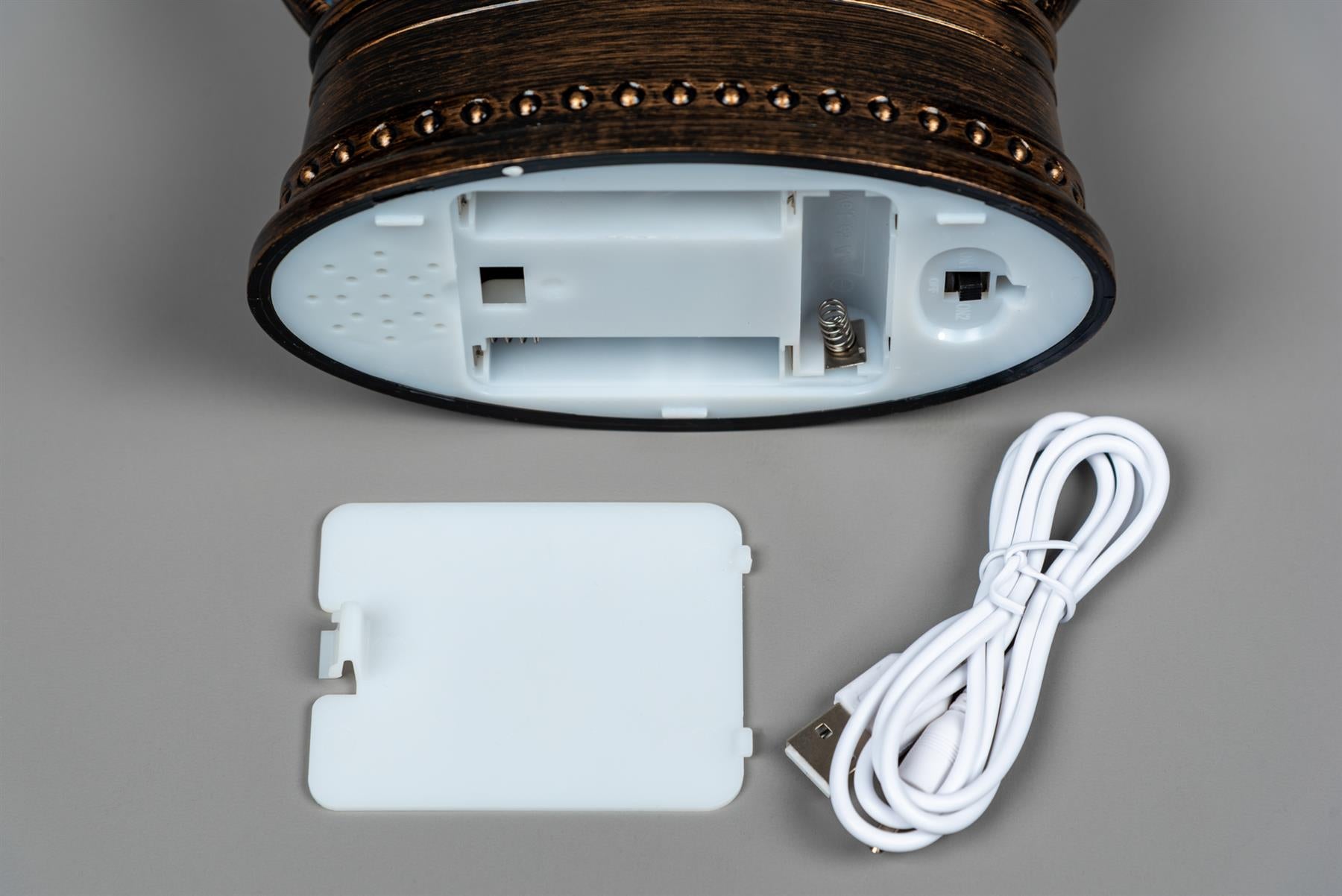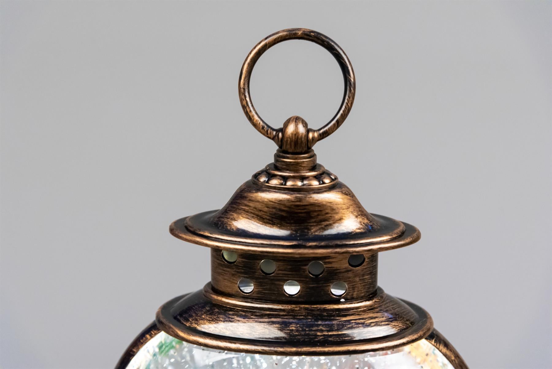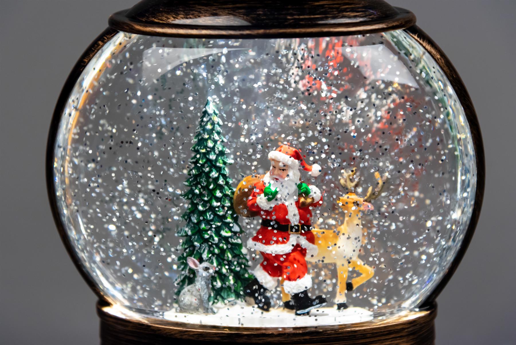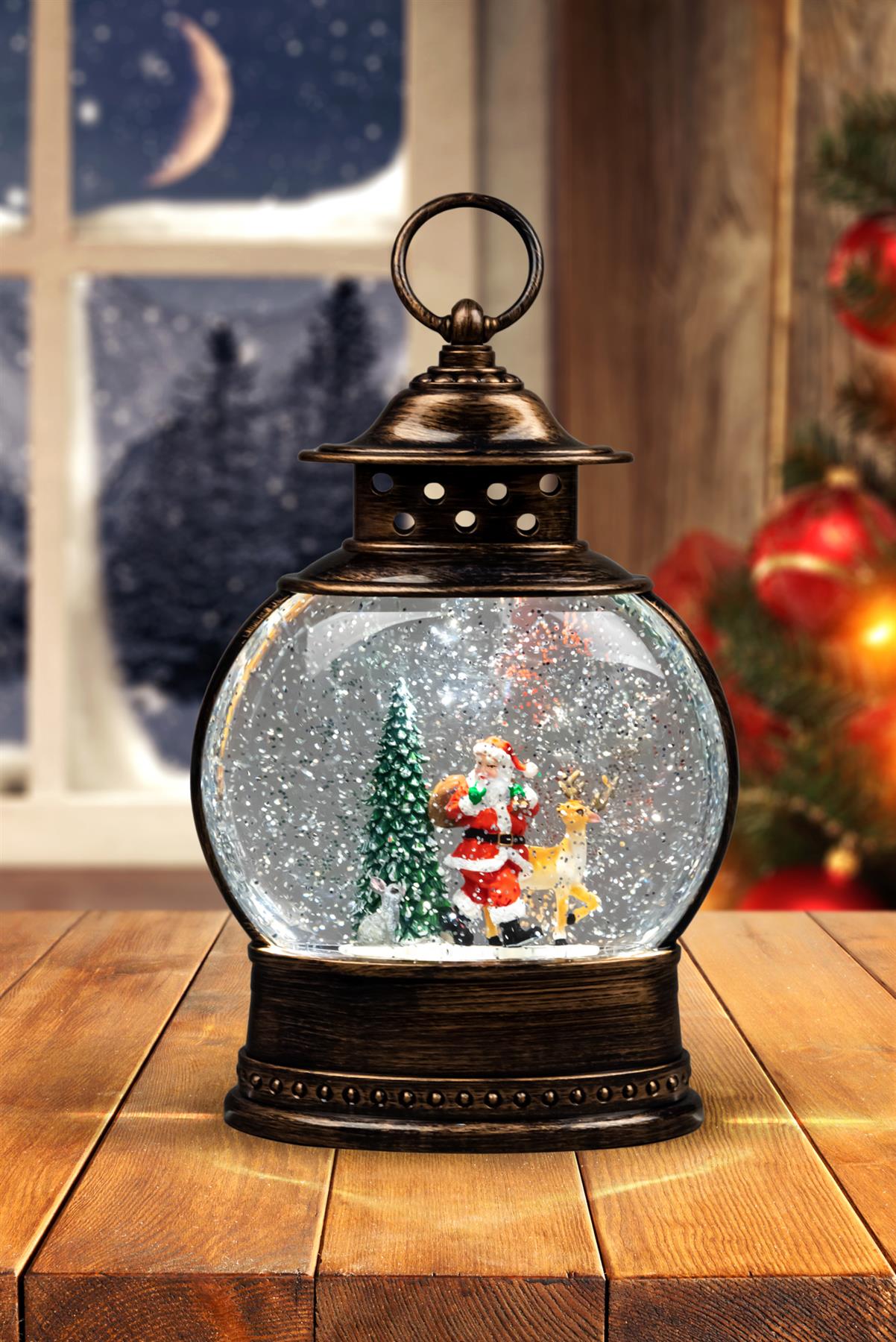 - Swirling glitter crystals run around with water, and the warm LED light brings us a warm feeling. Bronze Christmas lantern globe with Christmas theme music captures the full of the special elated festival.