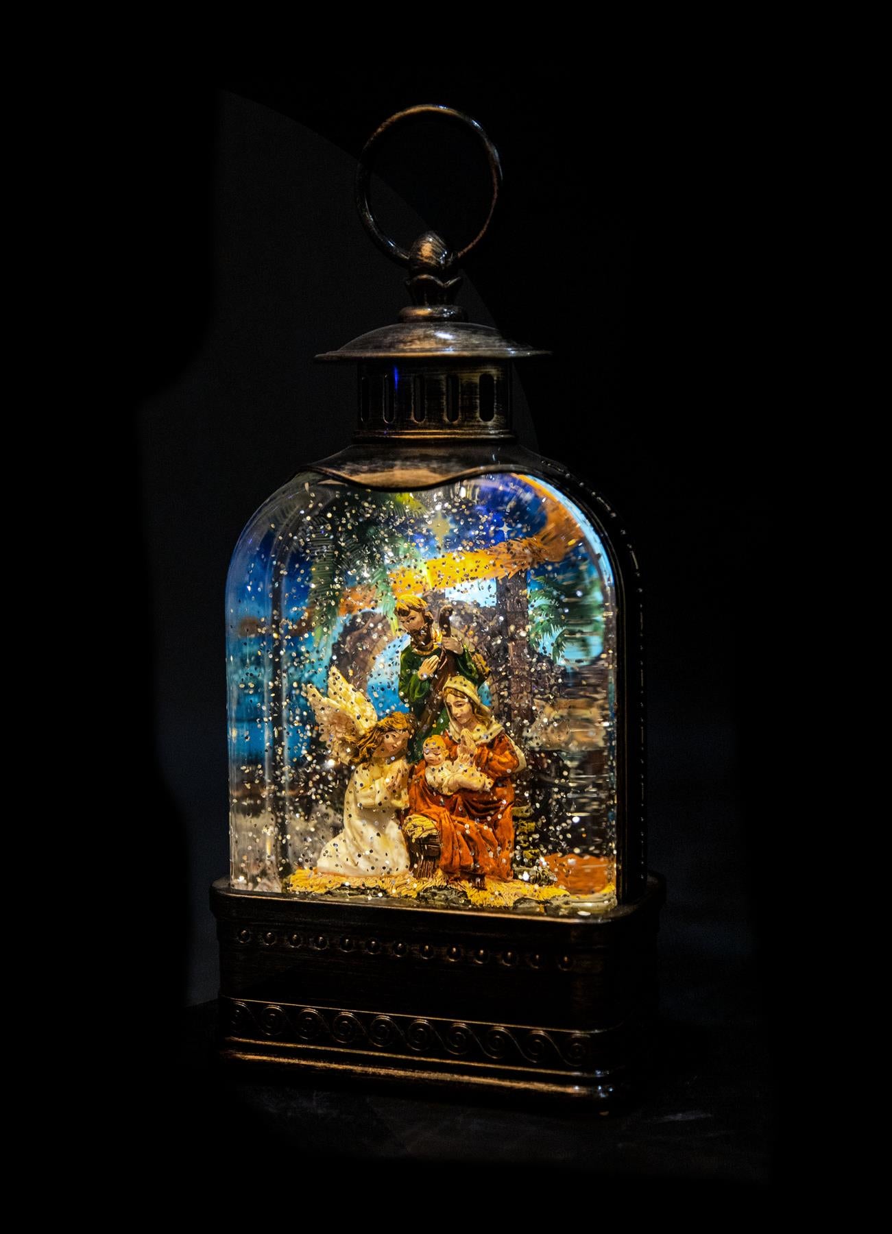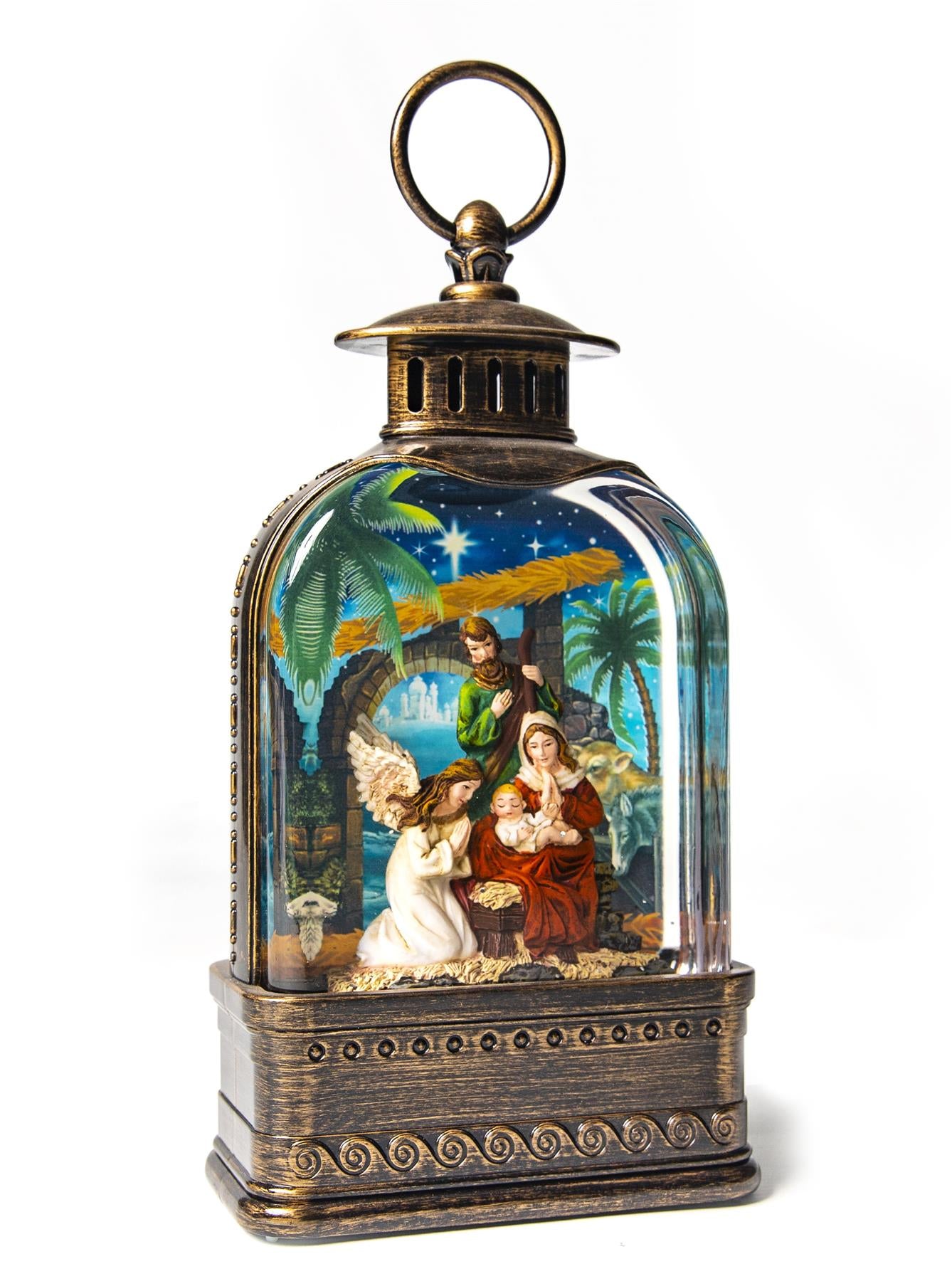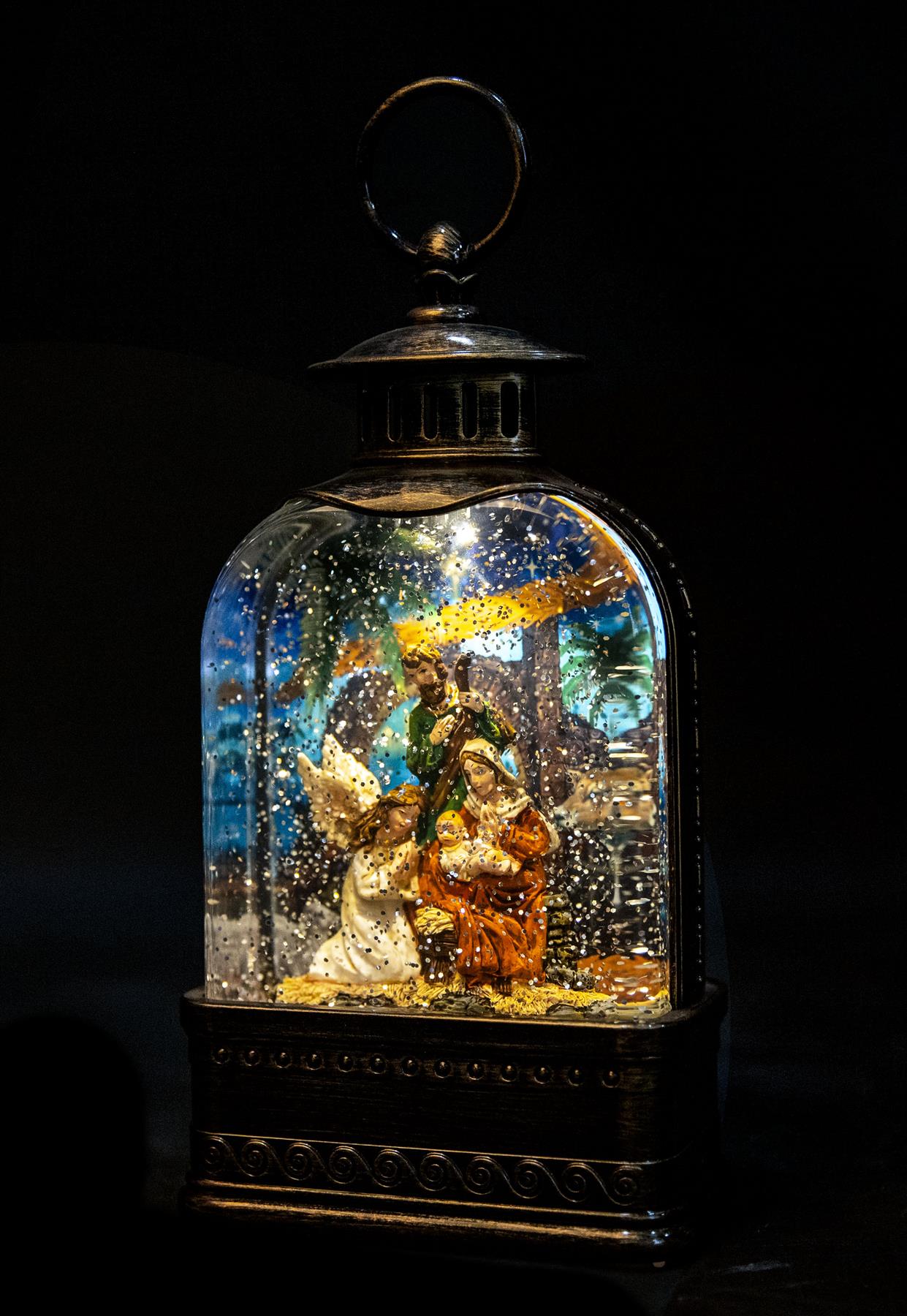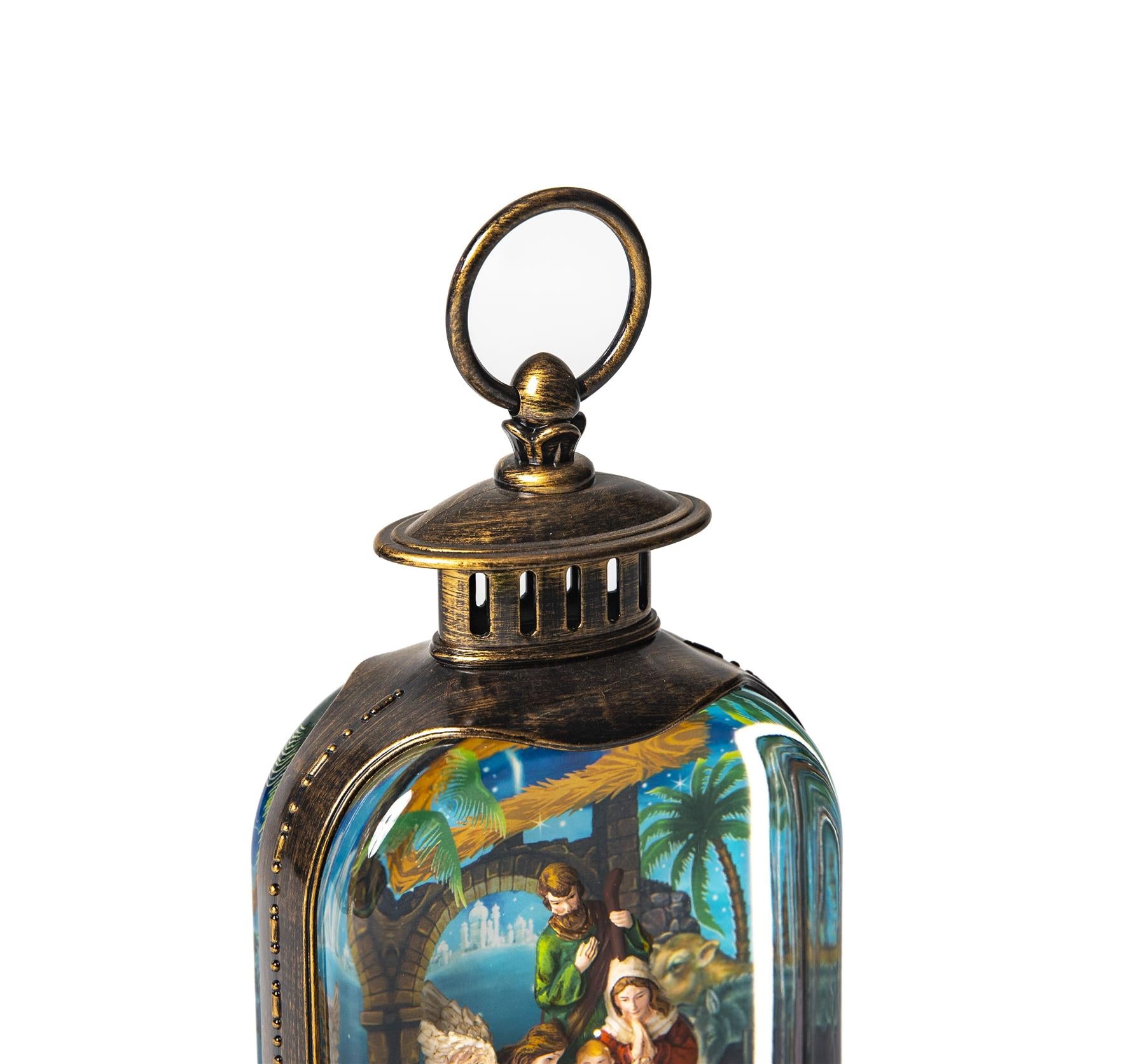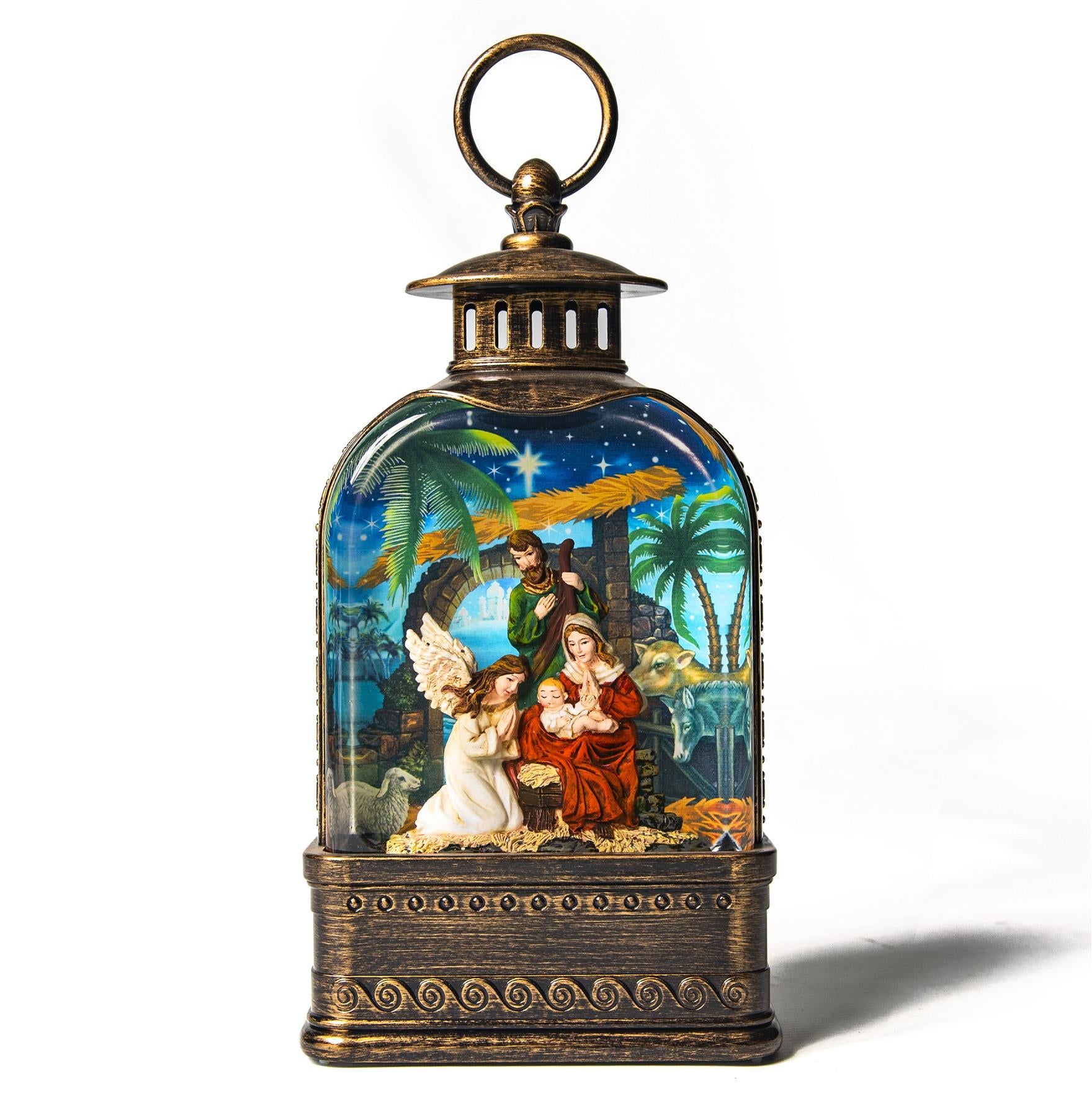 - Add a festive glow to your home with this automatic perpetual swirling snow LED retro lantern. Designed in an Antique Bronze finish, the lantern contains glittery water and a holy Jesus Birth scene.