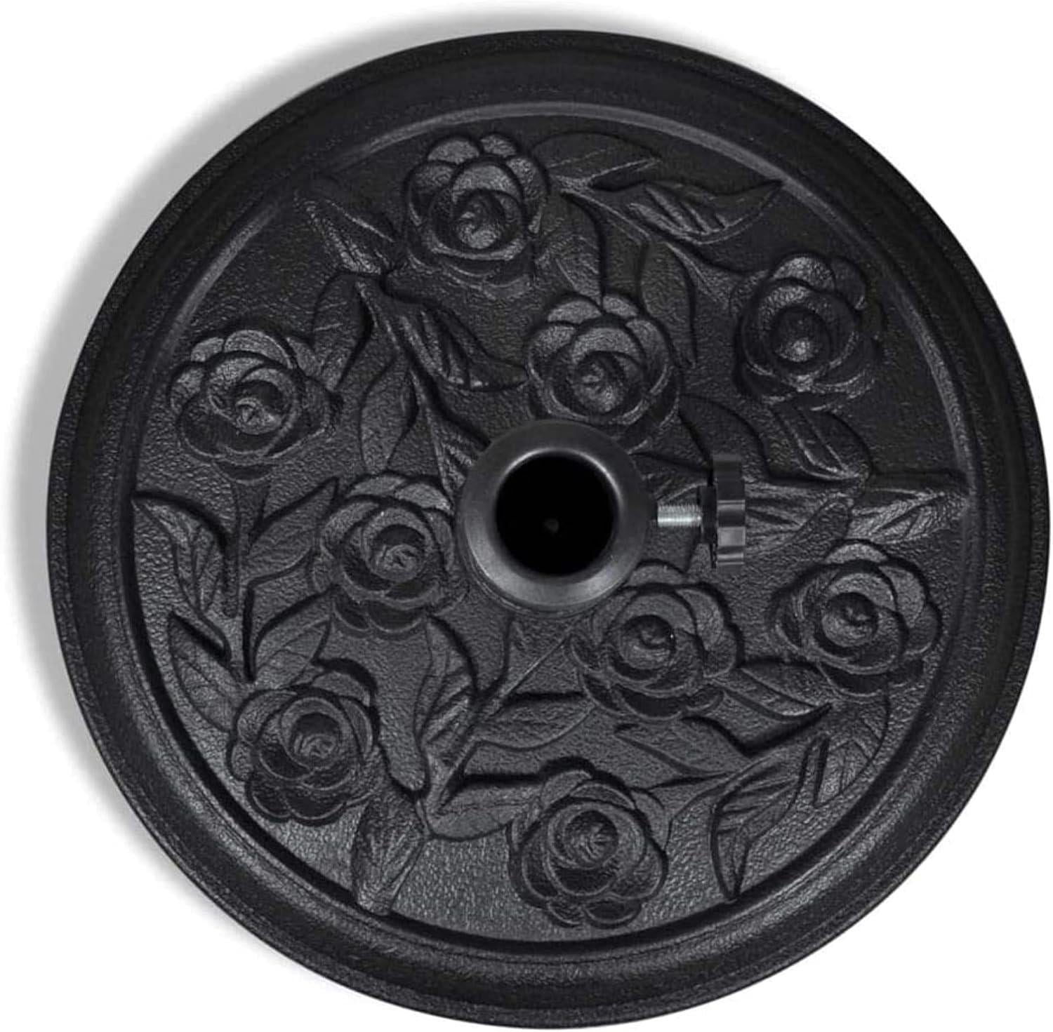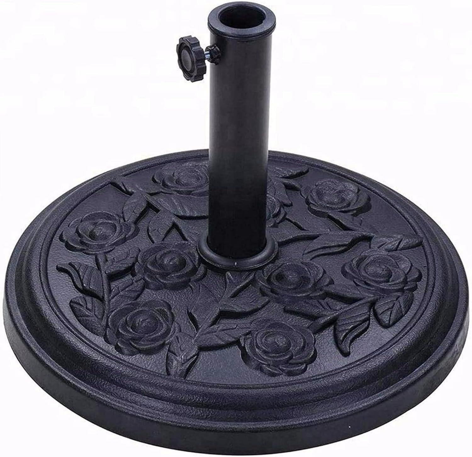 - SPECIFICATION: Material: Polyresin Colour: Black Overall Dimension: 43x43x33cm Gross Weight: 8Kg approx Suitable for Table Umbrella with 38mm or smaller size pole Capacity: can uphold up to 25kg umbrella in all weather conditions