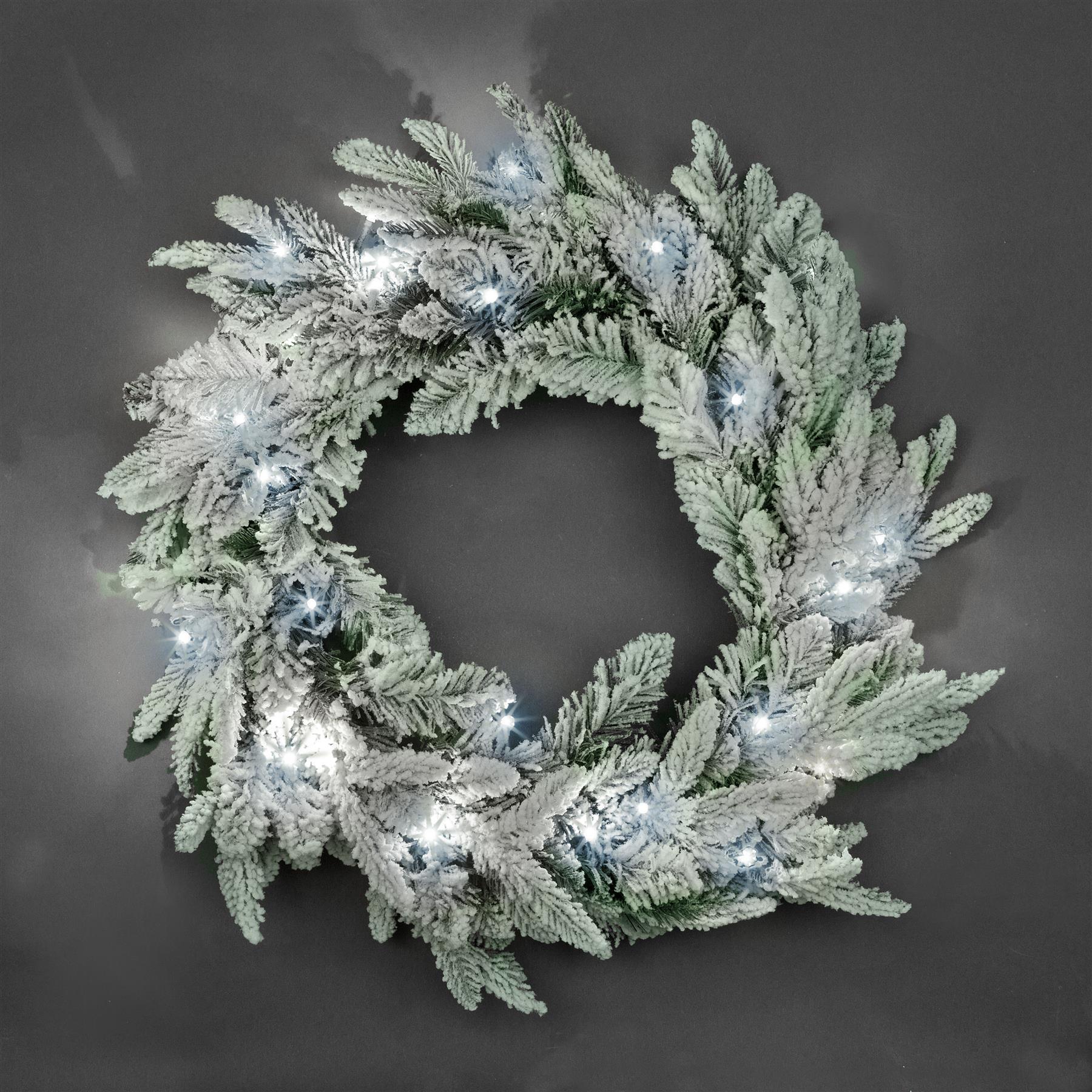 Pre-Lit White LED Lapland Fir Snow Flocked Wreath 55cm
