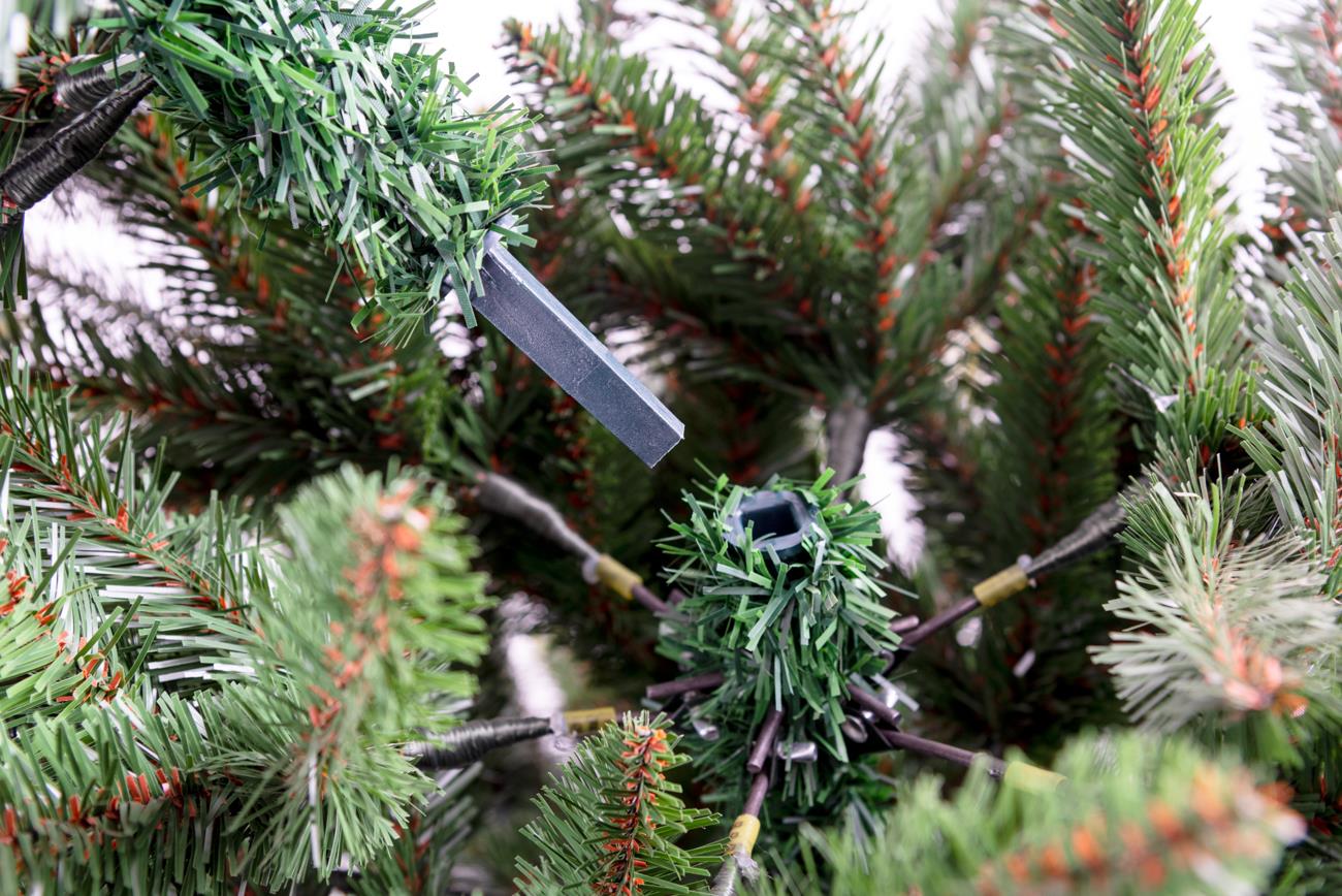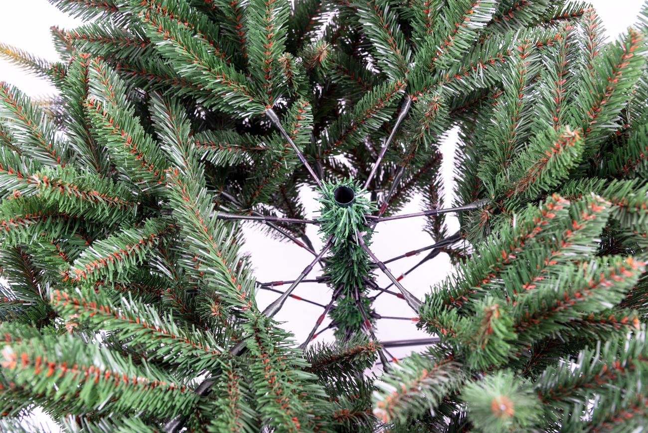 - With 1034 Fire Retardant tips made from 100% Virgin PVC, a sturdy metal base, and floor protective caps, this tree offers good value for your money. The tree is disassembled into 3 sections to allow for easy assembling, dismantling, and storing.