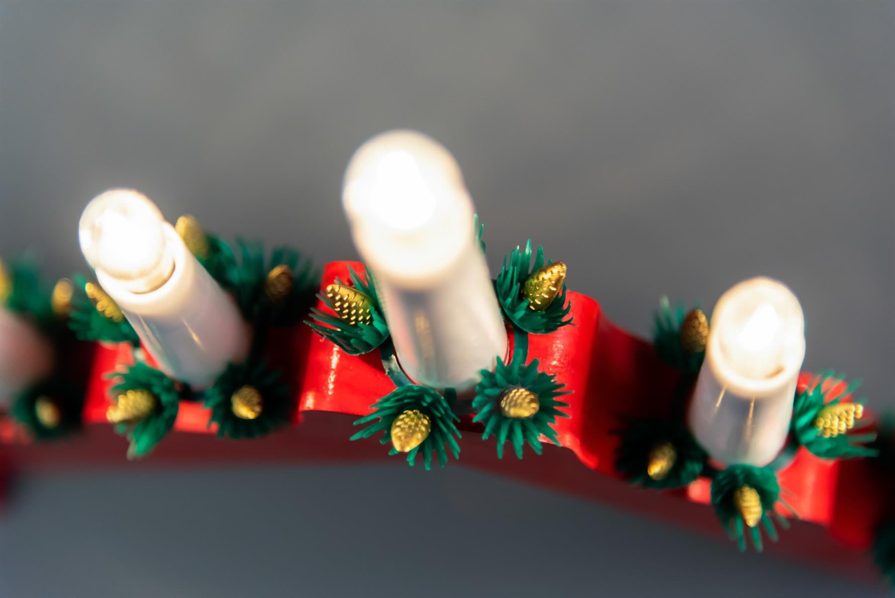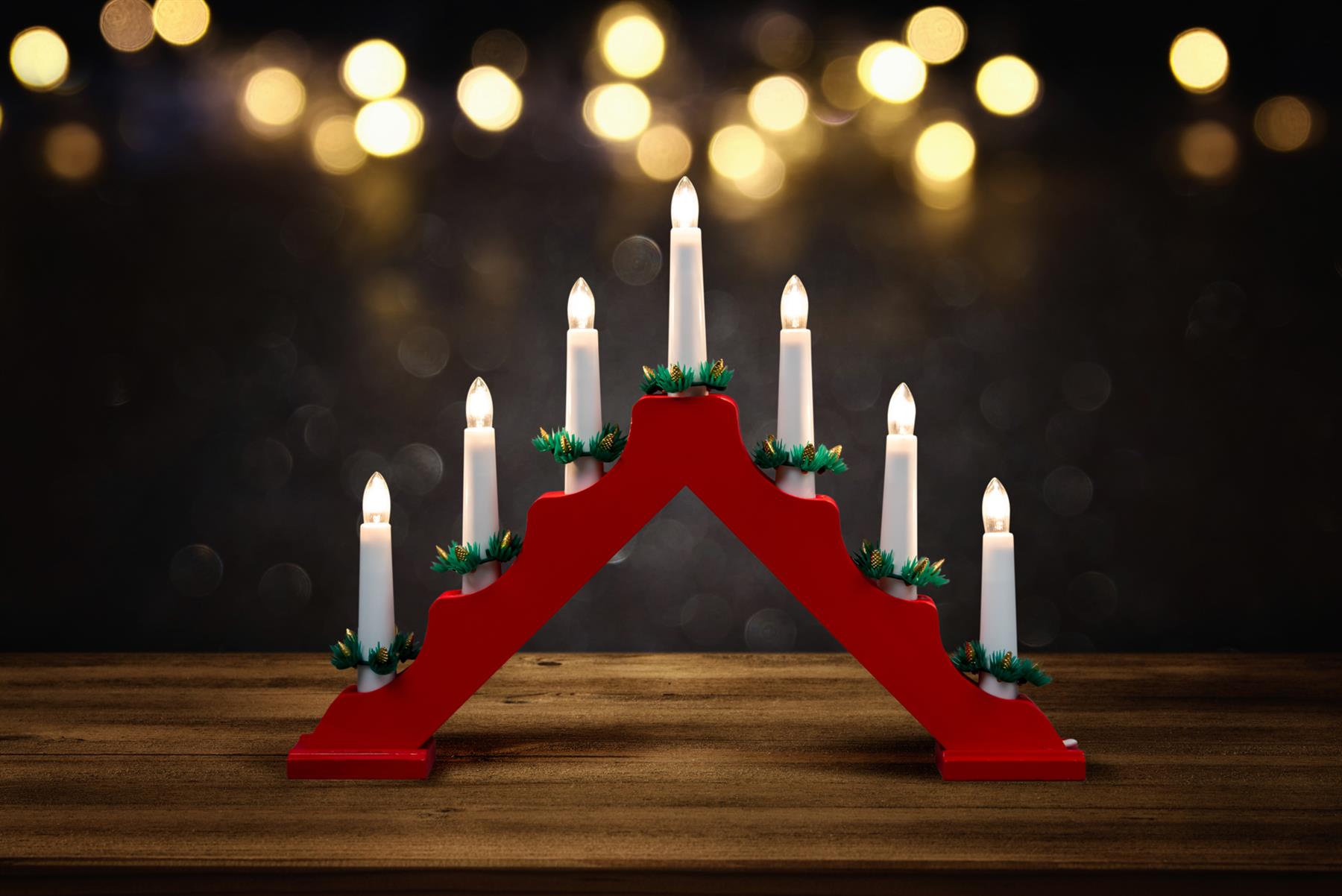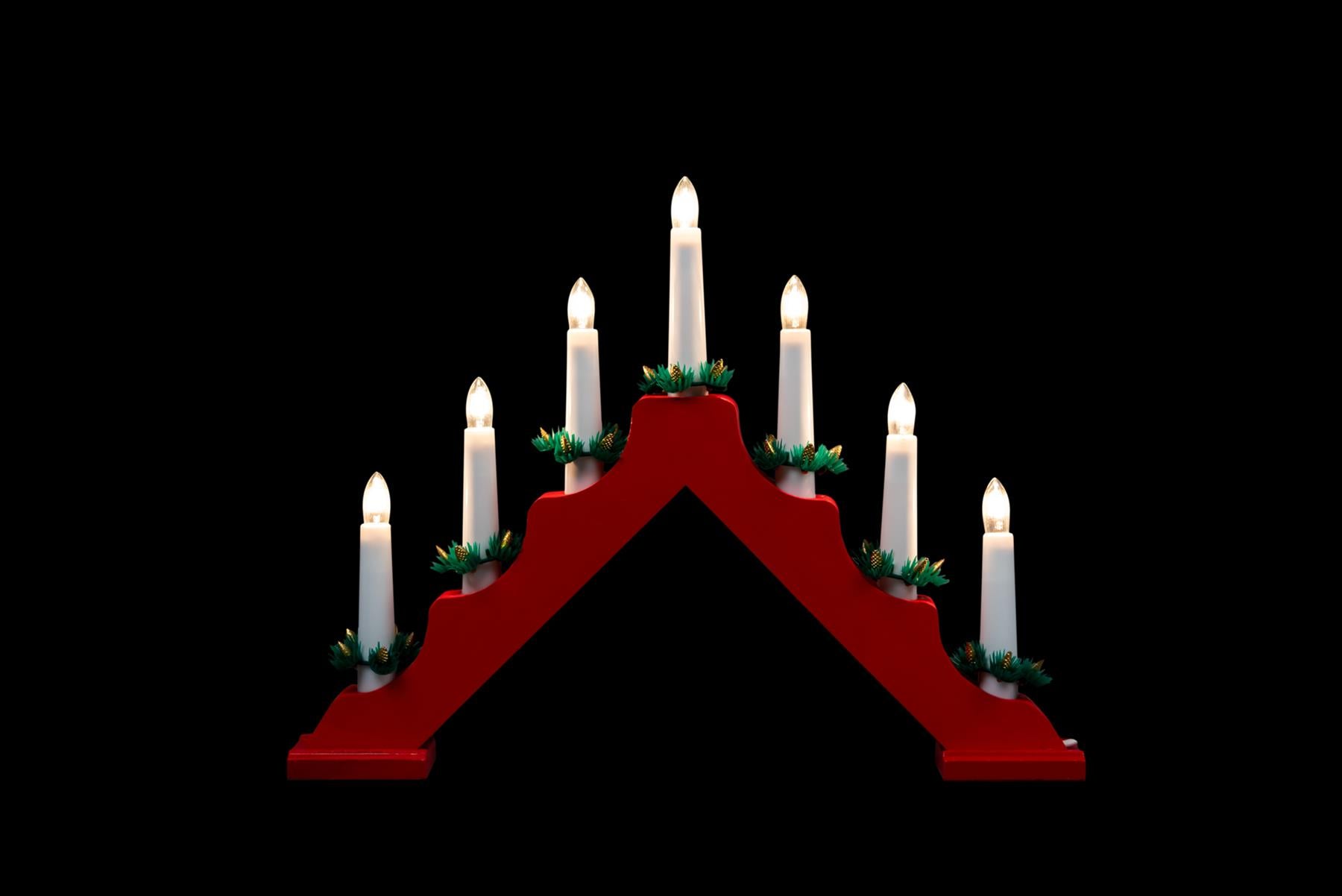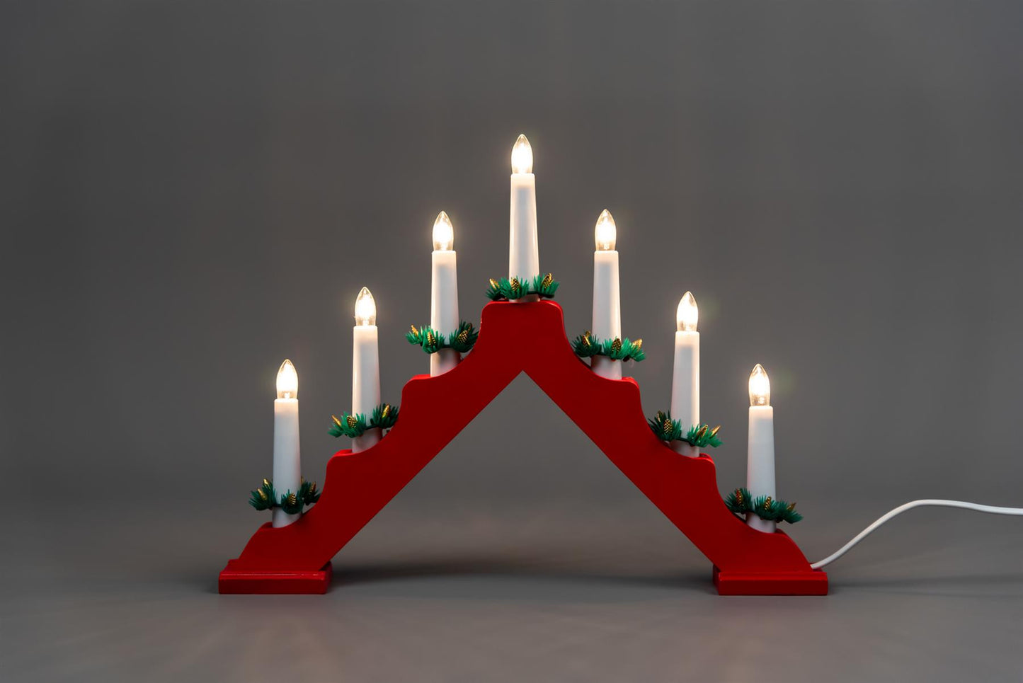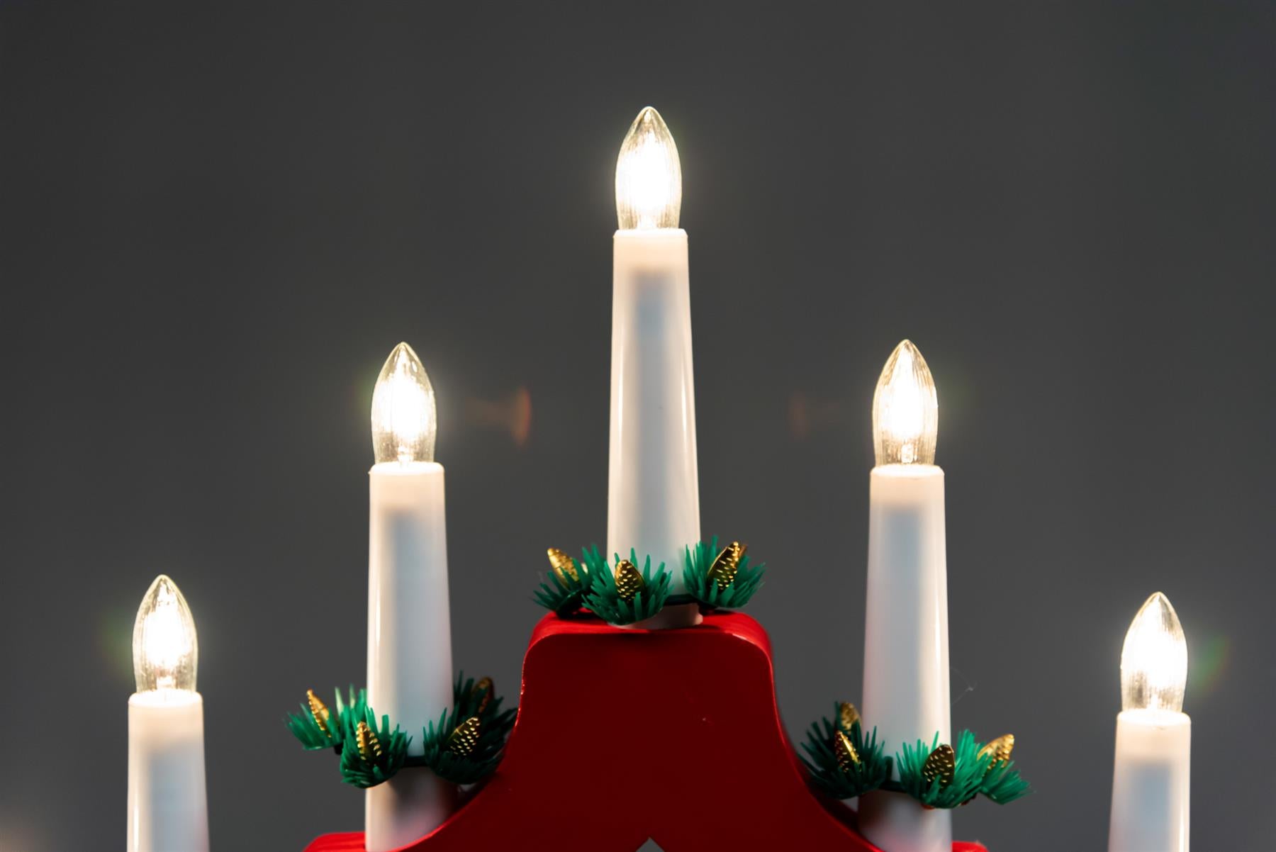 - This is a beautiful example with 7 candles with a small green pine effect with golden miniature pine cones around the base.